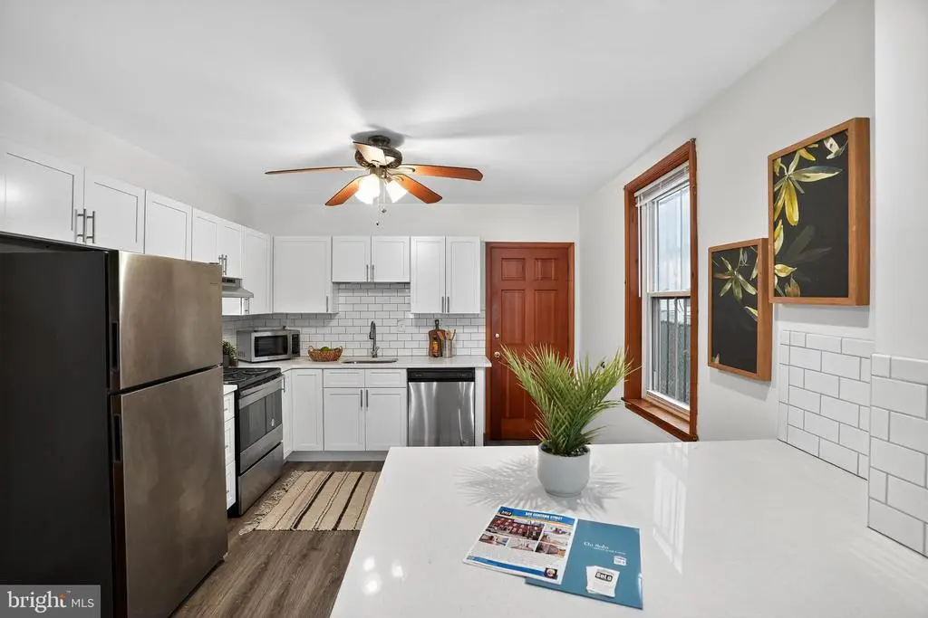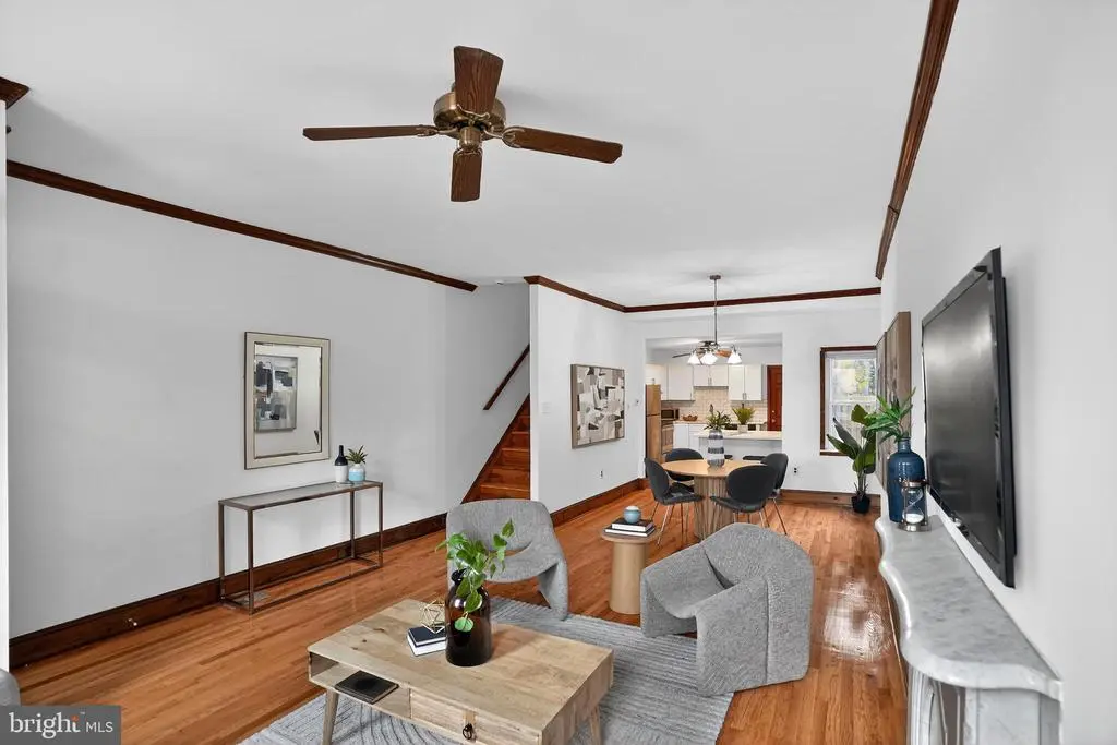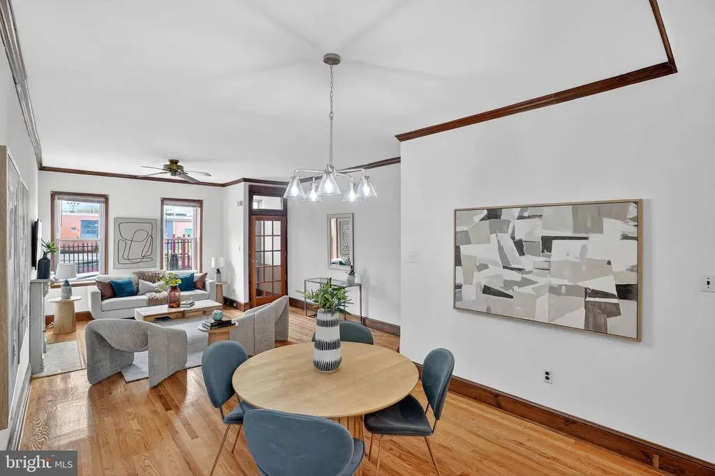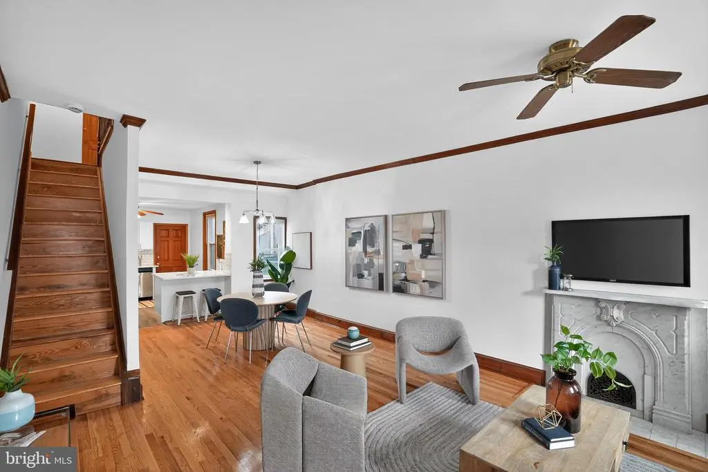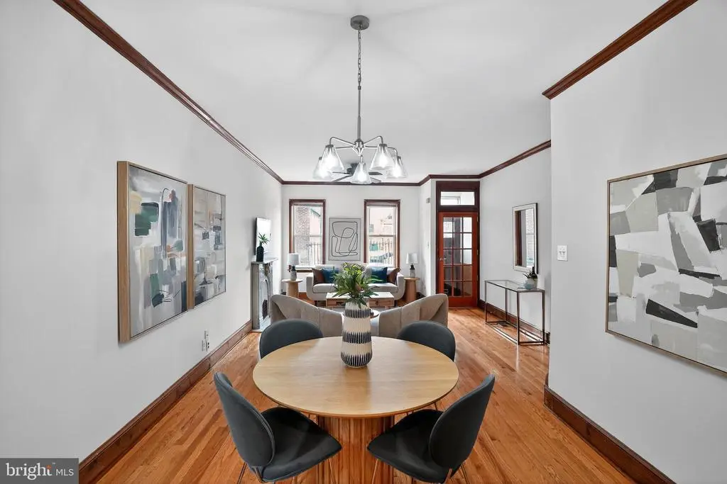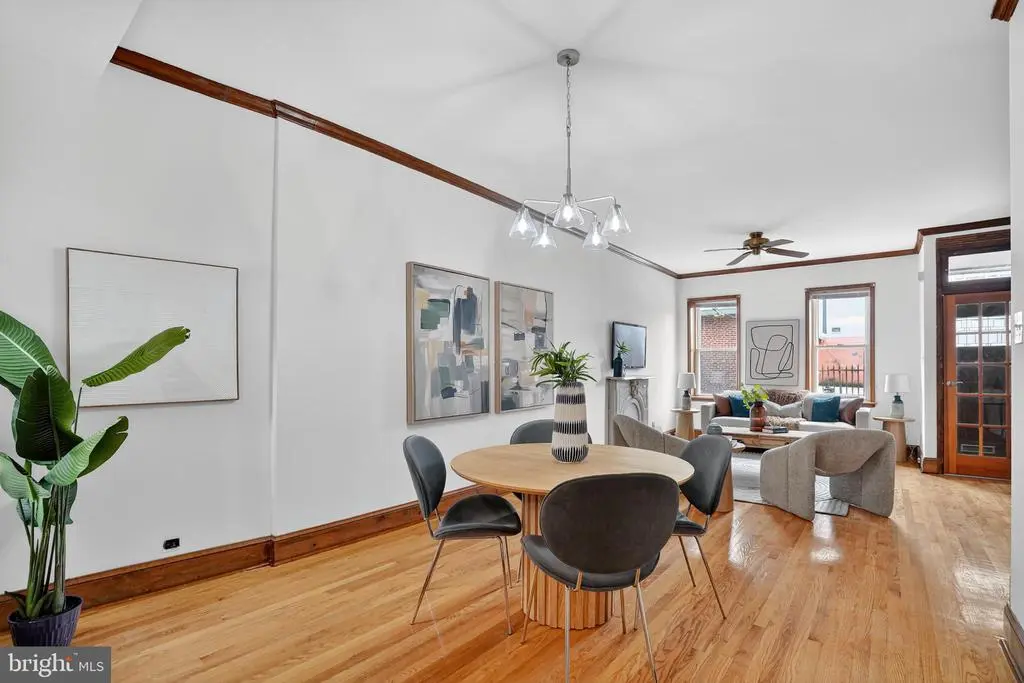 The two story townhouse, in move in condition, is located in the historic Francisville/Fairmount area of Philadelphia. Enter into a vestibule and then into an open Living Room with ornamental marble fireplace and ceiling fan. Dining room with chandelier and both Living Room and Dining Room have solid oak floors and crown molding. The Living room/Dining room is visually open to the Kitchen with a breakfast bar, stainless steel appliances, quartz countertops, ceiling fan and subway tile back splash. Through the kitchen is another room that has a pantry closet, laundry facilities and a separate Powder Room. This room leads to the back patio with privacy fencing. The 2nd Floor has three Bedrooms, with laminate floors and ceiling fans. There is a hall tiled Bath, cedar coat closet and, a full linen closet. Also on the 2nd floor, is a larger cedar closet with shelving.. Full basement with plenty of storage. High Efficiency HVAC system replaced in 2021- forced air with central air. The house faces a park, community center and pool. Walking distance to the historic Eastern State Penitentiary, the Art Museum and Fairmount Ave. restaurants, shops and accessible public transportation.