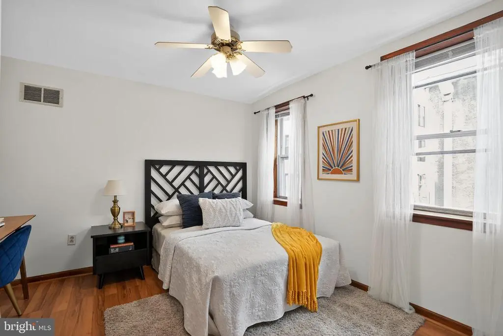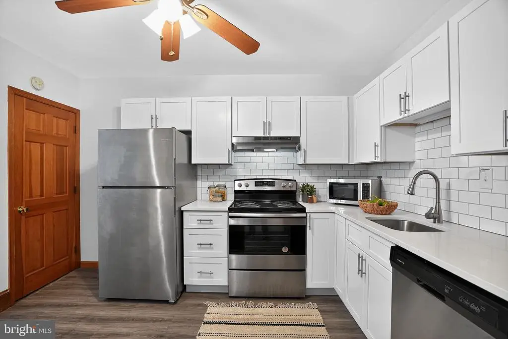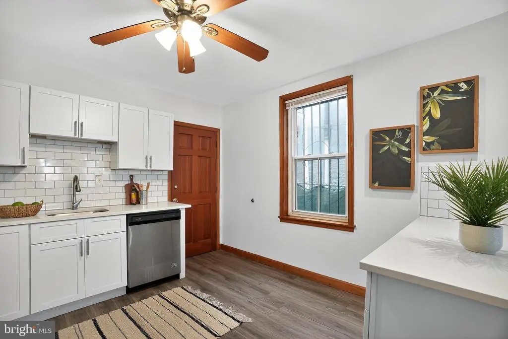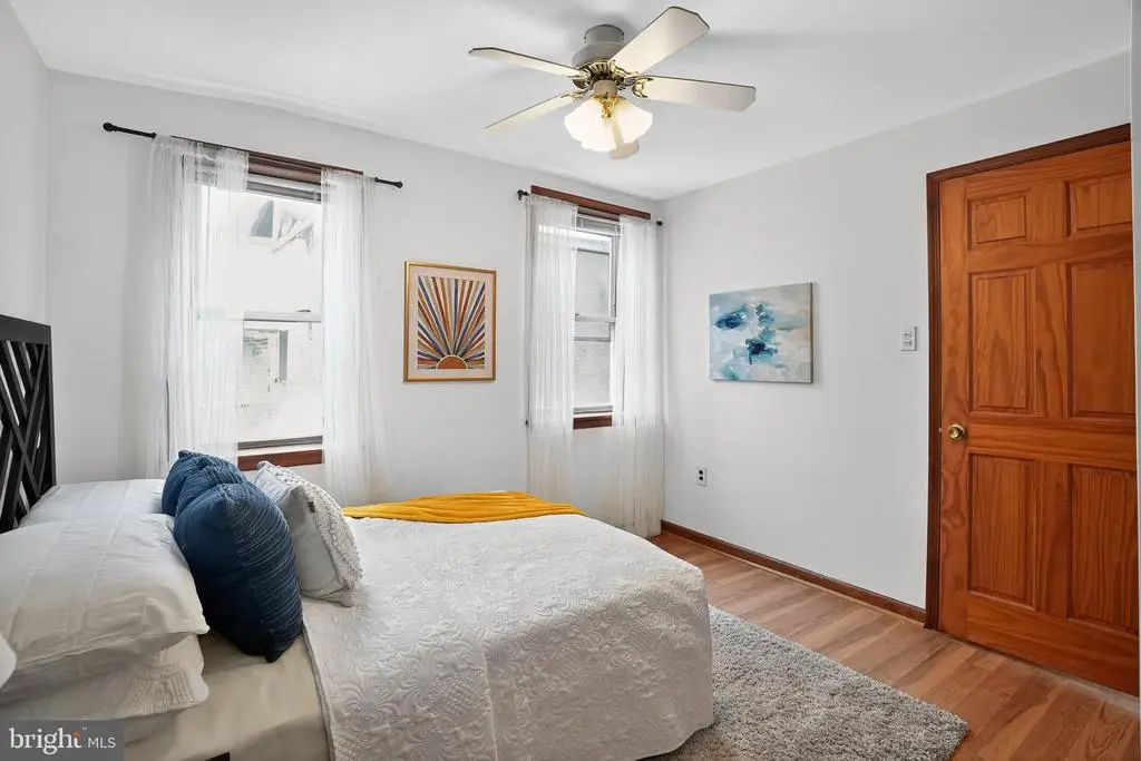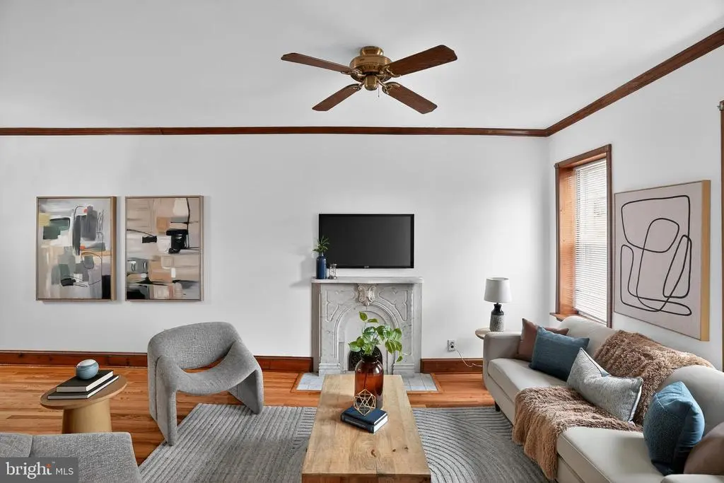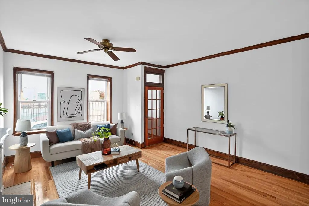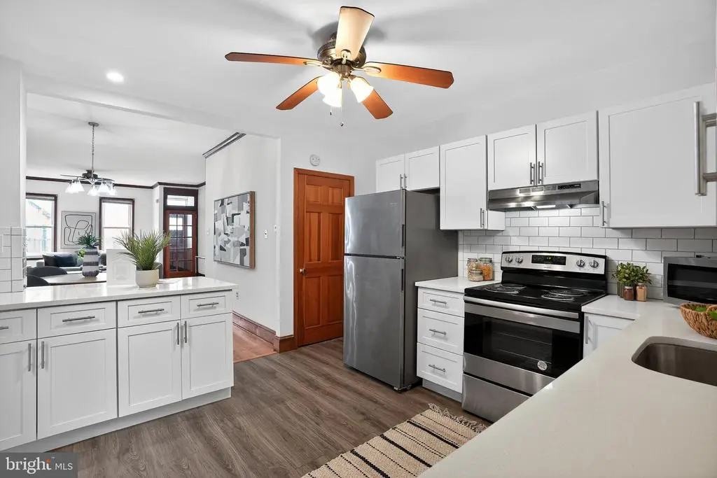 The two story townhouse, in move in condition, is located in the historic Francisville/Fairmount area of Philadelphia. Enter into a vestibule and then into an open Living Room with ornamental marble fireplace and ceiling fan. Dining room with chandelier and both Living Room and Dining Room have solid oak floors and crown molding. The Living room/Dining room is visually open to the Kitchen with a breakfast bar, stainless steel appliances, quartz countertops, ceiling fan and subway tile back splash. Through the kitchen is another room that has a pantry closet, laundry facilities and a separate Powder Room. This room leads to the back patio with privacy fencing. The 2nd Floor has three Bedrooms, with laminate floors and ceiling fans. There is a hall tiled Bath, cedar coat closet and, a full linen closet. Also on the 2nd floor, is a larger cedar closet with shelving.. Full basement with plenty of storage. High Efficiency HVAC system replaced in 2021- forced air with central air. The house faces a park, community center and pool. Walking distance to the historic Eastern State Penitentiary, the Art Museum and Fairmount Ave. restaurants, shops and accessible public transportation.