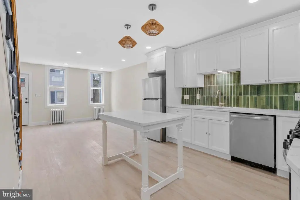 Newly renovated with luxury finishes throughout, 2001 S Mildred St is a semi-detached, 2-story home offering 2 bedrooms, 1.5 bathrooms, a private patio, and a prime East Passyunk location. A quiet, low-traffic block leads to the freshly painted brick exterior. Stepping inside, you'll immediately notice the bright, open, and airy feel of the main level, aided by high ceilings and modern floors. Tall windows pour natural light into the living room, where there's plenty of space for hanging out and entertaining. The highlight of the home is surely the gleaming kitchen, boasting white inset cabinetry, quartz counters, stainless steel appliances, including a dishwasher, and a distinctive green tile backsplash. At the center is an island with seating and pendant lights overhead. Off the kitchen are a convenient powder room and the laundry. Out back, the quiet patio is the perfect spot for summer barbeques and al fresco dining. Up on the second level, there's a large, sunlit primary bedroom with a ceiling fan and two closets at the front. Another spacious bedroom and a full bathroom with modern tile are down the hall. Completing the home is an expansive basement with tons of extra storage space. Not only is 2001 S Mildred St a fantastic home, but its equally fantastic location earns a Walk Score of 95! Just around the corner, the Bok Building is an old school turned community workplace hosting diverse small businesses, including a preschool, a dog daycare, art galleries, non-profits, eateries, and a rooftop lounge. A few blocks west, vibrant East Passyunk Ave is lined with top restaurants, friendly shops, and lively entertainment. Stores like Target, ACME, Lowe's, and IKEA are nearby off of Snyder Ave, plus there's easy access to public transit, Broad St, the Sports Complex, I-95, and South Jersey. Schedule your tour today!