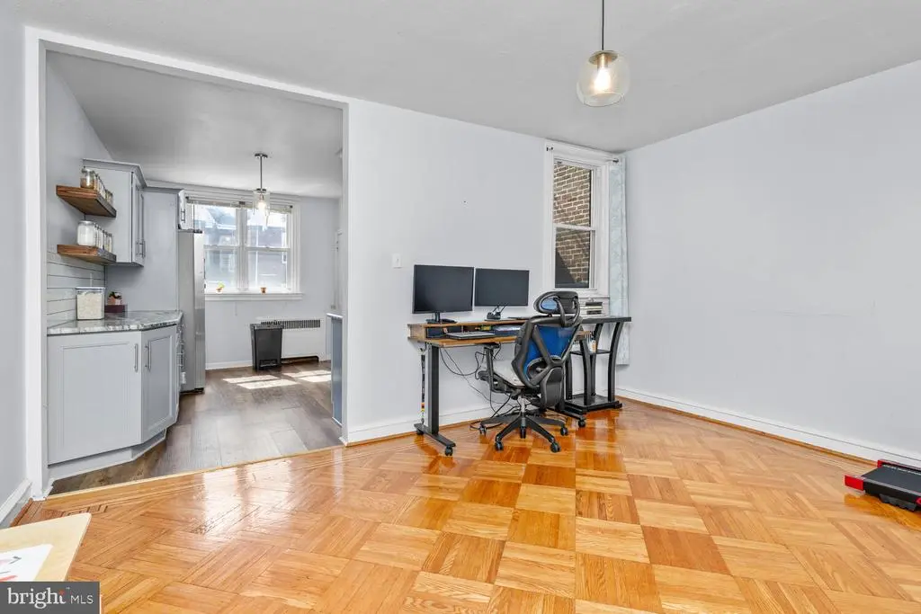 Welcome to this bright and spacious 3-bedroom, 2-bathroom home with a beautiful stone exterior, nestled on a quiet street in East Mount Airy. Spanning 1466 square feet, this property offers an open feel and airy rooms, with well preserved wood floors throughout. The kitchen flows easily to the large dining room, which is in turn open to the broad living room. The kitchen has granite countertops, plenty of storage, and stainless steel appliances. The second floor boasts large bedrooms with good light and excellent closet space. The upstairs bathroom conveniently has a separate bathtub and tiled standup shower, plus a . The finished basement, complete with a full bath, provides versatile space that can be transformed into a workout area, media room, second living room, or home office. Outside, you'll find convenient off street parking in front of or inside of a 1-car garage (currently used as the gym). This move-in ready home combines charm with modern living in the Northwest, one of Philly’s most desirable areas with easy access to parks, cafes, shops, and public transit.