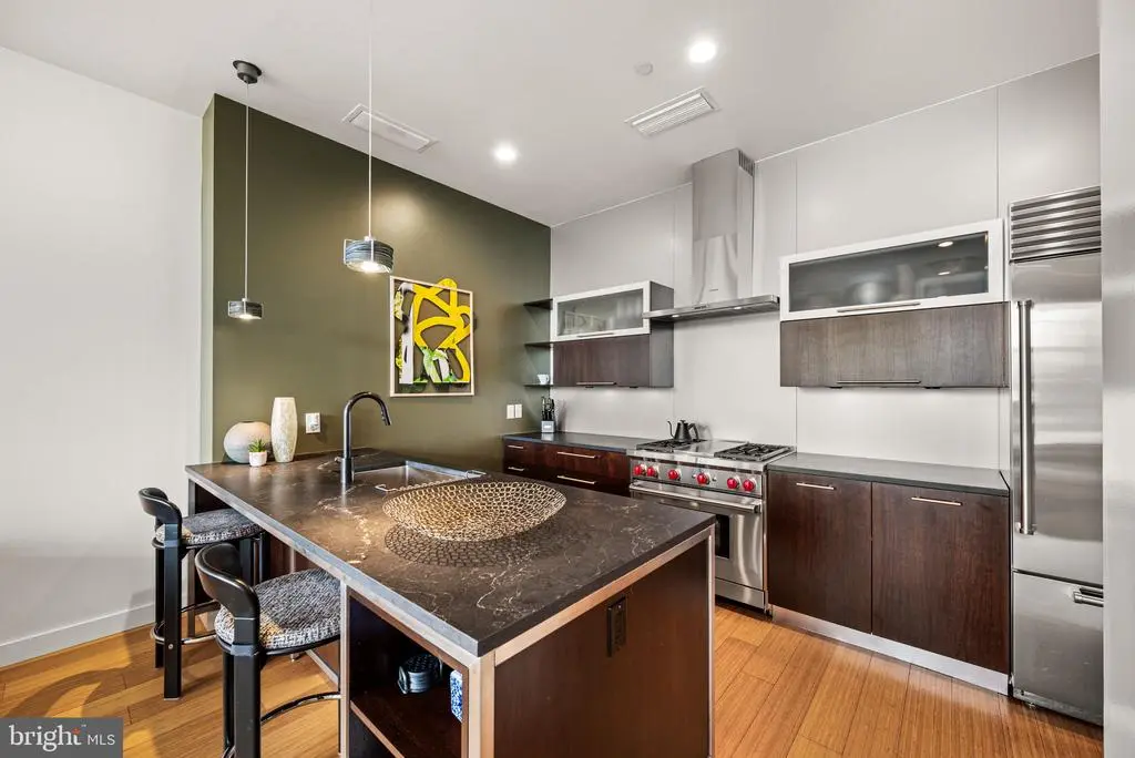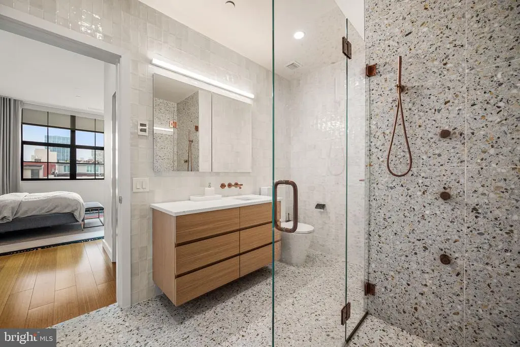 Welcome to 108 Arch Street #504, a stunning two-bedroom, two-bathroom condominium offering luxury living in one of Philadelphia’s premier boutique buildings in the heart of Old City. This impressive home boasts high-quality custom finishes, outdoor living space and on-site gated PARKING. Enter through the concierge-staffed lobby, or the secure parking area, and ride one of two high-speed elevators to your private wing—shared with only one other unit. Your front door is conveniently located just steps from the elevator. Step inside and you’ll immediately notice the modern bamboo floors and luxurious design elements bringing warmth and sophistication to this elevated living space. The expansive main living area is flooded with natural light from floor-to-ceiling windows complete with custom motorized solar shades and soaring 10-foot ceilings. A striking gas fireplace serves as the centerpiece of the room, seamlessly integrated into a contemporary built-in wall unit featuring matte black textured tile and a sleek panel that discreetly hides electronics. The chef’s kitchen is equipped with professional-grade appliances (Viking gas range, Fisher & Paykel dual-drawer dishwasher, and Sub-Zero refrigerator), a peninsula island with bar seating and a large pantry. From the living room, step out onto your private terrace, where you can enjoy breathtaking views of Old City. The spacious primary bedroom offers a walk-in closet, blackout curtains and motorized shades, plus a completely remodeled en-suite bath featuring a floating vanity and a frameless walk-in shower with terrazzo tile. A second bedroom, currently serving as a sitting room, is tucked away on the opposite side of the home for optimal privacy. The beautifully remodeled guest bathroom features intricate mosaic tile, a floating wood vanity and a walk-in shower. A dedicated laundry/utility room completes the thoughtful layout. This pet-friendly residence is just a short walk to historic landmarks such as Independence Hall and Elfreth’s Alley, as well as amazing art galleries, boutiques, coffee shops and restaurants. Schedule your showing today!
