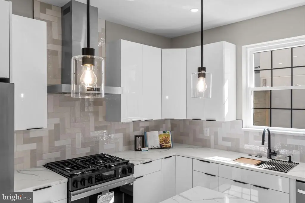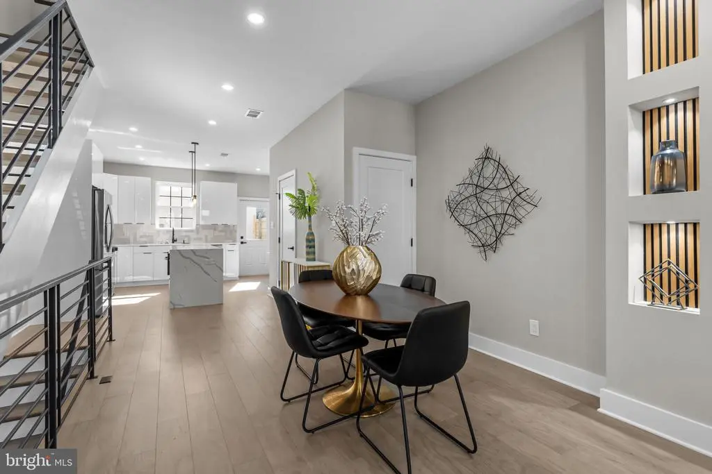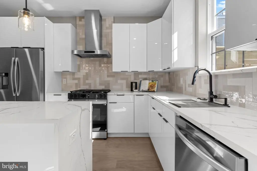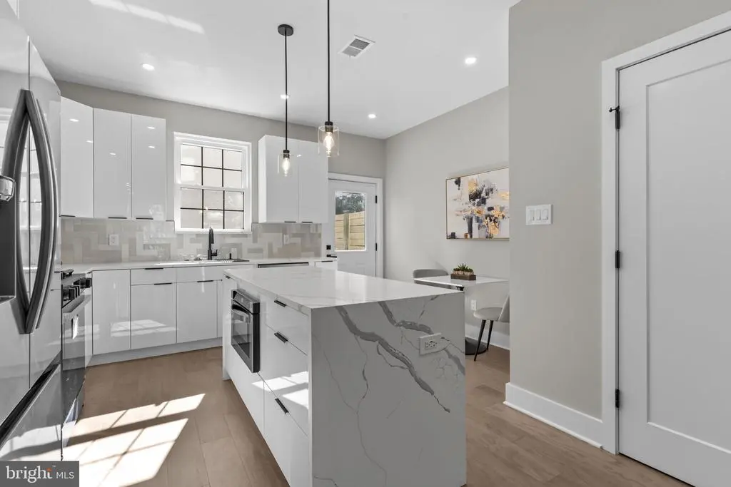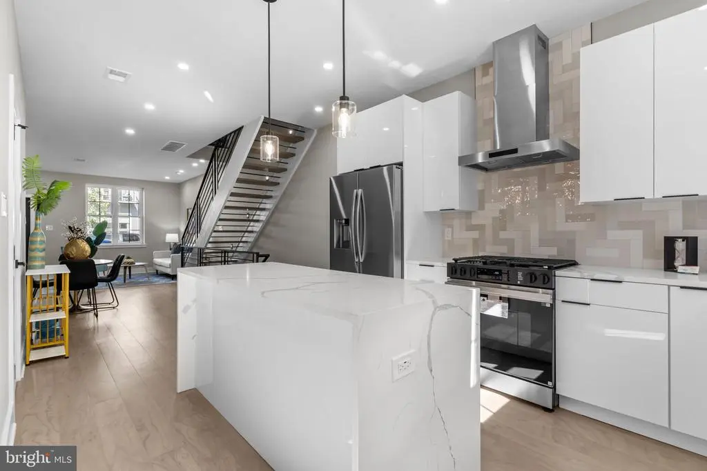 Welcome to 1321 N 2nd Street, a fully gutted, like-new construction brick-front masterpiece in the heart of Olde Kensington. This four-bedroom, two-and-a-half-bath home has been expanded with an additional level of living space, a full roof deck with 360-degree views of Center City Philadelphia, and luxury finishes throughout. The main level boasts 9’ ceilings, recessed lighting, and hardwood-style flooring flowing through a spacious family room with a custom accent wall and electric fireplace. A dedicated dining area leads into the chef’s kitchen, where sleek 36” white cabinetry pairs with a calacatta quartz waterfall island, high-end appliances, a motorized microwave, custom backsplash, chimney hood, matte black hardware, and statement pendant lighting. A half bath with touch-screen mirror and access to a massive backyard designed for entertaining complete this level. Custom open-riser stairs with night lighting and metal railings lead to the second floor, featuring two generously sized bedrooms, a full bath with a floating double-sink vanity, and a laundry room with built-in cabinetry. The third floor offers a full additional bedroom plus a private primary retreat highlighted by a custom trim accent wall, custom closets, and a spa-like bathroom with soaking tub, wet bed area, and oversized rain shower. This level also includes a stunning wet bar with a calacatta quartz waterfall counter, custom sink and shelving, and a built-in mini fridge—perfect for entertaining before heading upstairs. Continue upward to the roof deck, where you’ll enjoy breathtaking 360-degree views of Center City Philadelphia. A fully finished basement adds even more versatile living space, ideal for a home office, gym, or media room. This property truly has it all—modern design, thoughtful upgrades, and an unbeatable location. Make your appointment today—1321 N 2nd Street will not last!