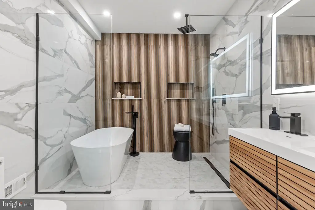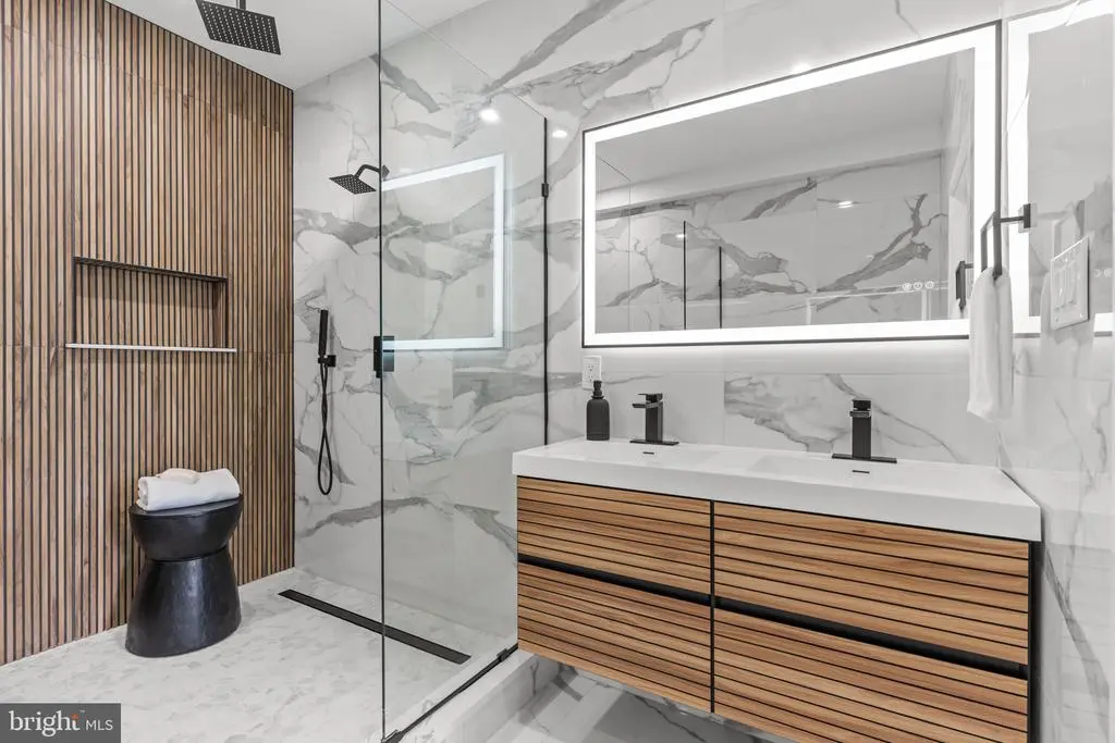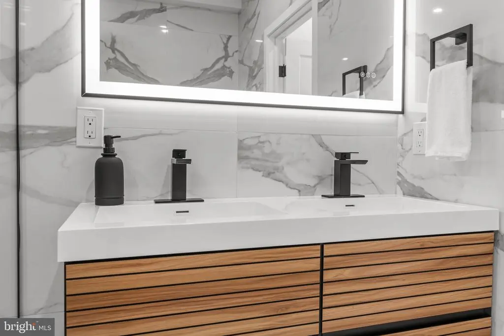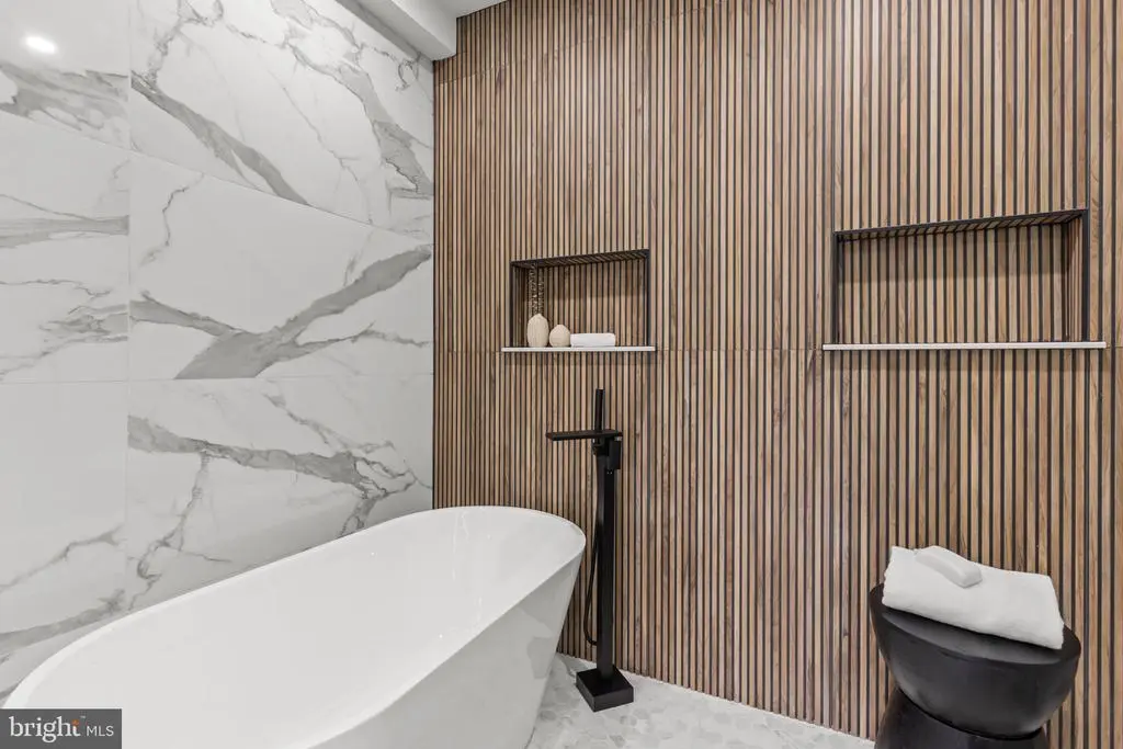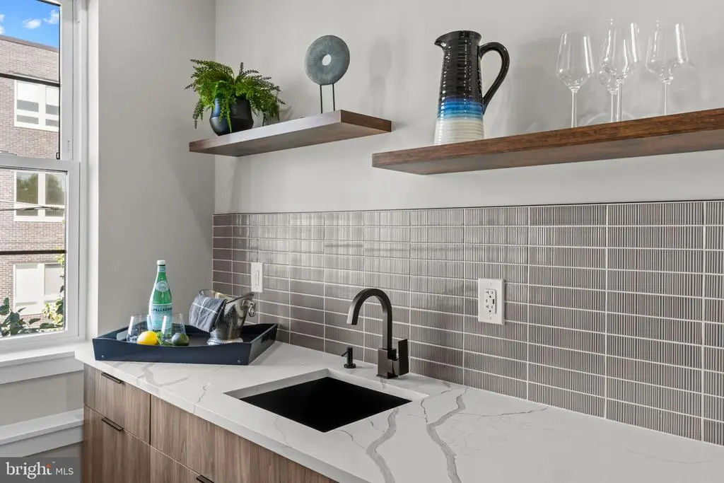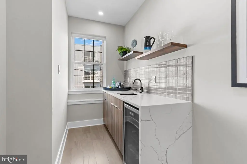 Welcome to 1321 N 2nd Street, a fully gutted, like-new construction brick-front masterpiece in the heart of Olde Kensington. This four-bedroom, two-and-a-half-bath home has been expanded with an additional level of living space, a full roof deck with 360-degree views of Center City Philadelphia, and luxury finishes throughout. The main level boasts 9’ ceilings, recessed lighting, and hardwood-style flooring flowing through a spacious family room with a custom accent wall and electric fireplace. A dedicated dining area leads into the chef’s kitchen, where sleek 36” white cabinetry pairs with a calacatta quartz waterfall island, high-end appliances, a motorized microwave, custom backsplash, chimney hood, matte black hardware, and statement pendant lighting. A half bath with touch-screen mirror and access to a massive backyard designed for entertaining complete this level. Custom open-riser stairs with night lighting and metal railings lead to the second floor, featuring two generously sized bedrooms, a full bath with a floating double-sink vanity, and a laundry room with built-in cabinetry. The third floor offers a full additional bedroom plus a private primary retreat highlighted by a custom trim accent wall, custom closets, and a spa-like bathroom with soaking tub, wet bed area, and oversized rain shower. This level also includes a stunning wet bar with a calacatta quartz waterfall counter, custom sink and shelving, and a built-in mini fridge—perfect for entertaining before heading upstairs. Continue upward to the roof deck, where you’ll enjoy breathtaking 360-degree views of Center City Philadelphia. A fully finished basement adds even more versatile living space, ideal for a home office, gym, or media room. This property truly has it all—modern design, thoughtful upgrades, and an unbeatable location. Make your appointment today—1321 N 2nd Street will not last!