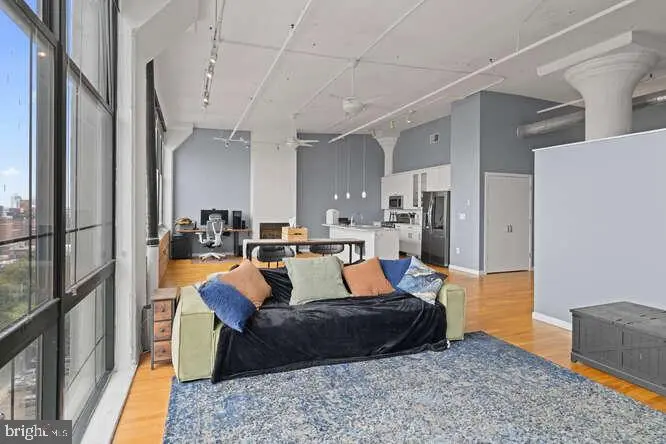 Once a bustling shoe factory, now a sleek modern residence, 314 N 12th St #1004 rises above Philly’s vibrant Callowhill neighborhood as a one-of-a-kind penthouse loft. This 1-bed, 1-bath home is all about spectacular views—soaring ceilings and massive windows flood the space with light while framing jaw-dropping panoramas of the city skyline. Wide-plank hardwoods and exposed brick set the stage for dramatic, open-concept living. Whether you’re lounging by the fireplace or hosting dinner under the glittering city lights, every corner of the main level is designed to impress. The sleek white kitchen, complete with stainless steel appliances, a tile backsplash, and an oversized island, makes entertaining effortless. The elevated bedroom enjoys abundant natural light and double closets, while the spacious bathroom offers a wide vanity, generous storage, and an in-unit laundry closet for convenience. And it doesn’t stop inside—the building’s unbeatable location boasts a Walk Score of 97! Step outside and you’re minutes from Trader Joe’s, Reading Terminal Market, Franklin Square, Love Park, and endless restaurants, shops, and entertainment. With easy access to Center City, Broad St, I-676, I-95, and South Jersey, everything you need is right at your doorstep. Showings begin Thursday, 9/11—come see the city views that will take your breath away!