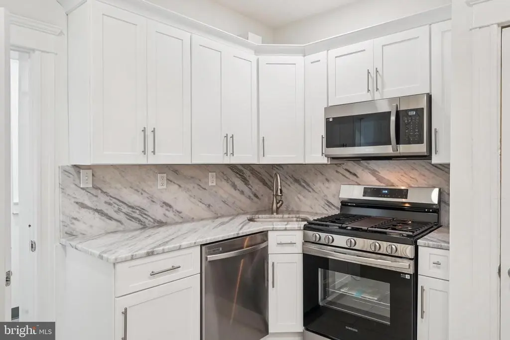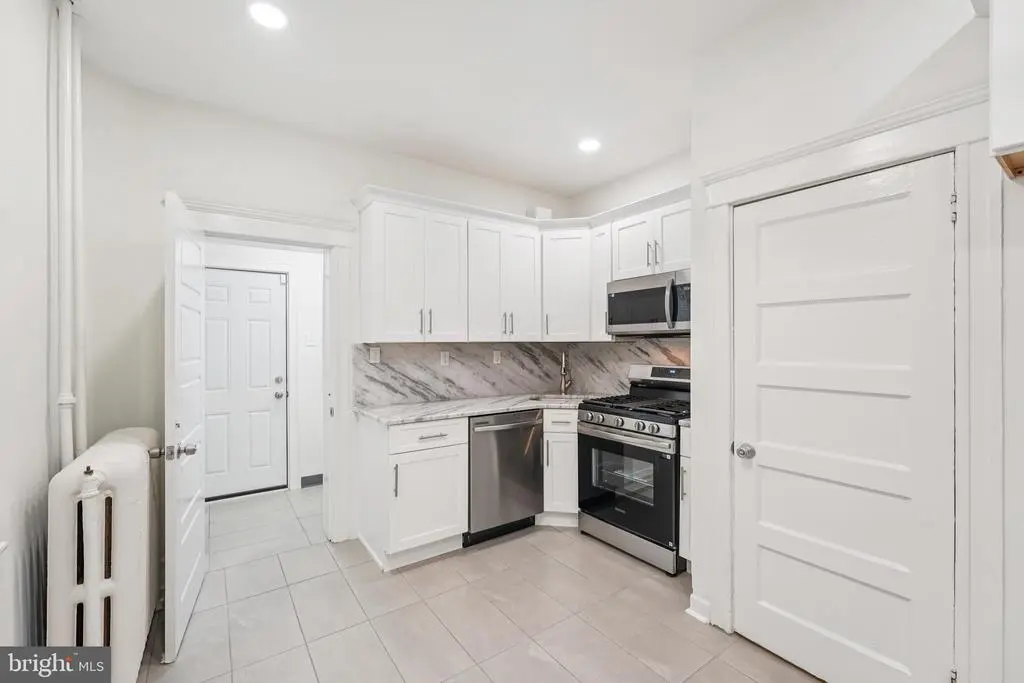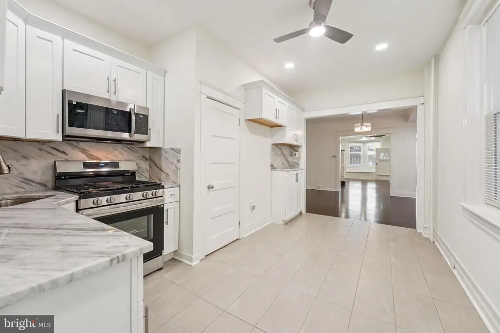 Welcome to this newly renovated four-bedroom, one-and-a-half-bath townhome in the Nicetown-Hunting Park area. As you approach, you’ll notice the open front porch—a perfect spot to relax outdoors. Step inside to a vestibule that leads through a stained-glass door into the spacious living room. Large windows with a built-in sitting area create an ideal reading nook, while a decorative fireplace adds charm and character. Freshly stained hardwood floors flow seamlessly from the living room into the dining room. The open kitchen offers plenty of space for a dining table or a center island. It features brand-new appliances, including a stove, microwave, dishwasher and a refrigerator. At the rear of the kitchen, you’ll find a convenient half bath and a storage area for extra appliances or pantry needs. Up the newly stained staircase, a full bathroom awaits with a deep soaking tub and recessed lighting. Toward the back, a generously sized bedroom that can serve as a primary suite or a cozy den. To the left of the bathroom, you’ll find two additional bedrooms, including a front-facing room with large windows and a spacious closet. Each bedroom is equipped with its own ceiling fan. The home also offers a full basement—clean, versatile, and ready to be used as a recreation area, home gym, or additional storage space. The basement also includes laundry hookups for a washer and dryer, along with a convenient walk-out to the small rear yard—perfect for easy access to outdoor living and entertaining. This move-in-ready property combines modern updates with timeless character—an excellent choice for comfortable city living.