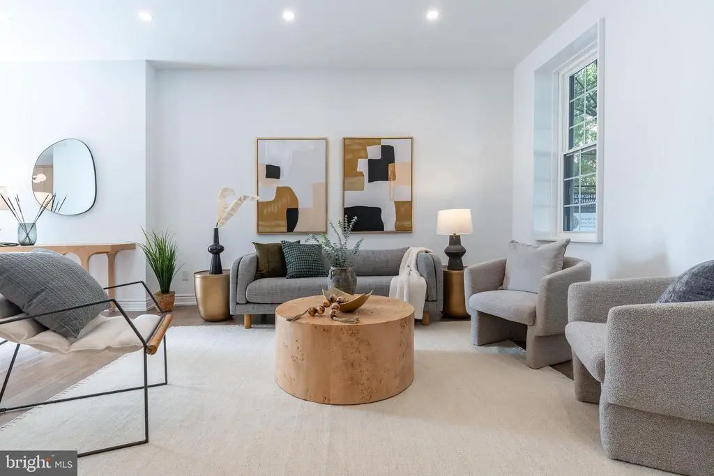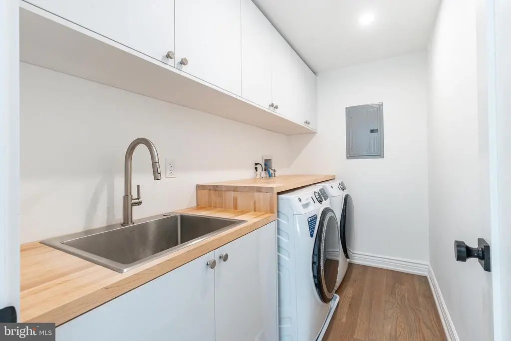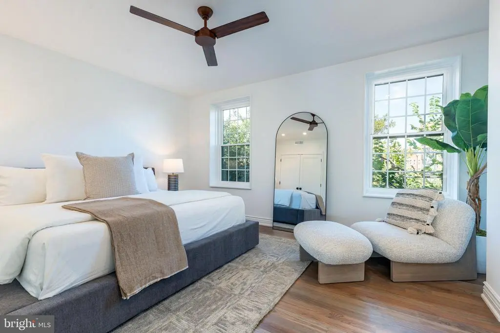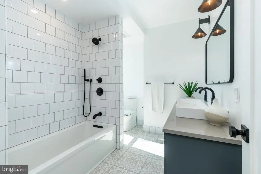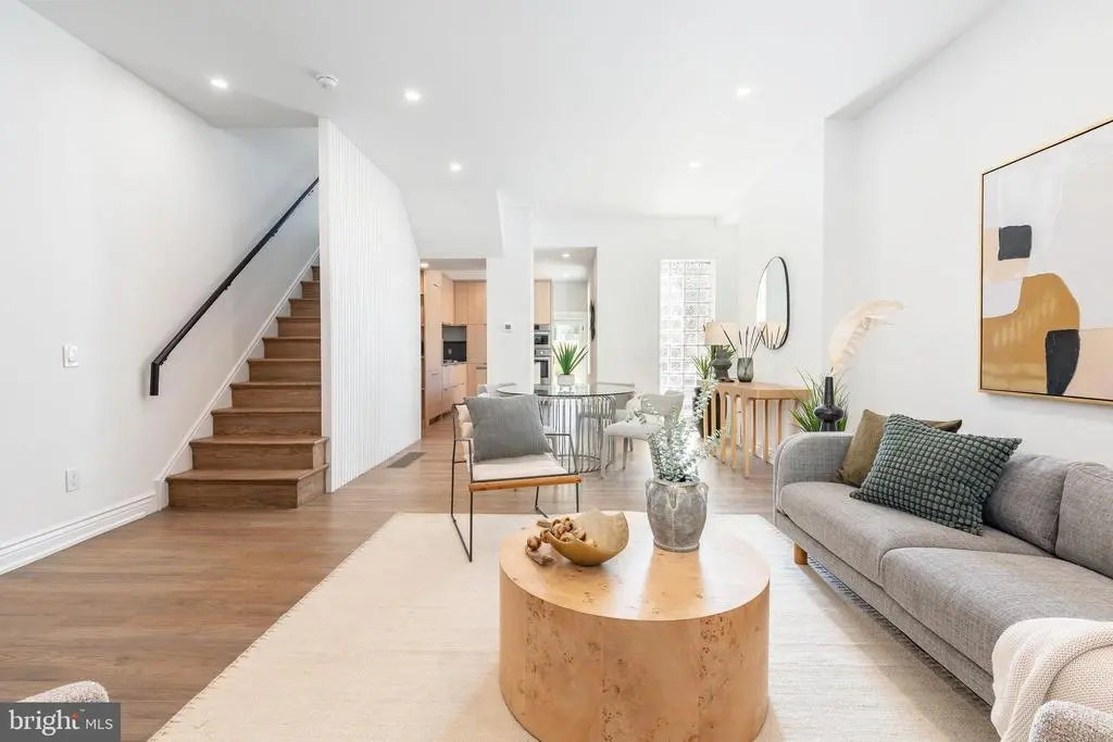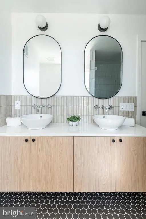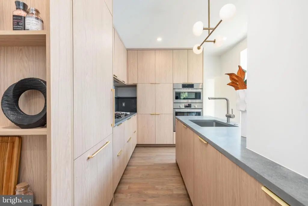 Where Fitler Square converges with Graduate Hospital—steps from 23rd & Bainbridge and about a one-minute stroll to Heirloom Market—2311 Grays Ferry is a three-bedroom, 2.5-bath, 1,900 SF, 18-foot-wide residence fully transformed by an impeccable full-gut renovation and QB3’s warm, modern design. Enter through a custom mahogany front door to a porcelain herringbone-tiled vestibule with tailored built-ins (uppers, bench & cubbies), then into sunlit living/dining spaces with 9′7″ ceilings, cashmere-gray, site-finished red-oak floors, an architectural slat wall, and a vertical glass-block light column. At the center is a custom chef’s kitchen—light-oak cabinetry with brass hardware, Caesarstone slab counters/backsplash, Bosch appliances including a convection wall oven and 5-burner gas cooktop, a panel-ready Blomberg refrigerator/freezer, and an oversized peninsula with a deep undermount sink beneath a sculptural brass/globe pendant—framing a clean sightline to the front windows. A tiled rear landing discreetly serves a chic powder room and opens to a fenced patio for coffee, herbs, and evening grilling. Upstairs, two sun-splashed bedrooms feature deep-set windows and hardwoods; the hall bath blends encaustic-style patterned tile, a white-subway tub/shower with niche, matte-black fixtures (including handheld), and a floating stone-topped vanity. A dedicated laundry room adds uppers, a butcher-block folding counter, deep utility sink, and LG gas washer/dryer. The top-floor primary suite feels boutique with two closets, a ceiling fan, mini-split zoned comfort, and a spa bath with twin vessel sinks, wall-mounted faucets, oval black-rim mirrors, vertical kit-kat tile wainscot, and a walk-in shower finished in vertical white tile over warm-taupe ribbed tile with a charcoal hex-mosaic floor. A finished lower level provides flexible bonus space plus utility/storage. With all-new systems (roof, windows, doors, floors, HVAC, hot water heater) and an approved 10-year tax abatement, this QB3-crafted 1908 row home pairs high design with turnkey convenience—moments from the Schuylkill River Trail and easy South Street Bridge access, walkable to UPenn and Center City, parks, top-rated restaurants, and shopping, with quick connections to CHOP, Drexel, and I-76.