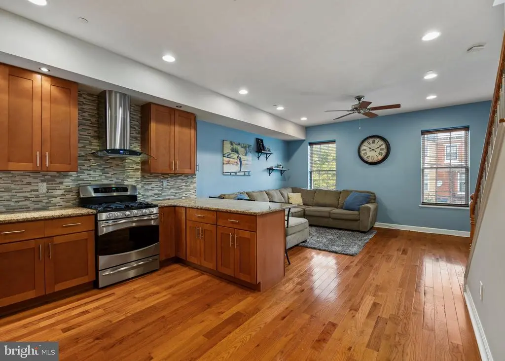 Located in the heart of Graduate Hospital, this 3 Bed, 2 Bath home is a great opportunity for a new owner! Upon entering you will immediately be drawn to the open floor plan. Filled with an abundance of natural light from windows on three sides, the first level features soaring 9’ ceilings, hardwood flooring throughout, ample closet space, and an abundance of recessed lighting. The kitchen features ample cabinetry space, granite counter tops, stainless steel appliances, an overhead range hood, tile backsplash, and a breakfast bar. Adjacent to the kitchen is the family room, which is filled with natural light and provides plenty of space for relaxation or entertainment. Also located on the first level is the oversized third bedroom, which has ample closet space and direct access to the full bathroom. The full bathroom features tiled floors and walls, a single bowl vanity, and a tub/shower combo with a built-in recessed shower box. Up the staircase, the second level features the oversized sized primary bedroom which gives owners an incredible view of the Center City Skyline and has a large walk-in closet. The secondary bedroom is also located on this floor, which is generously sized and also has ample closet space. These two bedrooms are serviced by an oversized hall bathroom, filled with natural light from the window and featuring a tiled floor, a double bowl vanity with widespread faucets, granite vanity top, and a tiled shower with a frameless shower door. Next to the bathroom is the laundry area which has a stackable washer/dryer. Still looking for more!? Accessible from the secondary bedroom, the spacious roof deck has incredible views of the skyline and provides an abundance of space for relaxation, soaking in the sun, and outdoor entertainment. This great opportunity to own a lovingly maintained home won't last long!