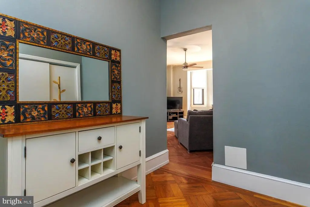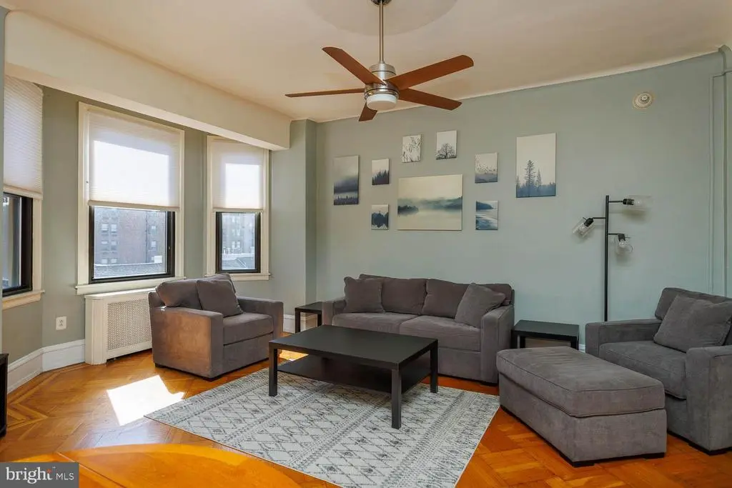 This is a beautifully renovated and maintained corner unit at the Lenox Condominium. This unit is on the southeast corner of the building with great light and views from three bay windows. The kitchen and bathroom have all been completely renovated. The kitchen has custom cabinets, stainless steel appliances and granite counter tops. There is an entry vestibule that provides an elegant introduction to the bedroom on one end and kitchen, living room and dining area on the other. The living room includes an original decorative mantle, ceiling fan, two bay windows and fantastic southern views. The bedroom has two large closets, ceiling fan, another large bay window and a full bathroom. New washer and dryer were installed last year. The association now allows individual owners to install central air conditioning with prior approval by the board, and many owners have installed it. The Lenox Condominium was designed by famed New York architects Clinton and Russell. It was built in 1920 and renovated into condos in 2004-5. The units have large scale rooms, high ceilings, lots of windows and most units have their original architectural elements. It is a Doorman building and is centrally located at the southern end of Mid-town Village in the Washington Square West Neighborhood. It is 2 blocks from the great shops, restaurants, theatres and night life of Midtown Village, Walnut Street and the Avenue of the Arts. It is also just a few blocks from Thomas Jefferson and Pennsylvania Hospitals. There are many public transportation options within a few blocks of the Lenox. The condo fees include a 24/7 door staff, heat, hot water and high-speed internet. The owners pay their own electric and Cable TV. The building offers additional storage for a small fee, and there are many gym options within 2-3 blocks. It is a pet friendly building. There is currently one deeded parking space for sale behind the building in the gated lot.