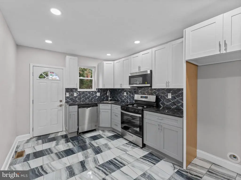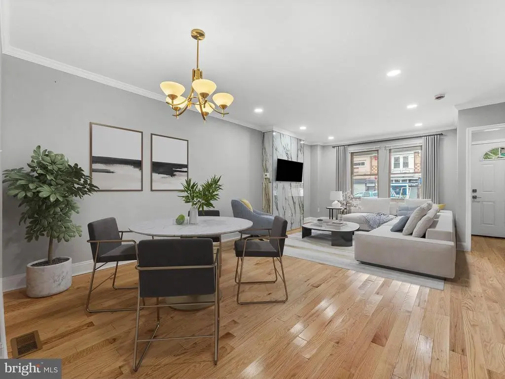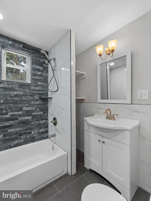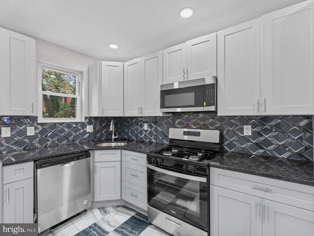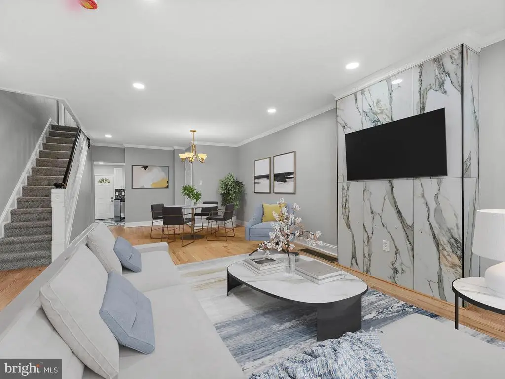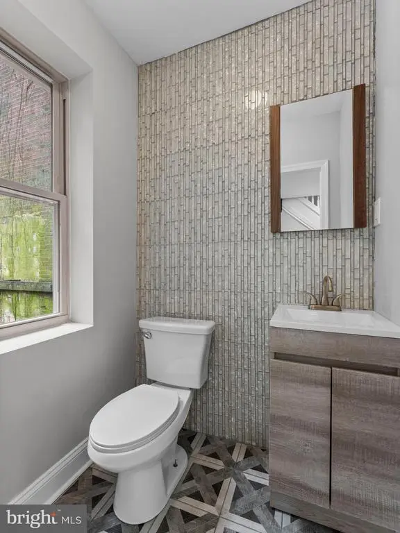 Sophisticated and Cosmopolitan. Urban Living on 4 full levels . Cool color palette greets you with a covered front porch. Enter the first floor with beautiful neutral colored hardwood flooring complete with a stylish marble tile accent wall and crown molding for endless decorating options. Two tone kitchen cabinetry with premium soft close doors/drawers, stainless steel appliance package, and gleaming backsplash are highlighted by efficient recessed lights. Step out back to a large private rear deck and fenced spacious backyard for entertaining. First floor powder room provides convenience. Downstairs you will find a bright and clean basement for man cave options, or additional storage space. There are brand new mechanicals to serve you for may years to come. As you travel upstairs, retire to 4 spacious bedrooms carpeted for coziness and comfort. The full bathroom has been designed with choice color and materials. 3 full levels of living space provides plenty of room for all. All protected by a new roof /with warranty and new windows to provide a cozy and energy efficient home. You desire the best. Come claim it today.