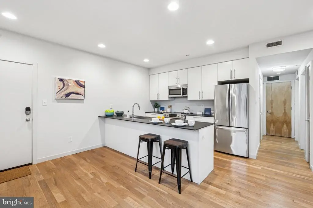 Welcome to this unique 2 bed + 2 bath corner unit in the extraordinary 'ReNewbold' development. One floor spacious living with a great layout and lots of natural light coming from all directions. Custom selections with Bosch appliances, eco conscious recycled paper countertops, and hardwood floors throughout. Enter into this chic corner flat through the open concept kitchen/living space with high ceilings, and oversized windows. Just down the hall you will find a full bathroom, laundry, and one of the two generous sized bedrooms. The primary suite has an en suite bathroom and walk in closet. In the lower level of the building is a private storage room that belongs to this unit. This property is located within walking distance to so many local favorites- The South Philly Tap Room, Ultimo Coffee, Hardena, Miss Rachel's Pantry, Rowhouse Grocery, the South Philly Food Co op, and so much more! Just a few blocks from both the West & East Passyunk dining and shopping scene. Public transportation encompasses a bus route into Center City and the Broad Street Line subway station just a short walk out of the front door. Presented with a lovely new exterior paint job, each home within this development provides a reserved parking space and Tax Abatement. This home was built in 2016 with a focus on being environmentally conscious and completed preparations for LEED Platinum environmental standards making this unit super energy efficient. Some of the features include: triple-pane thick-foam insulation windows throughout the house, and permeable pavers in the driveway/courtyard. Pet friendly Planned Urban Development makes this property easy to finance!