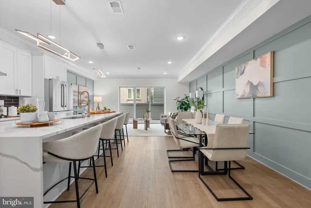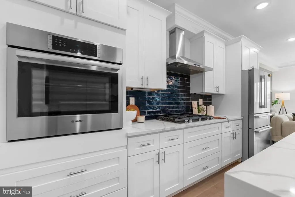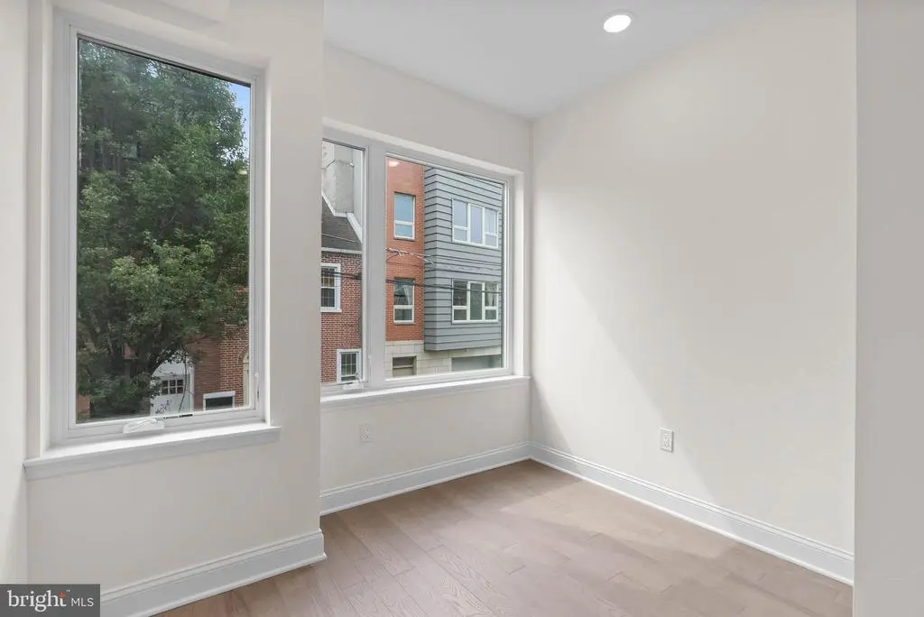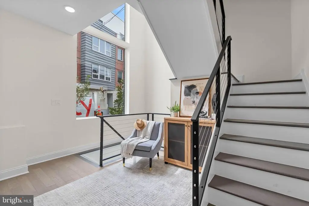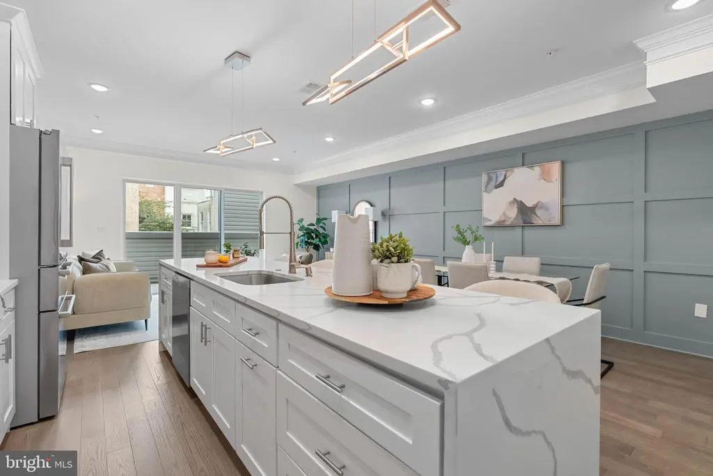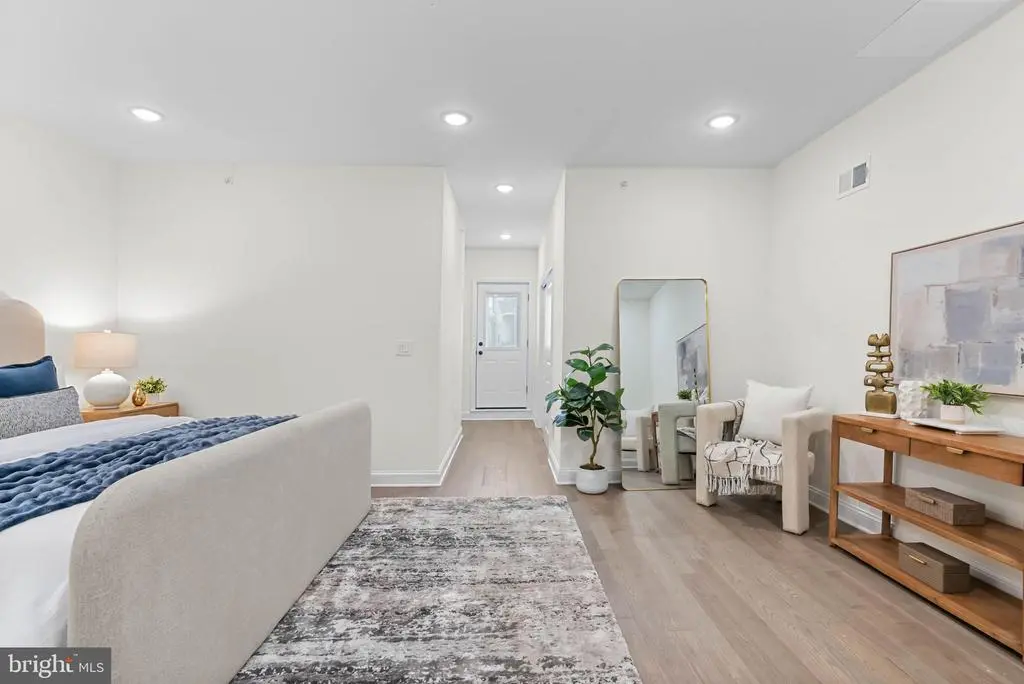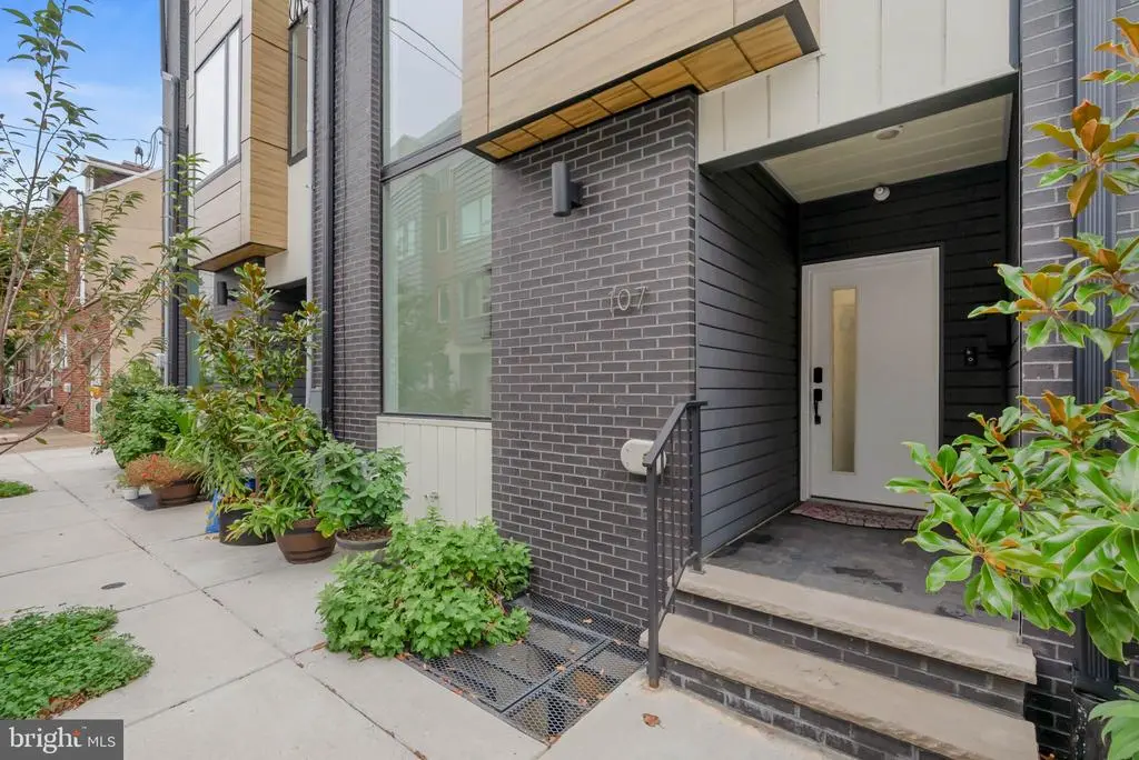On a quiet, tree-lined block in one of Philly's most sought-after pockets, where Pennsport blends into Queen Village, you'll find 107 Ellsworth St. This modern, luxurious, 4-bedroom, 4-bathroom residence spans over 2,400 square feet and includes a 2-car garage, a finished basement, and a private roof deck. It's one of just five homes crafted by a top Philadelphia developer, known for their quality construction and attention to detail. A striking brick facade welcomes you into a sunlit entryway, with a second entrance conveniently located off the garage. On the main level, wide-plank hardwood floors run throughout an open layout filled with natural light, thanks to oversized windows. The standout kitchen is sleek and all-white, fitted with premium Bosch stainless steel appliances, classic shaker cabinetry, and a large island with seating. A bold blue subway tile backsplash adds a splash of color and character. A board and batten feature wall extends from the dining area to the bright and airy living room, where sliding doors lead out to a private terrace. This floor also includes a sleek full bathroom wrapped in dramatic black tile and a spacious bedroom with tall windows. Upstairs on the third level, you'll find another full bedroom and bathroom at the front. Past the laundry closet is a large primary suite, offering a calm, hotel-like retreat. It features a generously sized bedroom, a walk-in closet, and a beautifully designed bathroom with monochrome black tile, a double vanity, soaking tub, and a glass-enclosed shower. The finished basement has extra living space perfect for a media room, home gym, or playroom. There's also another bedroom suite with its own full bathroom. On top of it all is an expansive roof deck where you can host friends and family, while admiring the panoramic view. Utilities include central A/C, gas heat, and a tankless gas water heater. The location boasts an impressive Walk Score of 99, placing you within steps of popular restaurants and friendly shops along Moyamensing Ave. It's close to sprawling Jefferson Square Park, and there's easy access to shopping on Columbus Blvd, public transit, Washington Ave, I-95, and South Jersey. Schedule your tour today