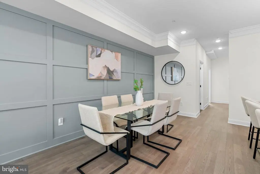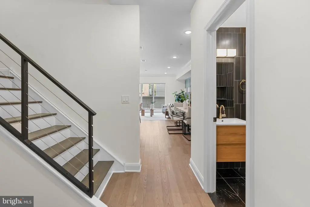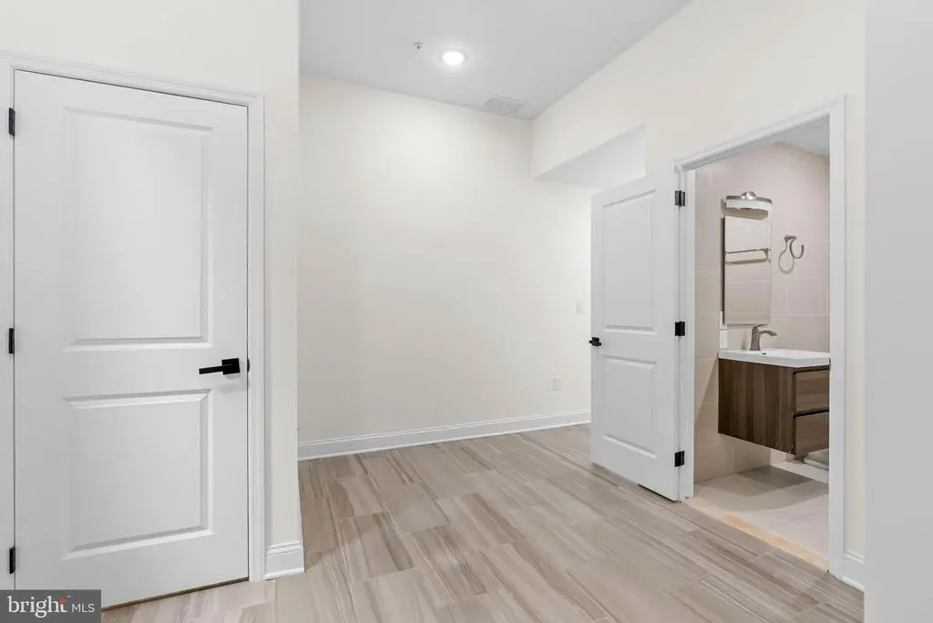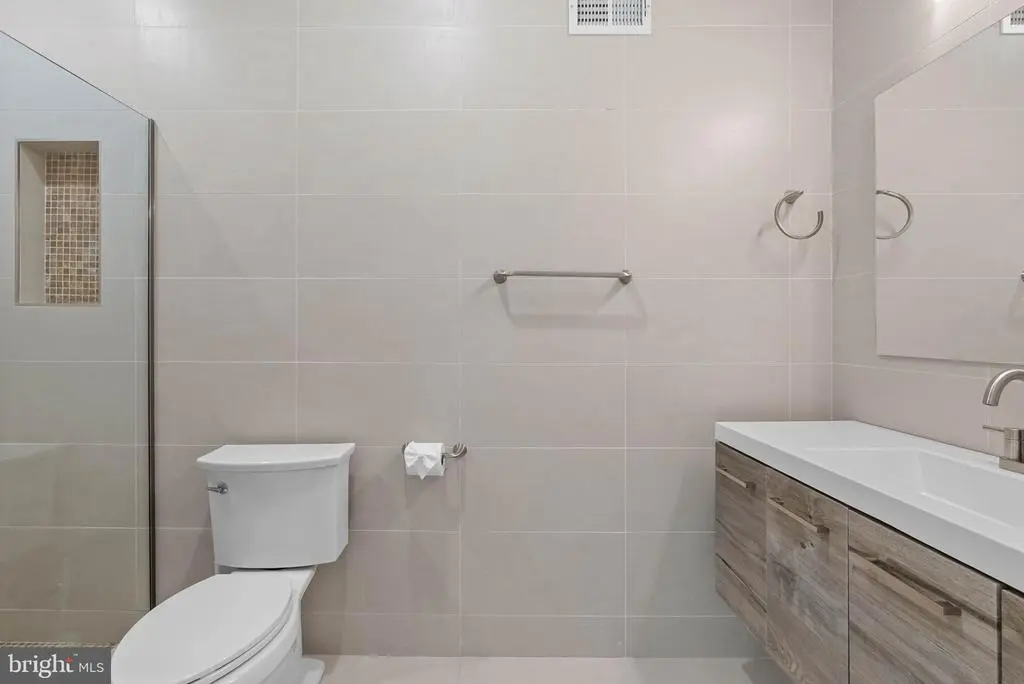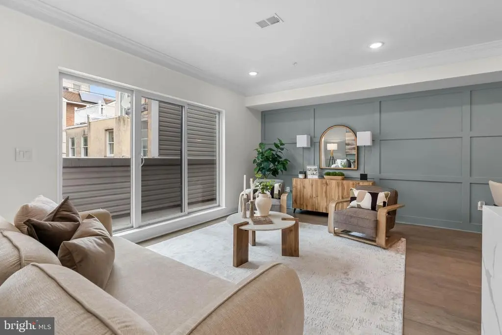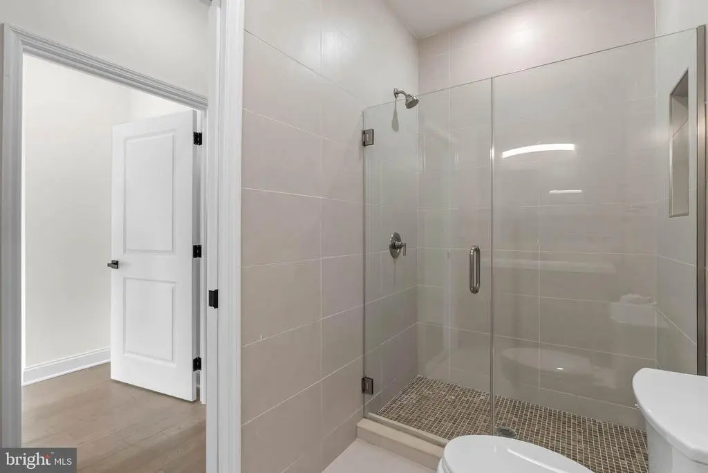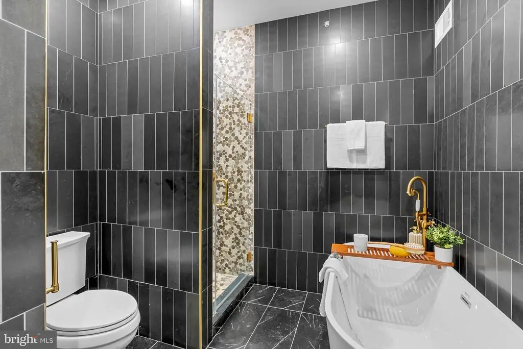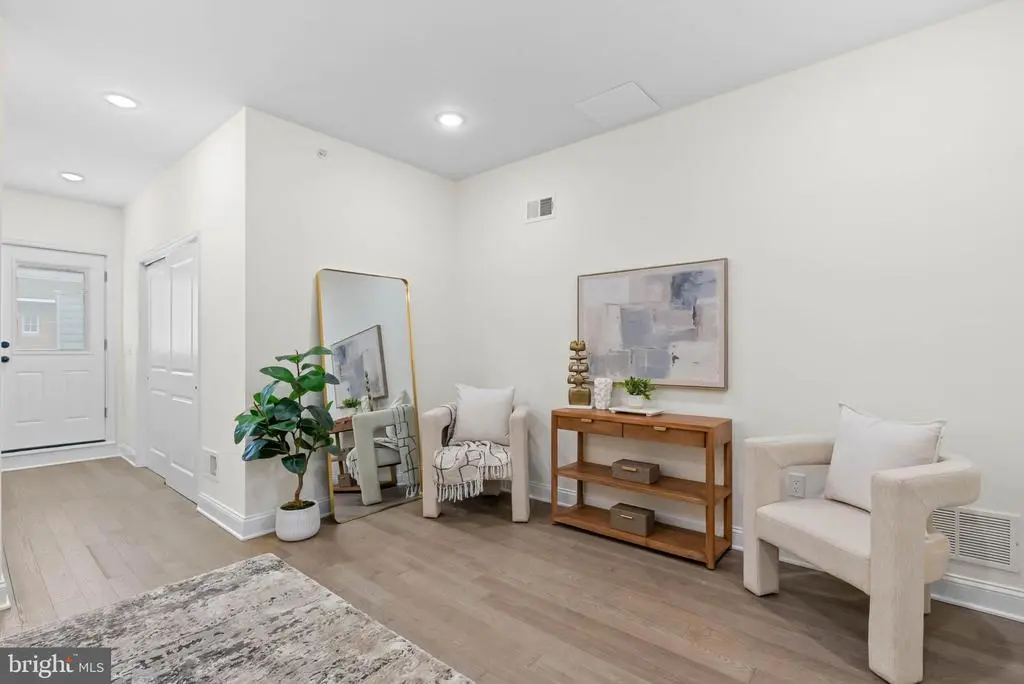On a quiet, tree-lined block in one of Philly's most sought-after pockets, where Pennsport blends into Queen Village, you'll find 107 Ellsworth St. This modern, luxurious, 4-bedroom, 4-bathroom residence spans over 2,400 square feet and includes a 2-car garage, a finished basement, and a private roof deck. It's one of just five homes crafted by a top Philadelphia developer, known for their quality construction and attention to detail. A striking brick facade welcomes you into a sunlit entryway, with a second entrance conveniently located off the garage. On the main level, wide-plank hardwood floors run throughout an open layout filled with natural light, thanks to oversized windows. The standout kitchen is sleek and all-white, fitted with premium Bosch stainless steel appliances, classic shaker cabinetry, and a large island with seating. A bold blue subway tile backsplash adds a splash of color and character. A board and batten feature wall extends from the dining area to the bright and airy living room, where sliding doors lead out to a private terrace. This floor also includes a sleek full bathroom wrapped in dramatic black tile and a spacious bedroom with tall windows. Upstairs on the third level, you'll find another full bedroom and bathroom at the front. Past the laundry closet is a large primary suite, offering a calm, hotel-like retreat. It features a generously sized bedroom, a walk-in closet, and a beautifully designed bathroom with monochrome black tile, a double vanity, soaking tub, and a glass-enclosed shower. The finished basement has extra living space perfect for a media room, home gym, or playroom. There's also another bedroom suite with its own full bathroom. On top of it all is an expansive roof deck where you can host friends and family, while admiring the panoramic view. Utilities include central A/C, gas heat, and a tankless gas water heater. The location boasts an impressive Walk Score of 99, placing you within steps of popular restaurants and friendly shops along Moyamensing Ave. It's close to sprawling Jefferson Square Park, and there's easy access to shopping on Columbus Blvd, public transit, Washington Ave, I-95, and South Jersey. Schedule your tour today