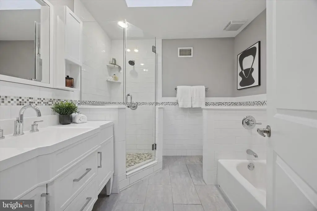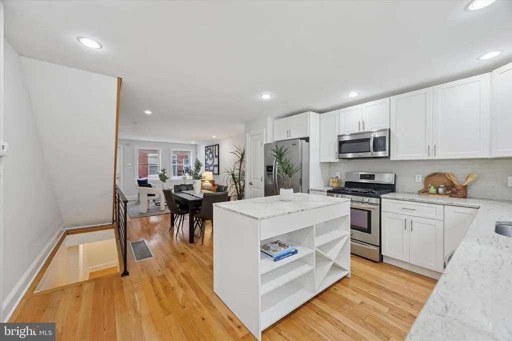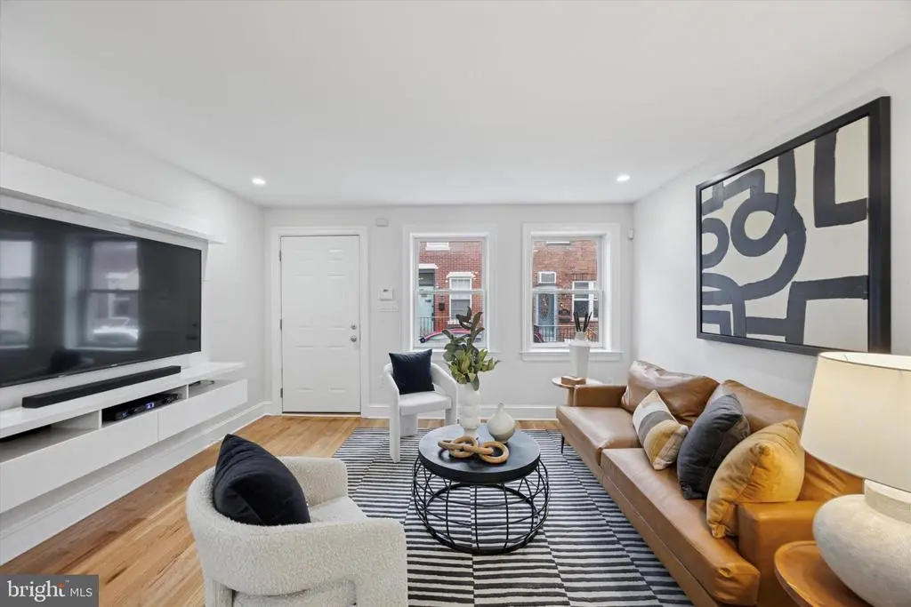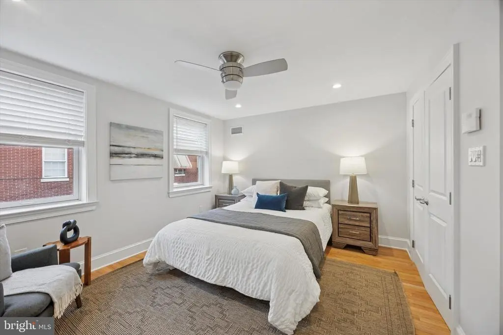 This pristine home was beautifully renovated less than 10 years ago and has been meticulously maintained since. A handsome exterior with decorative brickwork on the facade, wide limestone steps and window boxes are met with oak floors, crown molding, recessed lighting and nice touches like extra-deep window sills throughout the interior. The top-to-bottom renovation not only created a stylish contemporary space but improved on the traditional rowhome layout to maximize function and storage: The open-plan first floor includes a coat/pantry closet; the basement is fully finished; and the second floor has bedrooms with large closets on either end with a spacious full bath in the middle. The L-shaped kitchen with island features white Shaker-style cabinets, tasteful Monte Carlo patterned granite countertops with undermount sink, pale greige tile backsplash and a stainless steel Frigidaire Gallery appliance package including a five-burner range. The rear patio with privacy fence offers enough room for a grill and bistro set or a container kitchen garden. Upstairs, the primary bedroom gets gorgeous western light and has a double-width closet. The second bedroom is also nicely sized and has its own large closet with custom organizers. The spacious middle bathroom with skylight has an oversized vanity with tons of counter space and storage and a step-in shower with frameless glass door and separate soaking tub, each with a subway tile surround. The finished basement with ceramic tile floor and powder room offers extra living space along with a large storage closet and a separate laundry room. This quiet side street in the Fanny Jackson Coppin catchment is in an ideal location–East Passyunk Ave’s Human Robot, Cantina Los Caballitos, Pizzata Pizzeria & Birreria, City Fitness and Charlie’s Grocery are literally around the corner; the Broad Street Line with newly refurbished Tasker-Morris stop is two blocks away; and it’s an easy walk to DiSilvestro library, Columbus Square Park and a year-round farmer’s market.
