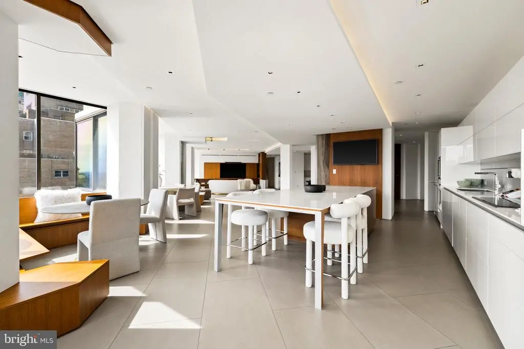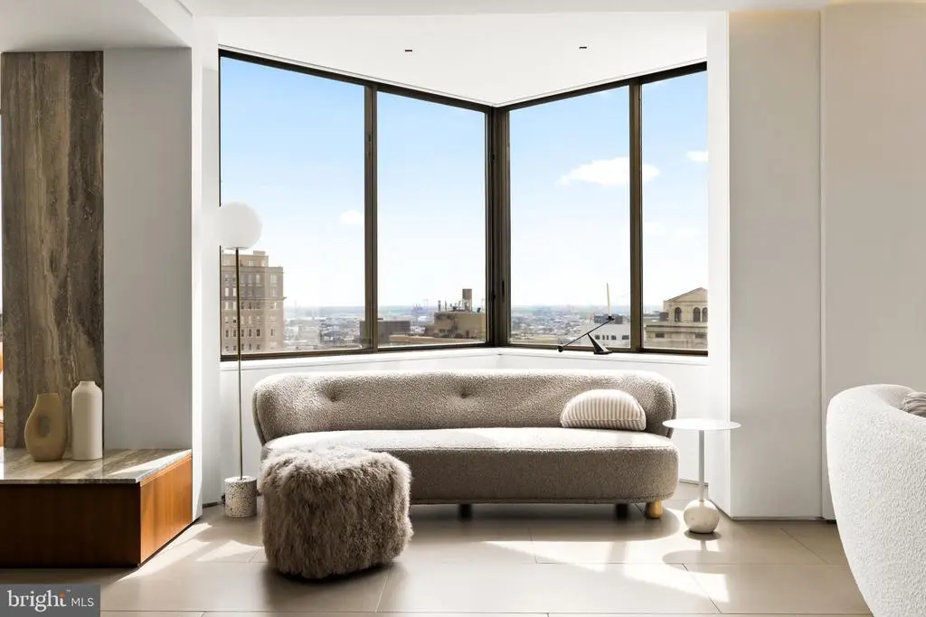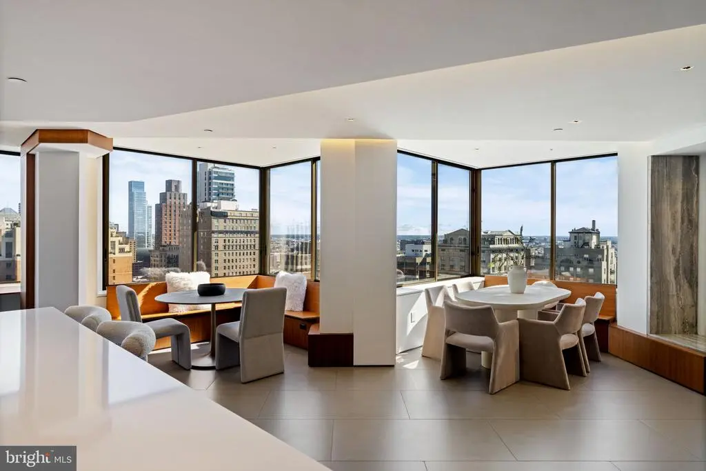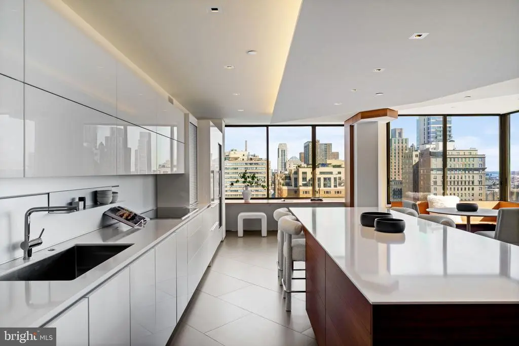 36 oversized windows each overlooking Rittenhouse Square is where you will find this 3,500+ sq ft combined residence. A breathtaking and completely renovated masterpiece by dMas Architects, featuring the building’s iconic ziggurat architecture and 36 oversized windows capturing unobstructed park and skyline views. Every detail has been meticulously curated: hand-plastered walls, sapless walnut flooring, full size travertine and Calcutta Gold marble slabs, backlit quartzite accents, and custom millwork create a luminous, sophisticated sanctuary. The Poggenpohl kitchen is a chef’s dream, with Wolf appliances, Sub-Zero refrigerator and 175-bottle wine fridge, Silestone countertops, floating white lacquer and glass cabinetry, and an island with seating for 4. Walnut built-ins, bowtie-shaped wine storage, and bespoke lighting enhance both elegance and function. The primary suite offers a Sitting Room, dual Offices, dual California closets, complemented by TWO spa-inspired baths with soaking tub, dual Duravit vanities, and porcelain tile. The second bedroom features an en-suite Calcutta Gold marble bath with walk-in shower and floating vanity. Additional highlights include powder room for guests, multiple flexible spaces, extensive storage, custom electric shades throughout, and integrated audio/visual system. Residents enjoy five-star services and amenities: 24-hour concierge, doorman, valet, chauffeur-driven car, housekeeping, fitness center, spa, indoor pool, and on-site dining at Lacroix, Scarpetta, and Library Bar. This is Rittenhouse Square living at its absolute finest, combining timeless elegance, bespoke finishes, and unparalleled views in one of Philadelphia’s most coveted addresses.