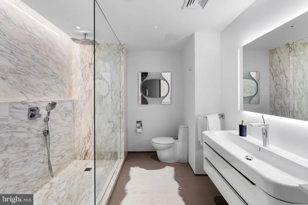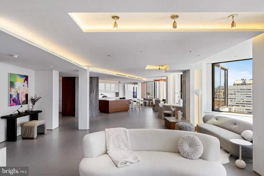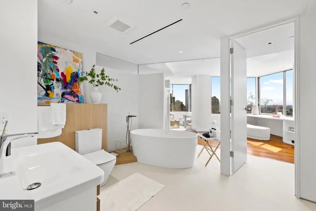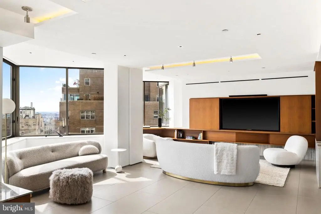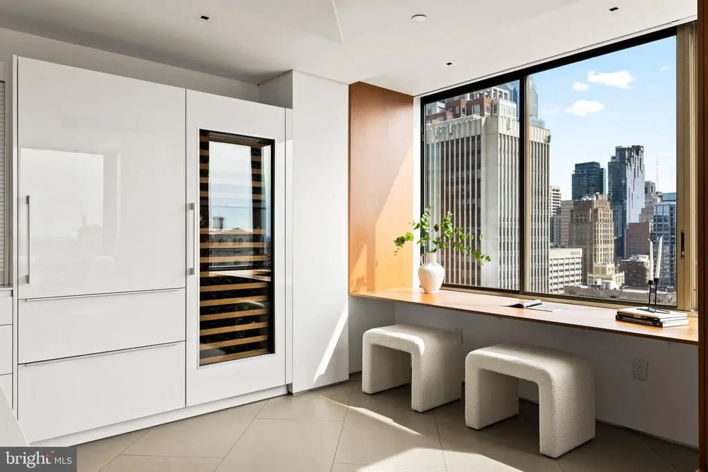 36 oversized windows each overlooking Rittenhouse Square is where you will find this 3,500+ sq ft combined residence. A breathtaking and completely renovated masterpiece by dMas Architects, featuring the building’s iconic ziggurat architecture and 36 oversized windows capturing unobstructed park and skyline views. Every detail has been meticulously curated: hand-plastered walls, sapless walnut flooring, full size travertine and Calcutta Gold marble slabs, backlit quartzite accents, and custom millwork create a luminous, sophisticated sanctuary. The Poggenpohl kitchen is a chef’s dream, with Wolf appliances, Sub-Zero refrigerator and 175-bottle wine fridge, Silestone countertops, floating white lacquer and glass cabinetry, and an island with seating for 4. Walnut built-ins, bowtie-shaped wine storage, and bespoke lighting enhance both elegance and function. The primary suite offers a Sitting Room, dual Offices, dual California closets, complemented by TWO spa-inspired baths with soaking tub, dual Duravit vanities, and porcelain tile. The second bedroom features an en-suite Calcutta Gold marble bath with walk-in shower and floating vanity. Additional highlights include powder room for guests, multiple flexible spaces, extensive storage, custom electric shades throughout, and integrated audio/visual system. Residents enjoy five-star services and amenities: 24-hour concierge, doorman, valet, chauffeur-driven car, housekeeping, fitness center, spa, indoor pool, and on-site dining at Lacroix, Scarpetta, and Library Bar. This is Rittenhouse Square living at its absolute finest, combining timeless elegance, bespoke finishes, and unparalleled views in one of Philadelphia’s most coveted addresses.