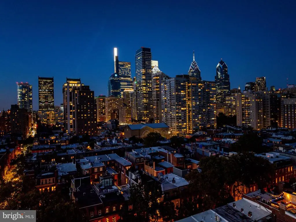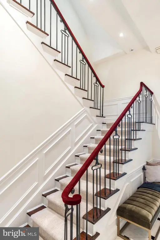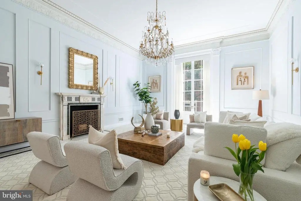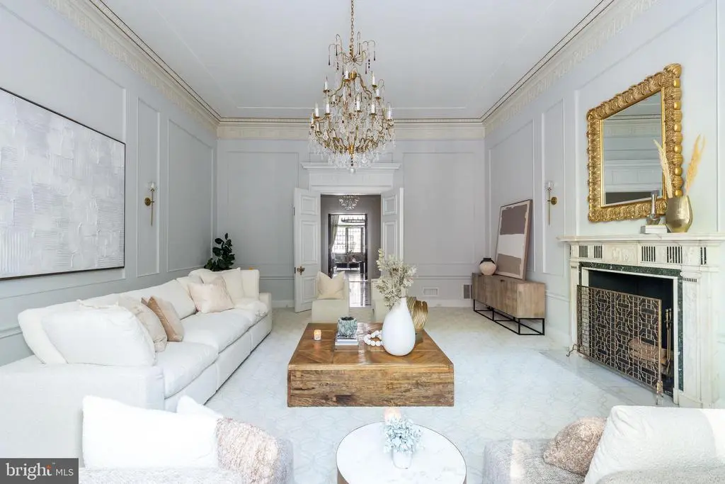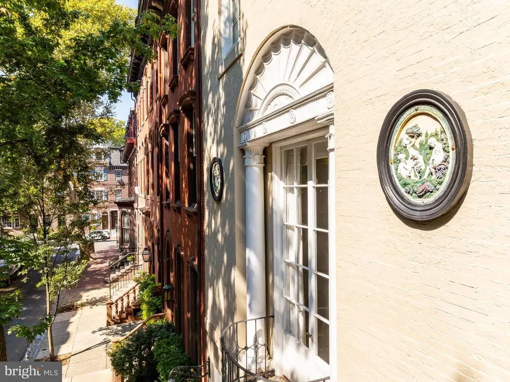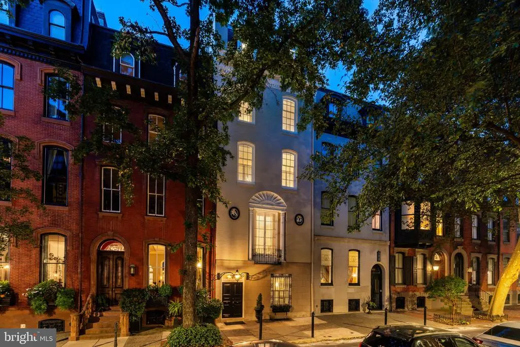 On Delancey’s most storied block, this 6,000+ sq ft, c.1860 mansion—artfully reimagined in 1924 by the celebrated firm Tilden, Register & Pepper—delivers museum-quality craftsmanship and comprehensive modernization. Unlike its brick-clad neighbors, it is one of only two limestone façades on the block, and at six full stories rising approximately 70 feet, it stands as the tallest residence on the street—a landmark of scale, material, and preservation. With 6 beds, 5 full baths, 2 powder rooms, 9 fireplaces, roof deck, a 2-car garage, and an elevator serving all 6 levels from the garden level to the fifth floor, 2031 Delancey stands apart as a meticulously maintained work of architecture and a triumph of engineering—all on a 23 x 93 ft lot. Enter through the original 1860 front door—still fitted with its hand-forged English handle—into a Belgian-marble-paved vestibule. An arched passage frames the sweeping main staircase, which marries the original hand-carved Brazilian mahogany and velvet rail with bespoke Samuel Yellin wrought-iron artistry. Beyond, double doors open to the light-washed living room, wrapped in refined millwork—deep crowns, tall baseboards, and crisp casings. The custom chef’s kitchen features new rift- and quarter-sawn white-oak floor, Brazilian quartzite countertops, a Sub-Zero/Wolf/Miele suite and professionally vented hood. The dining room flows back to the living room, and a service door just beyond the cozy breakfast nook leads to the attached 2-car garage. Ascend to the piano nobile’s Belgian marble landing. To the front, find a formal salon with soaring 12.5’ ceilings crowned by the original 1860 ceiling frieze and a 1909 French chandelier. At rear, the finely crafted library is paneled in American Chestnut, with mahogany floors, an artisan-restored bar, and a hearth of King of Prussia marble. Seamless, historically accurate millwork conceals a powder room and elevator access. French doors lead to the roof deck, with gas and water service, Trex decking, iron railings and views of the skyline. On the third floor, the front primary suite is cocooned and quiet, with 12’ ceilings and new wall-to-wall Berber carpet to soften both acoustics and underfoot feel. Custom built-ins—including a media cabinet pre-wired for television—keep the room tailored and calm. Both suites on this floor feature new walk-in closets and rebuilt ensuite baths in stone and porcelain tile and frameless glass for period-faithful proportion with contemporary performance. New custom shutters and new thermal-insulating, remote-controlled blackout blinds provide privacy on this level and in the two fourth-floor bedroom suites. The rear fourth floor bedroom retains the original pine flooring; the baths echo the home’s holistic renovation. A full-size laundry adds convenience. The elevator opens directly onto the fifth floor, a luminous retreat crowned by a skylight that pours natural light across the original, time-softened pine floors. This level flexes beautifully, with spaces for two bedrooms or a private office and a den, lounge or fitness area. A second kitchen and luxurious full bath make the space self-sufficient for long stays or work-from-home days. The elevator extends down to the garden level—a finished flex space featuring an iron-gated wine cellar, and a dedicated laundry area. What truly distinguishes 2031 Delancey is the rigor of its renewal. In recent years, the owners executed a comprehensive systems restoration, including 3-zone HVAC with new furnace and condensers, new heat pump and smart thermostats, Lutron lighting and Sonos throughout, Double-glazed windows, updated electrical panels, and dual 75-gallon water heaters with booster pumps enhance comfort. At the same time, the home’s legacy materials have been preserved and quietly fortified—each element bringing the home’s 19th-century pedigree forward for your 21st-century lifestyle.