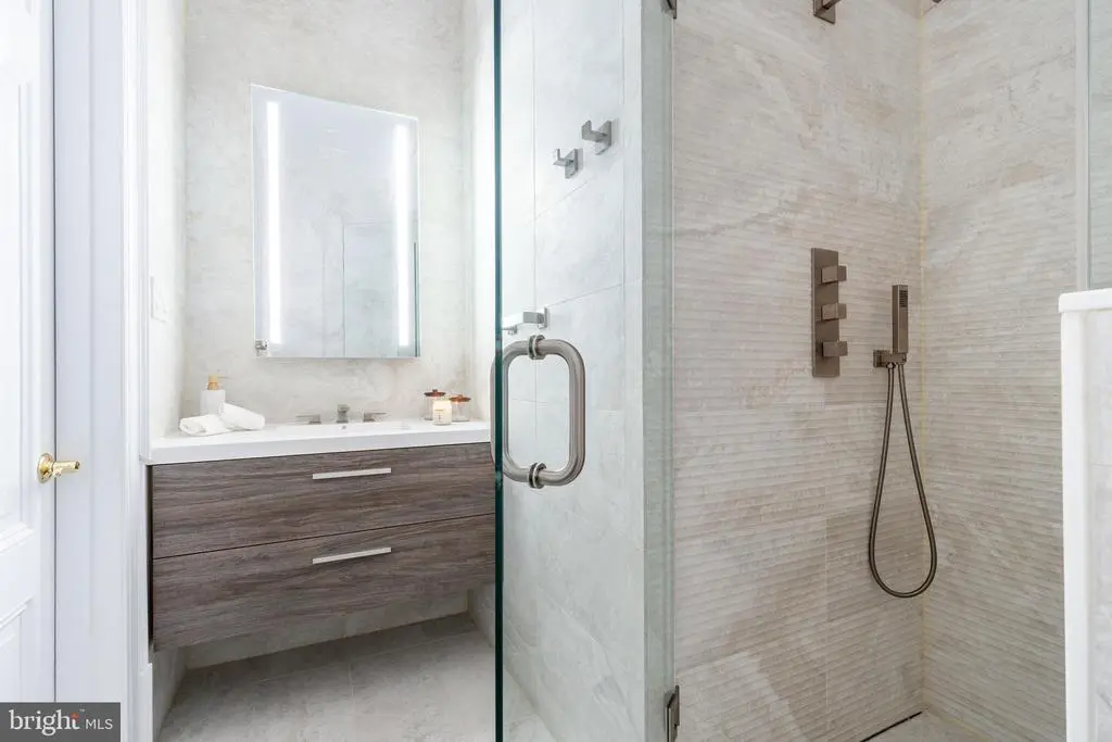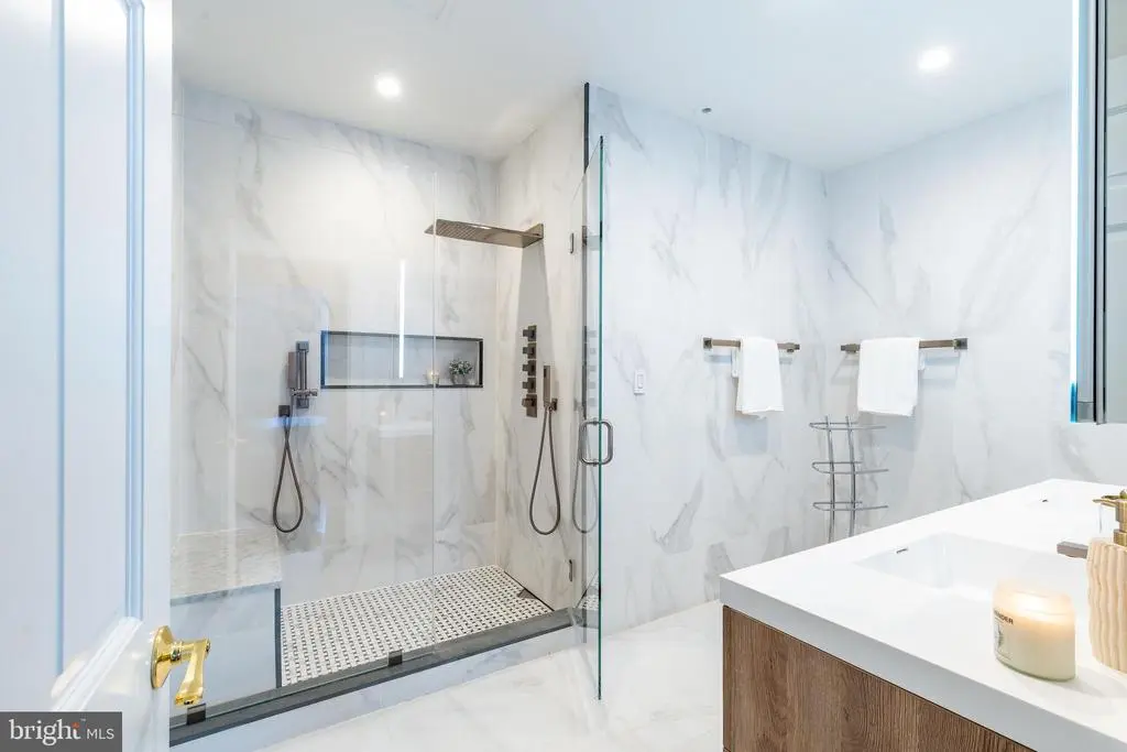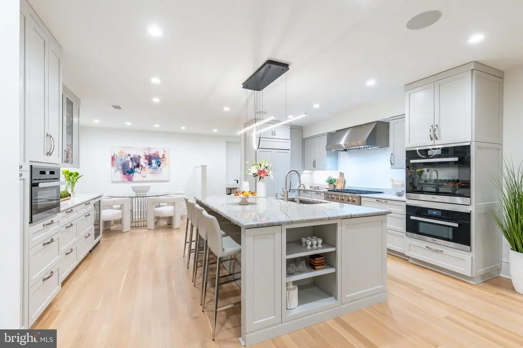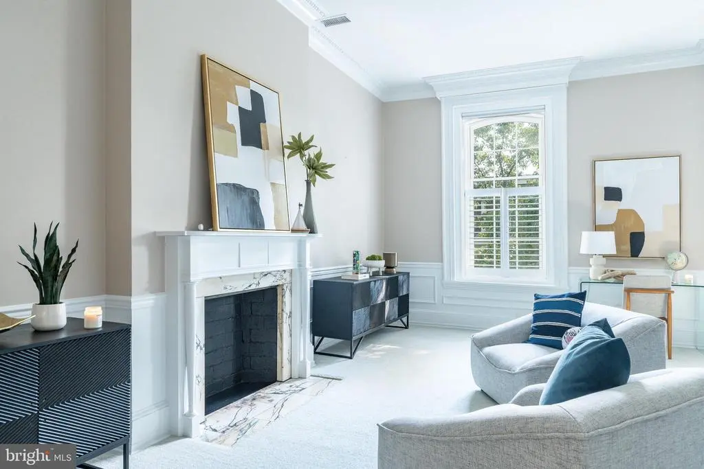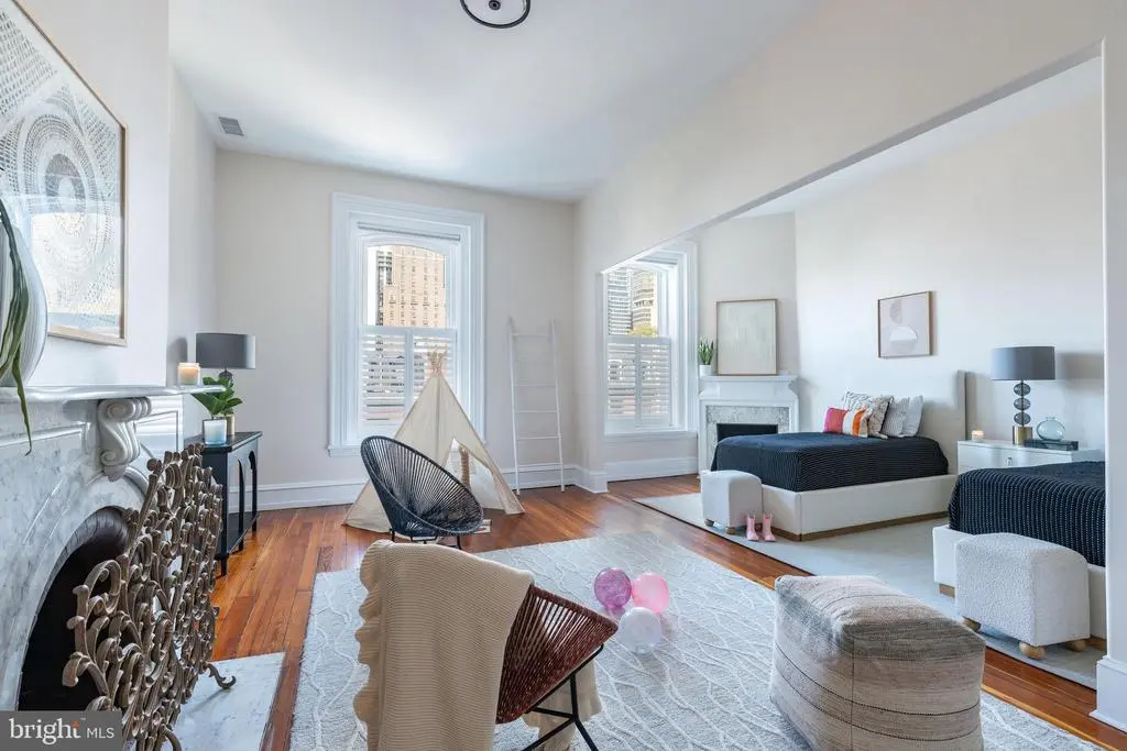 On Delancey’s most storied block, this 6,000+ sq ft, c.1860 mansion—artfully reimagined in 1924 by the celebrated firm Tilden, Register & Pepper—delivers museum-quality craftsmanship and comprehensive modernization. Unlike its brick-clad neighbors, it is one of only two limestone façades on the block, and at six full stories rising approximately 70 feet, it stands as the tallest residence on the street—a landmark of scale, material, and preservation. With 6 beds, 5 full baths, 2 powder rooms, 9 fireplaces, roof deck, a 2-car garage, and an elevator serving all 6 levels from the garden level to the fifth floor, 2031 Delancey stands apart as a meticulously maintained work of architecture and a triumph of engineering—all on a 23 x 93 ft lot. Enter through the original 1860 front door—still fitted with its hand-forged English handle—into a Belgian-marble-paved vestibule. An arched passage frames the sweeping main staircase, which marries the original hand-carved Brazilian mahogany and velvet rail with bespoke Samuel Yellin wrought-iron artistry. Beyond, double doors open to the light-washed living room, wrapped in refined millwork—deep crowns, tall baseboards, and crisp casings. The custom chef’s kitchen features new rift- and quarter-sawn white-oak floor, Brazilian quartzite countertops, a Sub-Zero/Wolf/Miele suite and professionally vented hood. The dining room flows back to the living room, and a service door just beyond the cozy breakfast nook leads to the attached 2-car garage. Ascend to the piano nobile’s Belgian marble landing. To the front, find a formal salon with soaring 12.5’ ceilings crowned by the original 1860 ceiling frieze and a 1909 French chandelier. At rear, the finely crafted library is paneled in American Chestnut, with mahogany floors, an artisan-restored bar, and a hearth of King of Prussia marble. Seamless, historically accurate millwork conceals a powder room and elevator access. French doors lead to the roof deck, with gas and water service, Trex decking, iron railings and views of the skyline. On the third floor, the front primary suite is cocooned and quiet, with 12’ ceilings and new wall-to-wall Berber carpet to soften both acoustics and underfoot feel. Custom built-ins—including a media cabinet pre-wired for television—keep the room tailored and calm. Both suites on this floor feature new walk-in closets and rebuilt ensuite baths in stone and porcelain tile and frameless glass for period-faithful proportion with contemporary performance. New custom shutters and new thermal-insulating, remote-controlled blackout blinds provide privacy on this level and in the two fourth-floor bedroom suites. The rear fourth floor bedroom retains the original pine flooring; the baths echo the home’s holistic renovation. A full-size laundry adds convenience. The elevator opens directly onto the fifth floor, a luminous retreat crowned by a skylight that pours natural light across the original, time-softened pine floors. This level flexes beautifully, with spaces for two bedrooms or a private office and a den, lounge or fitness area. A second kitchen and luxurious full bath make the space self-sufficient for long stays or work-from-home days. The elevator extends down to the garden level—a finished flex space featuring an iron-gated wine cellar, and a dedicated laundry area. What truly distinguishes 2031 Delancey is the rigor of its renewal. In recent years, the owners executed a comprehensive systems restoration, including 3-zone HVAC with new furnace and condensers, new heat pump and smart thermostats, Lutron lighting and Sonos throughout, Double-glazed windows, updated electrical panels, and dual 75-gallon water heaters with booster pumps enhance comfort. At the same time, the home’s legacy materials have been preserved and quietly fortified—each element bringing the home’s 19th-century pedigree forward for your 21st-century lifestyle.