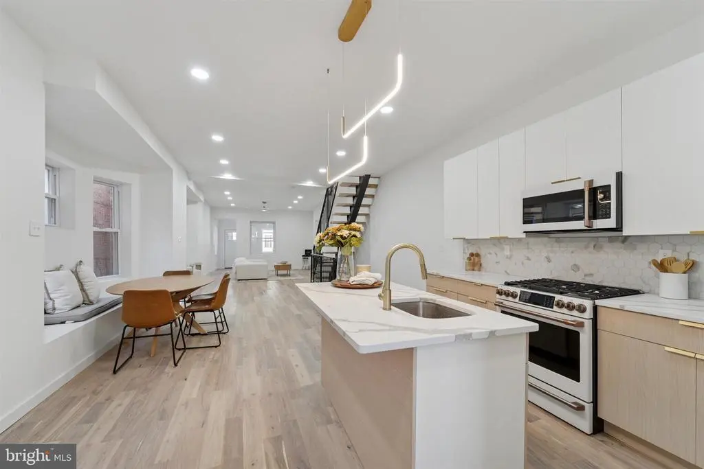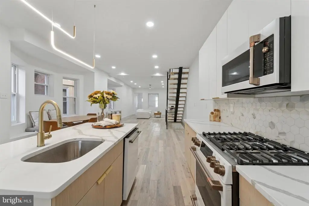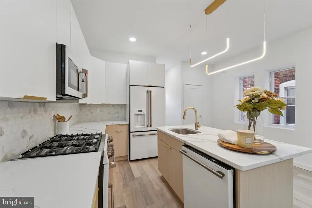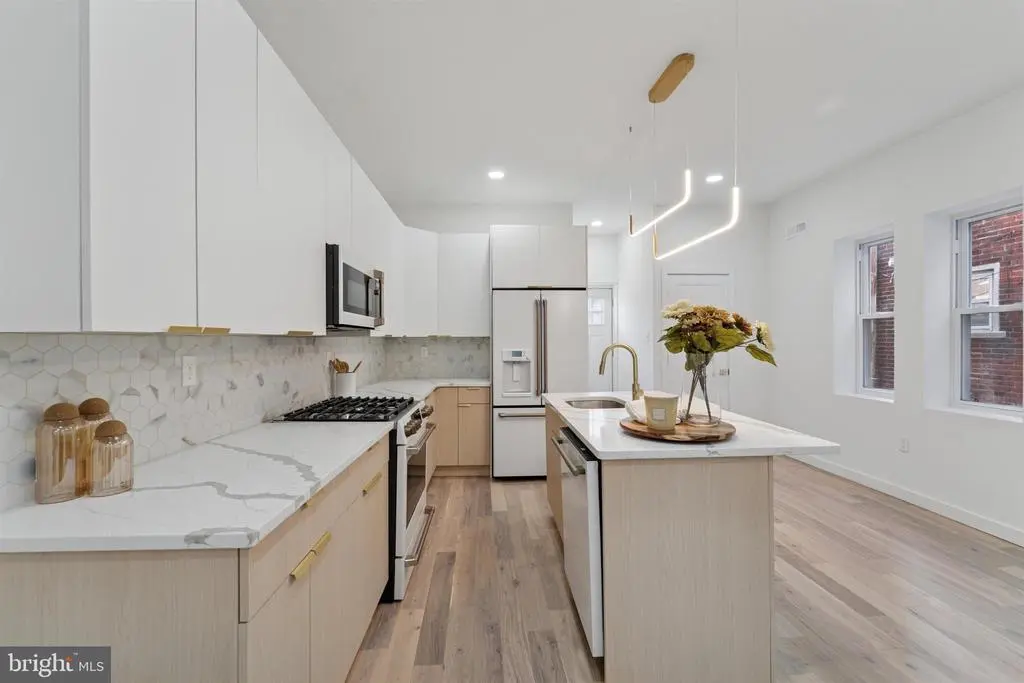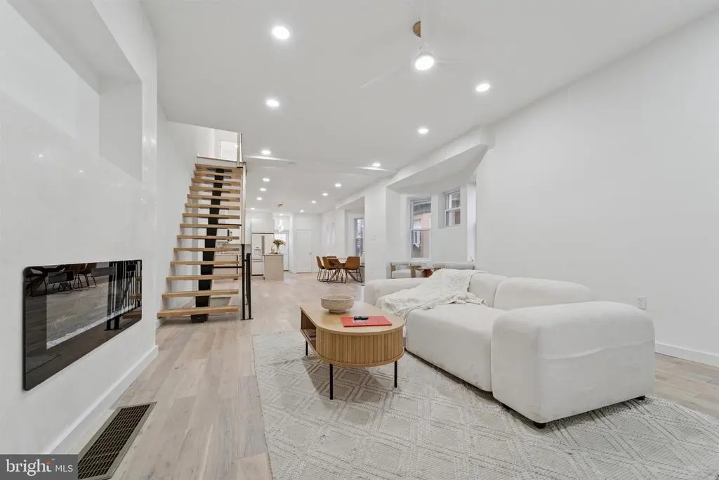 Welcome to 1203 S Wilton Street—This 4-bed/3.5-bath semi- detached twin home with Central air and finished basement in eastern Kingsessing is a rare gem. Thoughtfully designed with a light and airy palette composed of white and wood accents throughout this home is a move in ready canvas, that feels elevated and tasteful. As a twin home, the an abundance of natural light streams through the south facing windows. Enter to find an enclosed porch - a great place to put plants or store bicycles or carriages or a table to watch the world go by. The living space features floor to ceiling ivory colored natural mantle with built-in fireplace. Note the floating staircase with a light colored wood to compliment the wide planked flooring throughout. Proceeding to the rear find a premium chef's kitchen with an island. Note the quality Cafe line of coordinated appliances - microwave, dishwasher, range and refrigerator in white. The cabinetry is mixed media with wood at the base and white overhead. The rear of the home offers a tucked away powder room as well as a pantry preceding the large back yard. Upstairs, three bedrooms and two well designed bathrooms. Enter the primary suite, and find an illuminating bay window and large closets. The en suite, bath is large and spa-like with a beautiful soaking tub. At the ground level find a finished basement perfect for entertaining a gym or playroom. This home is close to Kingsessessing Rec center, Cedar Park and easy access to public transportation. Enjoy a private backyard with wooden fence, ideal for gardening, entertaining, or simply relaxing outdoors.