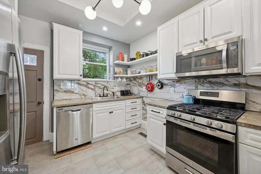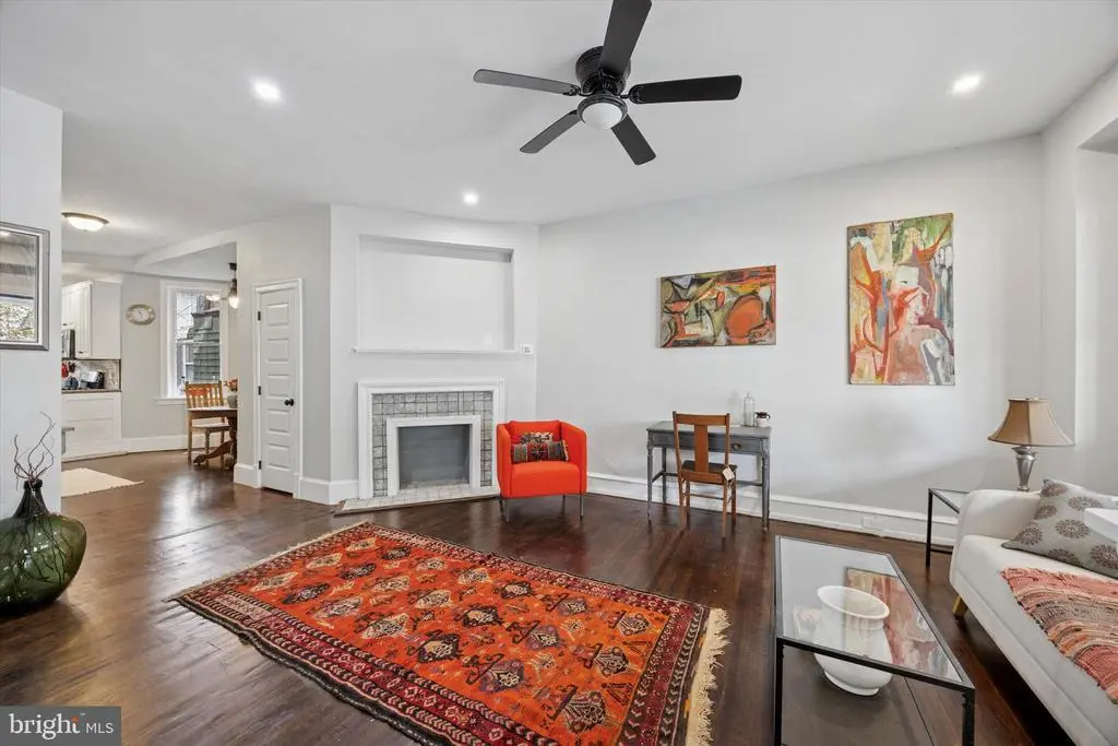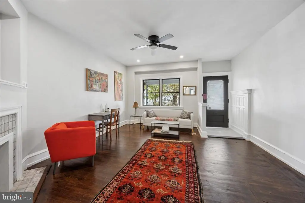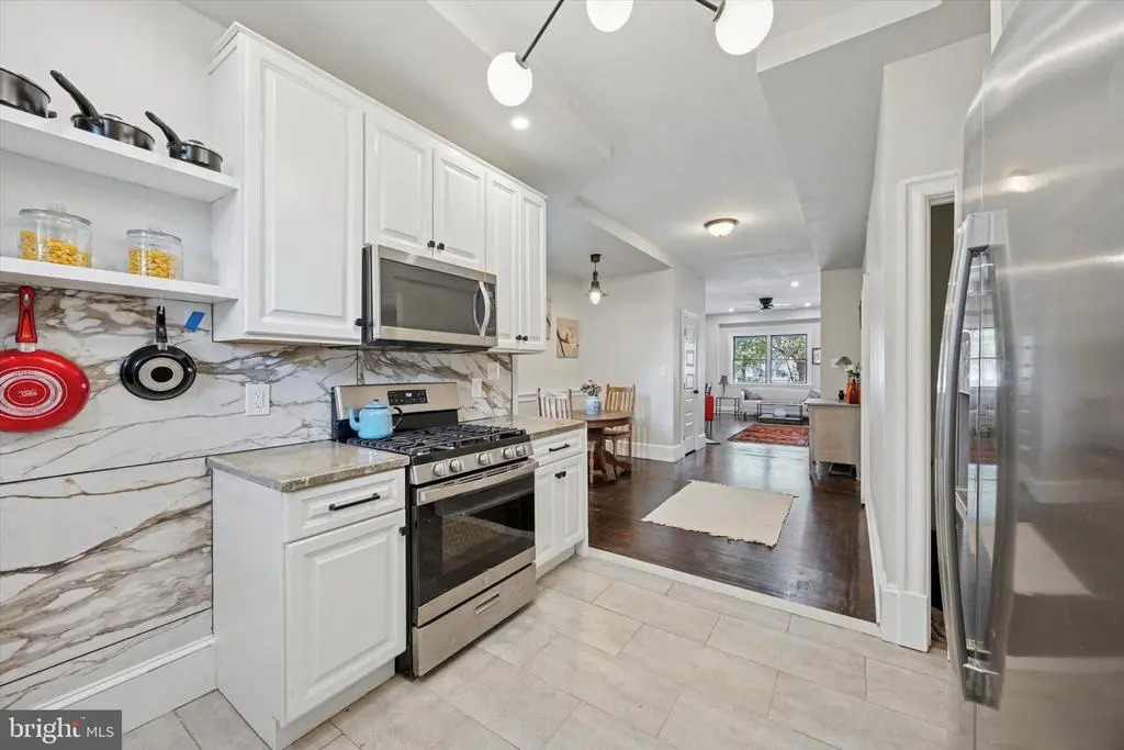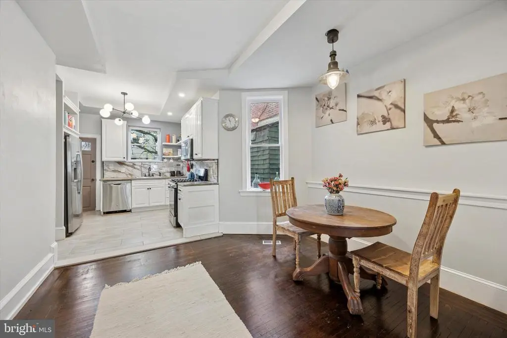 Welcome home to this charming thoughtfully updated rowhome that blends historic charm with modern finishes. Set back from the street behind a garden, the classic exterior features a welcoming stone porch and double windows. Inside, original woodwork pairs seamlessly with refinished hardwood floors that run throughout. The open-concept main level offers a bright living room with oversized windows and a decorative fireplace. A convenient powder room separates the living and dining areas. The dining space flows into a stylish kitchen with solid wood cabinetry, handcrafted details, concrete countertops, stainless steel appliances, and a large window perfect for an indoor herb garden. Step outside to a brand-new rear porch overlooking a spacious city yard. Upstairs, the primary suite includes a bay window, an oversized closet, and a beautifully designed en-suite bath with custom vanity and a walk-in shower. Two additional bedrooms — one with dual exposures — share a modern hall bath. Located on a quiet, tree-lined Logan block, the home is close to Broad Street, the Boulevard, and two neighborhood parks: Hunting Park Rec Center and Barrett Playground. Easy to show, quick settlement possible. Priced to sell!!!