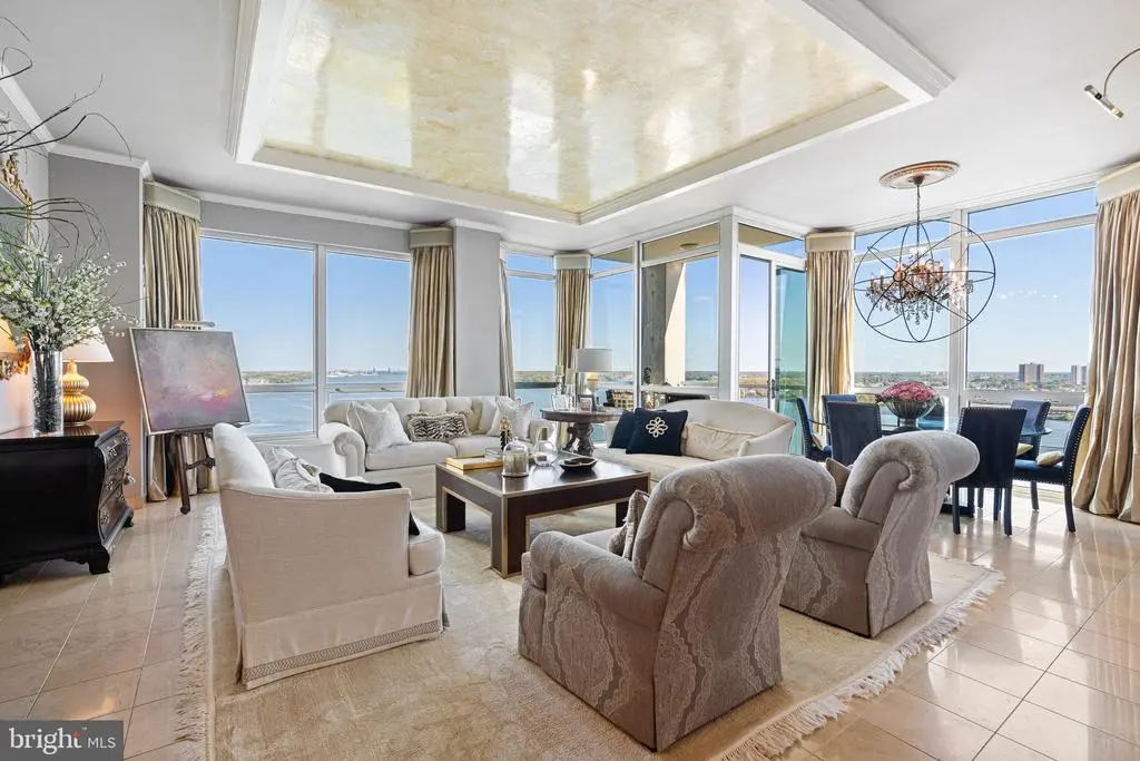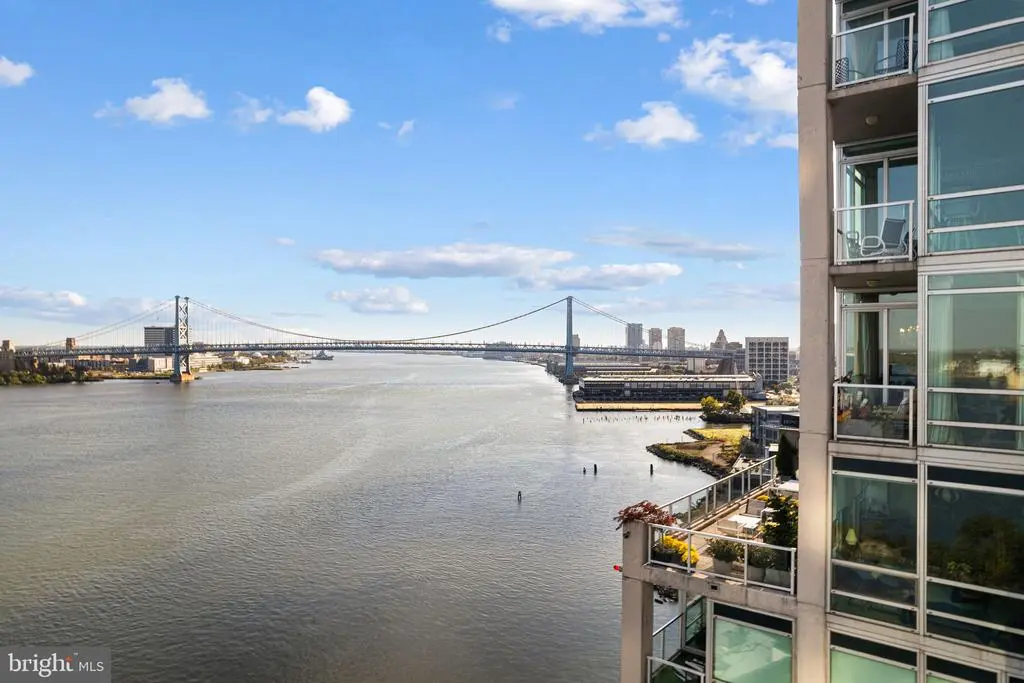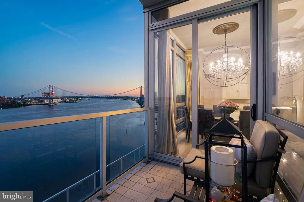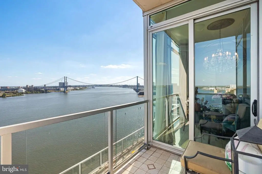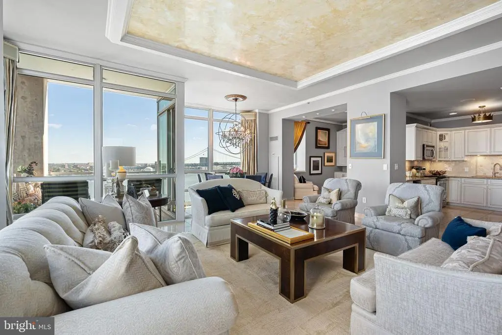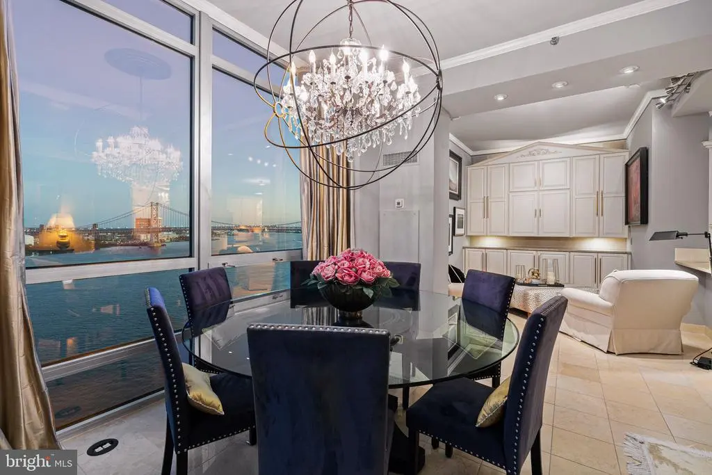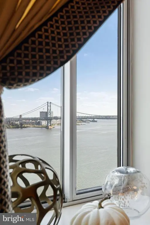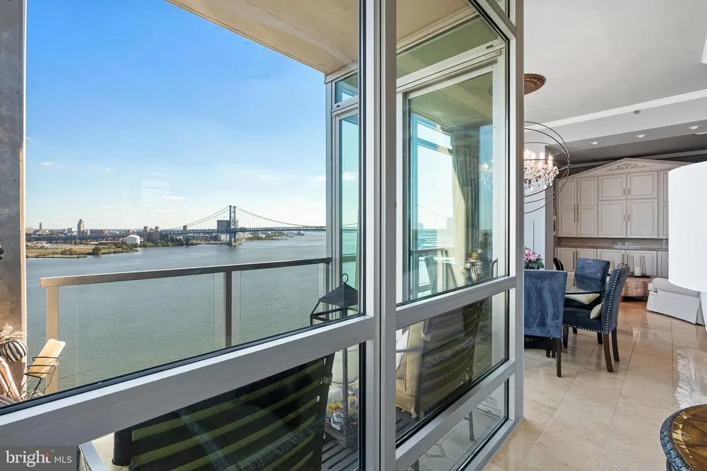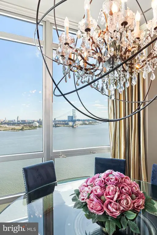 From the moment you step through the doors of P1501, it’s immediately clear this home has been designed with no detail overlooked. A sense of quiet elegance fills the space, beginning in the foyer, where specialty wall finishes shimmer beneath a Schonbek crystal chandelier. The polished marble tile flooring, which continues throughout the residence, sets a tone of refinement, while a double coat closet adds concealed functionality. Just off the entry, the powder room offers a touch of sophistication with its custom vanity, stone countertop, and designer lighting—a perfect welcome for guests. Heading into the main living area, the home opens to breathtaking scale. Ten-foot ceilings, crown moulding, and floor-to-ceiling windows showcase uninterrupted views of the Delaware River and Ben Franklin Bridge, bathing the interiors in natural light. The coffered ceiling, finished in a Venetian-inspired, hand-painted metallic plaster, captures the glow of day and the shimmer of evening chandeliers. Imported draperies frame the walls of glass. Suspended above the dining table, a Swarovski crystal orb chandelier becomes a sculptural centerpiece, highlighting this seating area. Continuing into the kitchen, form and function unite in harmony. Granite countertops contrast beautifully with custom cream cabinetry detailed with glass fronts, complemented by a natural stone backsplash and under-cabinet lighting. A built-in wine refrigerator and full stainless-steel appliance package enhance the space’s practicality, while the open layout encourages both culinary creativity and effortless entertaining. Every element here feels balanced—warm, welcoming, and meticulously crafted. Beyond the kitchen, the den transitions into an intimate media room, enveloped in sound thanks to the built-in surround system. The polished marble continues underfoot, maintaining visual flow, while layered lighting creates a cozy ambiance ideal for film, music, or quiet evenings in. The den features custom built-in cabinetry thoughtfully designed to conceal multimedia components, maintaining a clean, streamlined aesthetic. Versatile in function, this space transitions effortlessly between a media room as currently styled, a home office, or an extension of the kitchen for those seeking an open, connected layout. Stepping through glass doors, the balcony extends the living space outdoors. Here, the river and skyline unfold in full panorama—the bridge’s architectural lines rising gracefully above the water. It’s a peaceful setting that feels miles away from the city below. A frost panel design, glass door separates the private wing from the entertaining spaces beautifully, while allowing light to filter through. Each of the three bedrooms offers its own unique vantage and luxurious feel. The primary suite is a private retreat with a spa-inspired en-suite bathroom, walk-in closet, and serene river views. Additional bedrooms ensure ample space for both relaxation and productivity. Every bath is finished with custom tilework, and high-end fixtures, continuing the home’s elevated aesthetic. Completing the offering are two premium parking licenses and a storage unit, ensuring convenience and peace of mind. All crystal light fixtures convey. Waterfront Square Condominium & Spa is Philadelphia’s premier gated waterfront community, offering 24/7 guard and gate security, concierge. Residents enjoy resort-style amenities including an indoor pool and hot tub with river deck, fitness center, sauna and steam rooms, massage suites, and community lounges. The three-level garage supports Philadelphia’s largest green roof, and landscaped gardens across 9.5 acres of manicured riverfront grounds. On-site management and an advanced closed-circuit security system ensure peace of mind, while Global Limousine shuttle service provides weekday transportation to and from 30th Street Station.