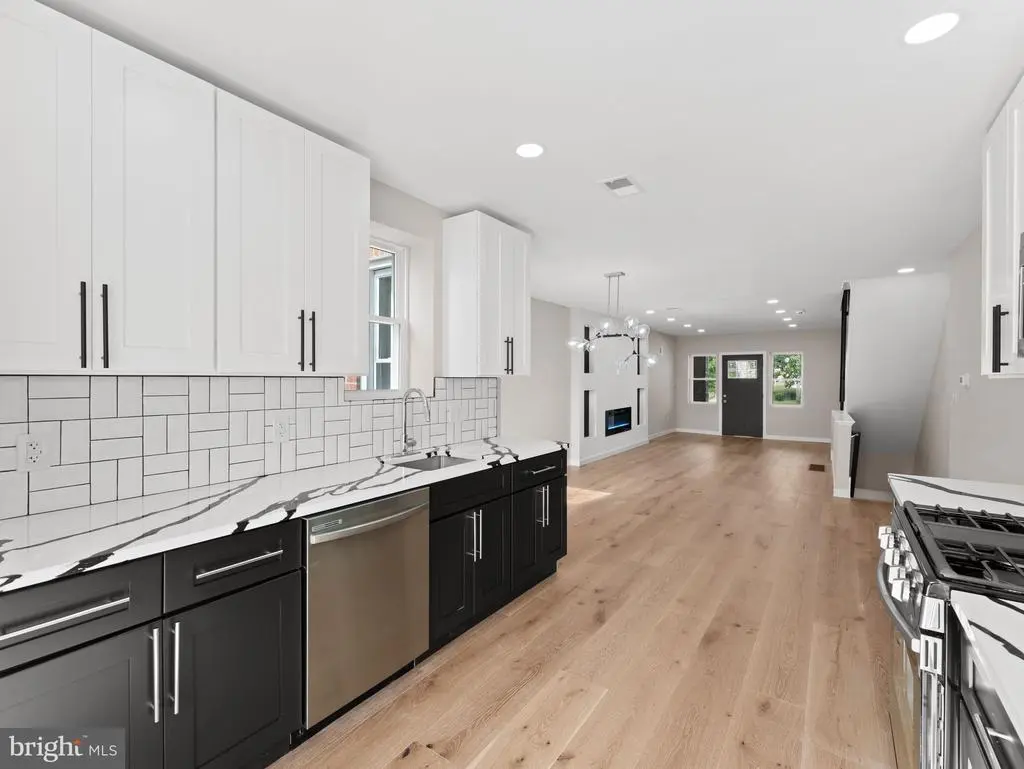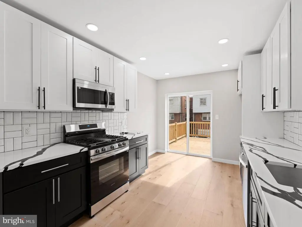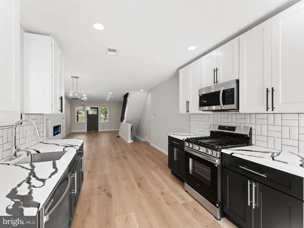 Step into refined luxury at this meticulously renovated 3-bedroom, 3-full-bath residence in desirable Mt. Airy. The main floor is a showcase of modern design, featuring newly installed hardwood floors, a stunning featured wall with black panel design, and a cozy fireplace, creating the perfect ambiance for entertaining. The galley kitchen is a culinary masterpiece, boasting black and white shaker soft-close cabinets, sleek quartz countertops, and a chic 3-D subway tiled backsplash, all complemented by brand-new stainless steel appliances. Dinner extends seamlessly to the outdoors via a sliding glass door that opens to a newly built private deck. Retreat to the spectacular primary suite with its dramatic cathedral ceilings, mood-setting light accent, and a private, modern spa-like bath. The fully finished lower level offers the versatility of a third full bath and convenient direct access to the garage. A charming stone-covered front patio welcomes you home, completing this exceptional Philadelphia offering. Welcome to your new home... 2424 77th Ave now awaits its new owner!