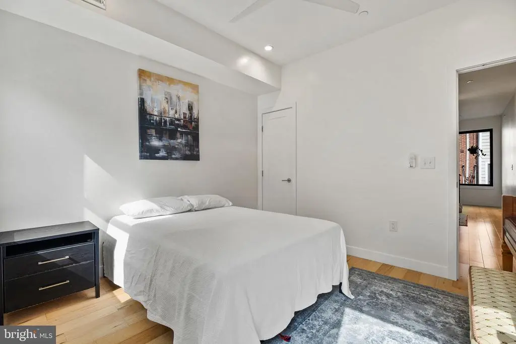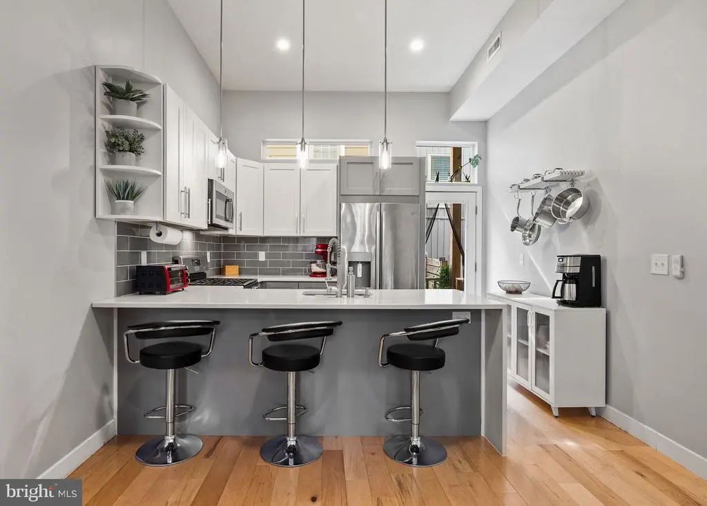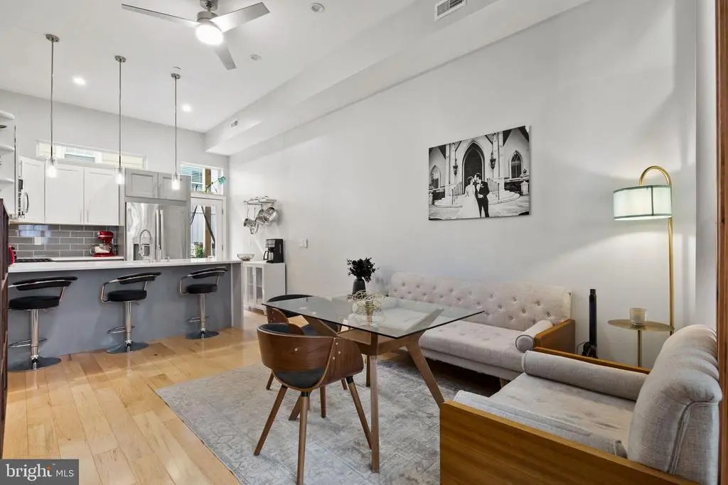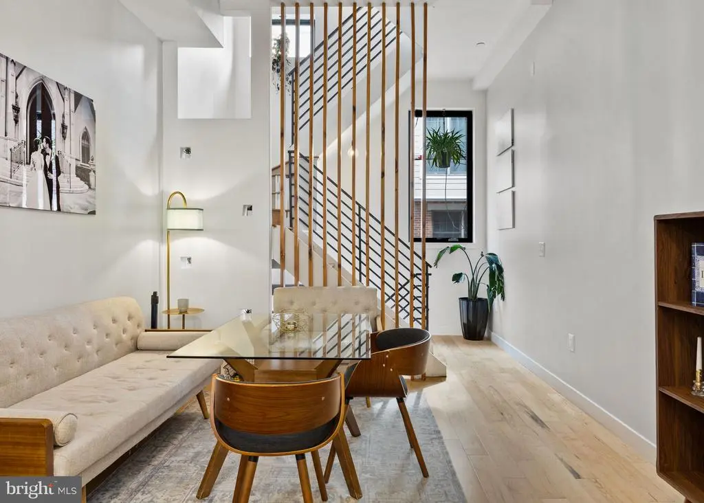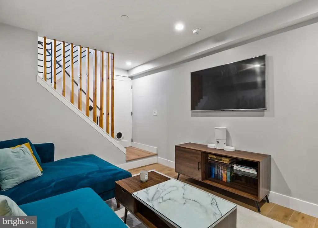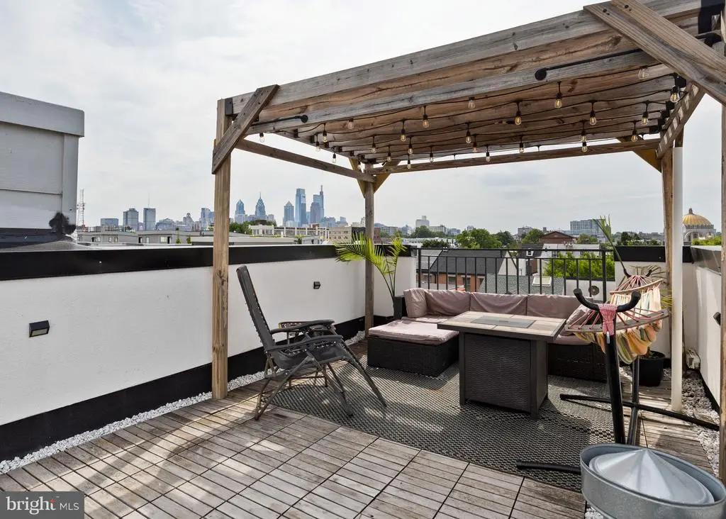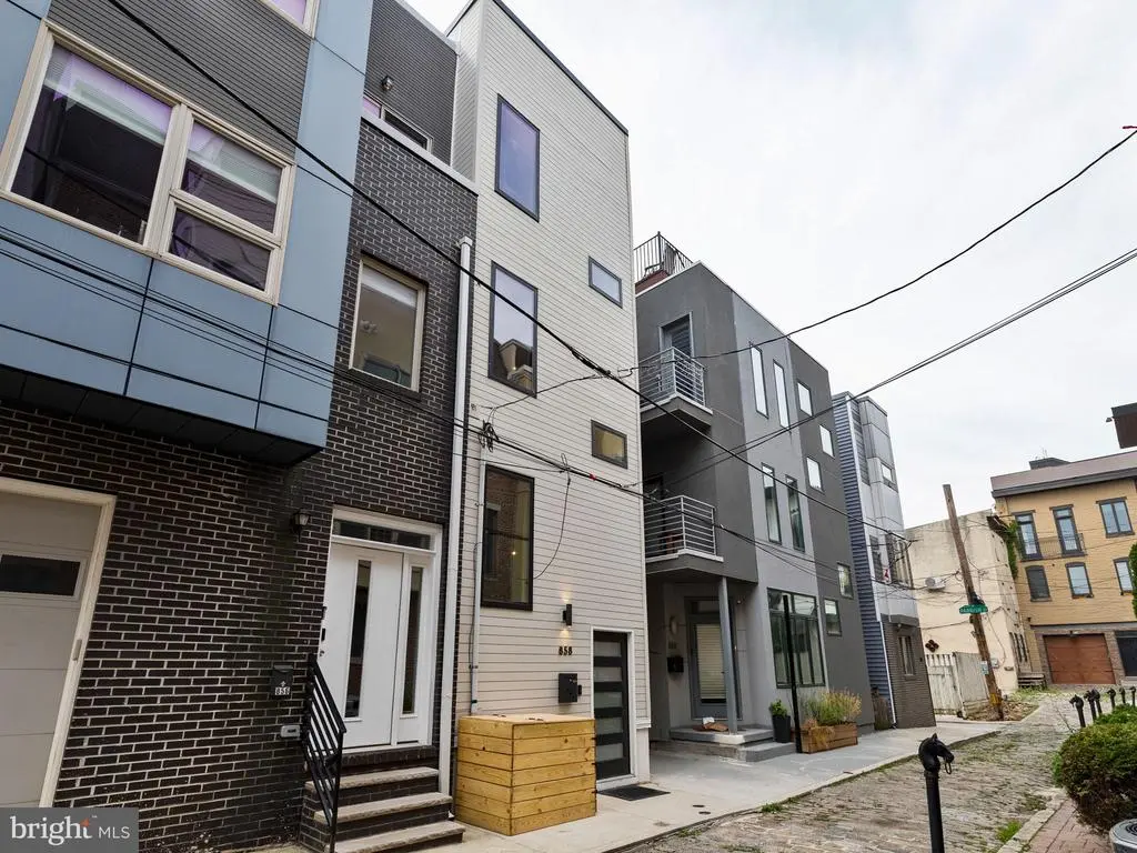 Tucked away on one of Northern Liberties’ most charming cobblestone blocks, 858 North Leithgow Street is a thoughtfully designed, architecturally significant home that’s truly one of a kind. Built in 2019, this contemporary 3 bedroom, 3 bathroom home makes a bold impact, with every inch of space carefully considered, with refined finishes, custom features, and an abundance of natural light throughout. The main level features extra high ceilings and a warm, open design. The living area has a custom wood architectural element that rises from floor to ceiling, dividing the sitting area from the staircase and connecting the floors above and below the main level in a playful yet compelling way. The kitchen is flooded with light from clerestory windows above and includes a peninsula with barstool seating, sleek cabinetry with built-in conveniences (spice rack, refuse, lazy susans), and stainless steel appliances. Just off the kitchen, a private backyard patio offers the perfect setup for morning coffee, outdoor dinners, or casual gatherings. The fully-finished lower level is a true extension of the home’s living space and includes a media room, a full bedroom, and a stylish open wet bath with tile floors and walls. Under a modern mantle in the media room, a fireplace with bioethanol heating adds a cozy touch and is included with the home. On the second floor, an open office area leads to a second bedroom, laundry, and an elegant full bath. The third-floor primary suite includes excellent closet space, a stunning full bath with dual vanities, sleek black tile, and a dual-head setup in an oversize shower. The third floor also provides access to an interior courtyard area. This unique, gravel-floored indoor-outdoor space connects to a spiral staircase that leads up to the private rooftop deck. The rooftop entertainment area is a true highlight, complete with a custom pergola and incredible views of Center City and the Ben Franklin Bridge. Whether you're entertaining or simply enjoying a quiet evening, this space is beautifully finished and easy to love. Additional highlights include hardwood floors throughout, central air, tankless hot water heating, ceiling fans in the bedrooms and living room, sliding closet doors, and a custom refuse and recycling enclosure at the front of the home. Window treatments, light fixtures, kitchen appliances, washer/dryer, gas grill, and bioethanol fireplace are all included in the sale, and 5 years remain on full tax abatement! This is not a typical row home—it's a smart, sophisticated space with tasteful design and creative use of every square foot. Every detail reflects the care, intention, and passion of the architect-owner who has brought to life a modern, warm residence as a model for urban living. Just steps from some of the best dining, coffee shops, markets, bars, and public transportation in Northern Liberties, 858 N Leithgow is a home you’ll love coming back to every day.
