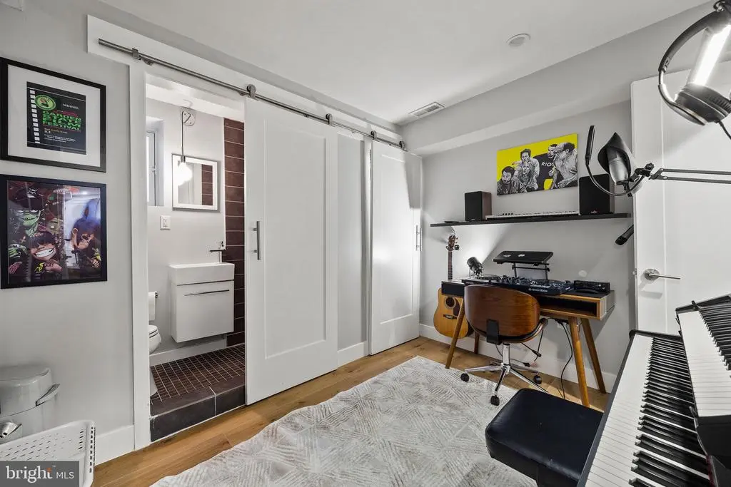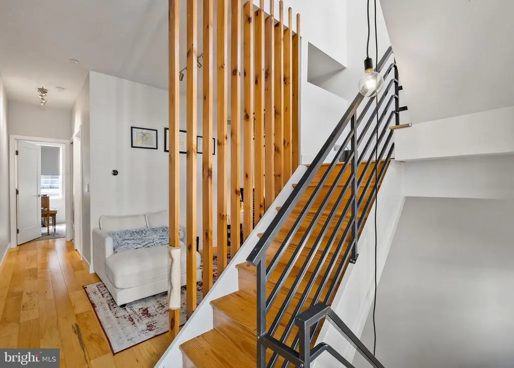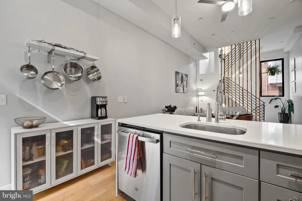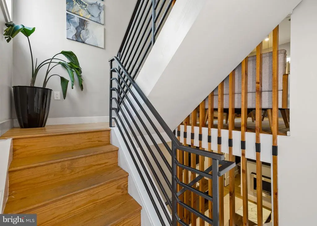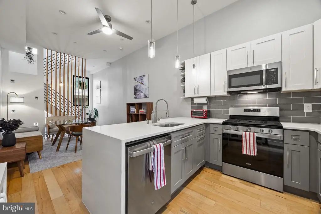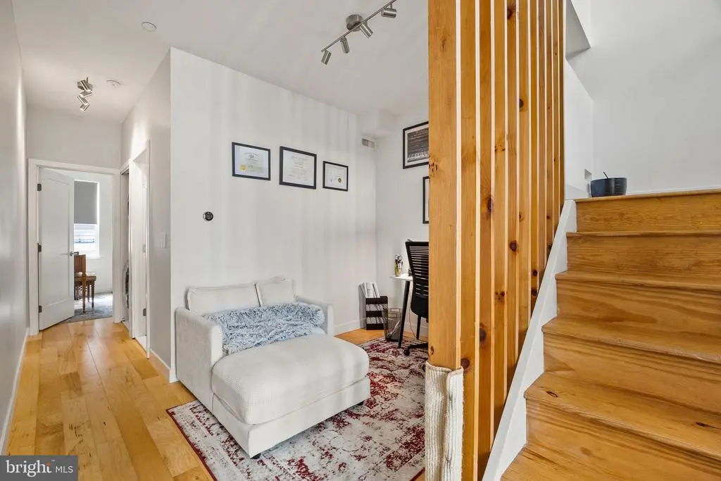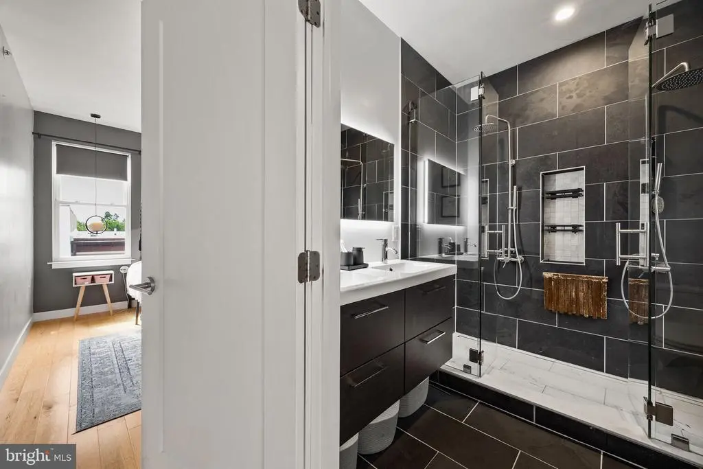 Tucked away on one of Northern Liberties’ most charming cobblestone blocks, 858 North Leithgow Street is a thoughtfully designed, architecturally significant home that’s truly one of a kind. Built in 2019, this contemporary 3 bedroom, 3 bathroom home makes a bold impact, with every inch of space carefully considered, with refined finishes, custom features, and an abundance of natural light throughout. The main level features extra high ceilings and a warm, open design. The living area has a custom wood architectural element that rises from floor to ceiling, dividing the sitting area from the staircase and connecting the floors above and below the main level in a playful yet compelling way. The kitchen is flooded with light from clerestory windows above and includes a peninsula with barstool seating, sleek cabinetry with built-in conveniences (spice rack, refuse, lazy susans), and stainless steel appliances. Just off the kitchen, a private backyard patio offers the perfect setup for morning coffee, outdoor dinners, or casual gatherings. The fully-finished lower level is a true extension of the home’s living space and includes a media room, a full bedroom, and a stylish open wet bath with tile floors and walls. Under a modern mantle in the media room, a fireplace with bioethanol heating adds a cozy touch and is included with the home. On the second floor, an open office area leads to a second bedroom, laundry, and an elegant full bath. The third-floor primary suite includes excellent closet space, a stunning full bath with dual vanities, sleek black tile, and a dual-head setup in an oversize shower. The third floor also provides access to an interior courtyard area. This unique, gravel-floored indoor-outdoor space connects to a spiral staircase that leads up to the private rooftop deck. The rooftop entertainment area is a true highlight, complete with a custom pergola and incredible views of Center City and the Ben Franklin Bridge. Whether you're entertaining or simply enjoying a quiet evening, this space is beautifully finished and easy to love. Additional highlights include hardwood floors throughout, central air, tankless hot water heating, ceiling fans in the bedrooms and living room, sliding closet doors, and a custom refuse and recycling enclosure at the front of the home. Window treatments, light fixtures, kitchen appliances, washer/dryer, gas grill, and bioethanol fireplace are all included in the sale, and 5 years remain on full tax abatement! This is not a typical row home—it's a smart, sophisticated space with tasteful design and creative use of every square foot. Every detail reflects the care, intention, and passion of the architect-owner who has brought to life a modern, warm residence as a model for urban living. Just steps from some of the best dining, coffee shops, markets, bars, and public transportation in Northern Liberties, 858 N Leithgow is a home you’ll love coming back to every day.