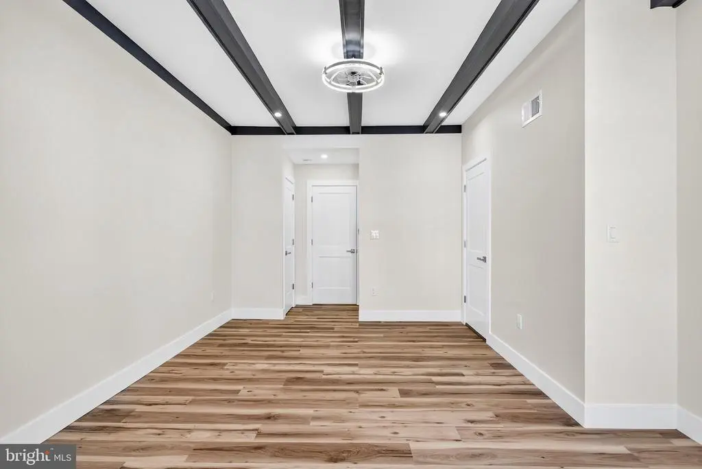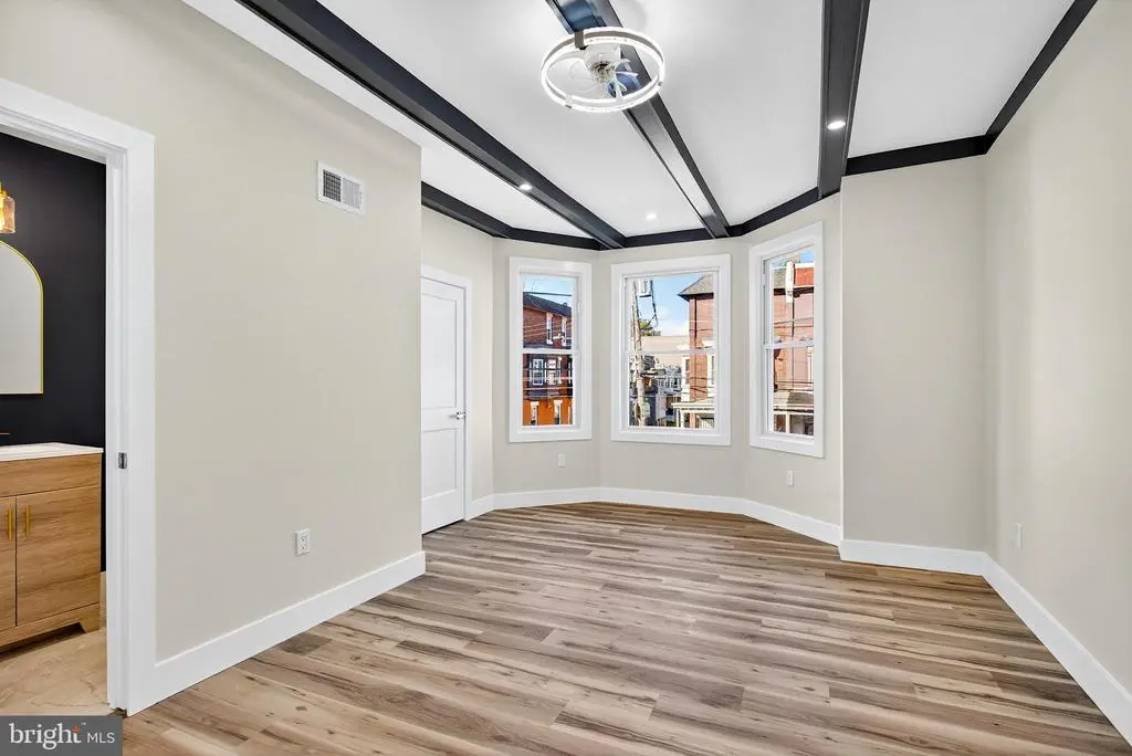 Bar, Ceiling Fan(s), Crown Moldings, Exposed Beams, Wood Floors