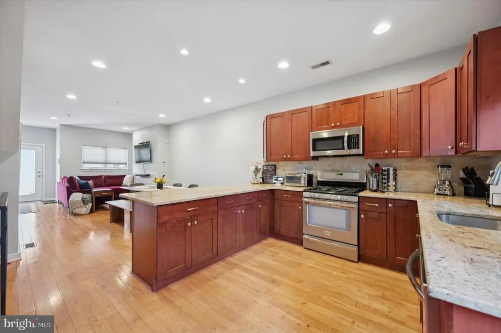 Step outside your door this fall/winter and experience the cozy charm of Manayunk — from warm lattes at local cafés and festive evenings at neighborhood bars to crisp walks along the canal and weekend brunch on Main Street. Perfectly positioned on a quiet, flat street, this modern end-unit townhome blends urban convenience with refined comfort. A rare find in the area, this residence features a private two-car driveway, classic brick façade, and soaring 9-foot ceilings. The open-concept main level showcases rich hardwood floors, a sun-splashed living room, and a chef-inspired kitchen featuring Frigidaire stainless steel appliances, granite countertops, subway-tile backsplash, new under-mount sink, Moen faucet, garbage disposal, and a spacious pantry. Step out to the balcony — ideal for cool-weather grilling or enjoying your morning coffee wrapped in a cozy sweater. The second floor hosts two spacious bedrooms with generous closets and abundant natural light. The shared full bathroom has been beautifully refreshed, featuring a modern vanity with ample storage, a deep soaking tub with a full tile surround, updated fixtures, and a neutral color palette that feels both elegant and timeless. A hidden laundry closet adds convenience to this level. The third-floor primary suite is a luxurious private retreat with a custom walk-in closet, spa-inspired bath with a stone-floor shower, and an adjoining terrace. A spiral staircase leads to the expansive rooftop deck, offering breathtaking 360° views—perfect for sunset happy hours, twinkling holiday lights, and snow-dusted cityscapes. The fully finished walk-out lower level has been thoughtfully remodeled for entertaining and comfort. It features a custom wet bar and a newly renovated full bathroom with a fully tiled shower and modern vanity—ideal for guests or an in-law setup. The lower level opens to a private courtyard, perfect for cozy fall fire pits or quiet winter evenings under the stars. Just minutes from Main Street’s boutique shops, award-winning restaurants, and seasonal events, this home offers easy access to I-76, Kelly Drive, and regional rail—only 20 minutes to Center City and 90 minutes to NYC or the Jersey Shore. Recent upgrades include a newer Lennox HVAC system, Smart Honeywell thermostat, Bradford White hot water heater, and a radon remediation system, combining efficiency, comfort, and lasting value. Welcome to 4128 Apple Street — where modern luxury meets cozy Manayunk living all year long.
