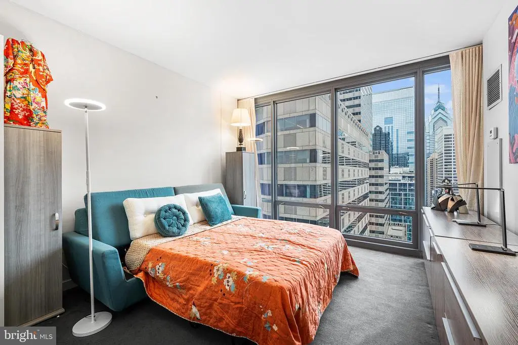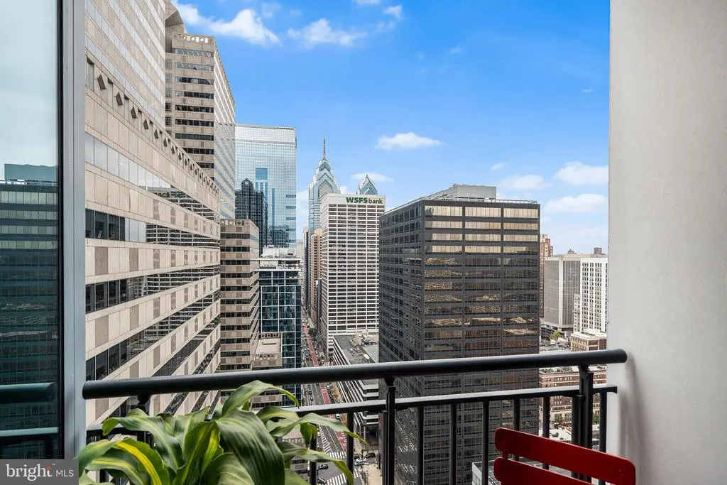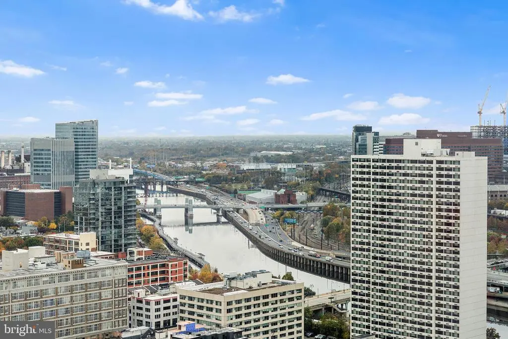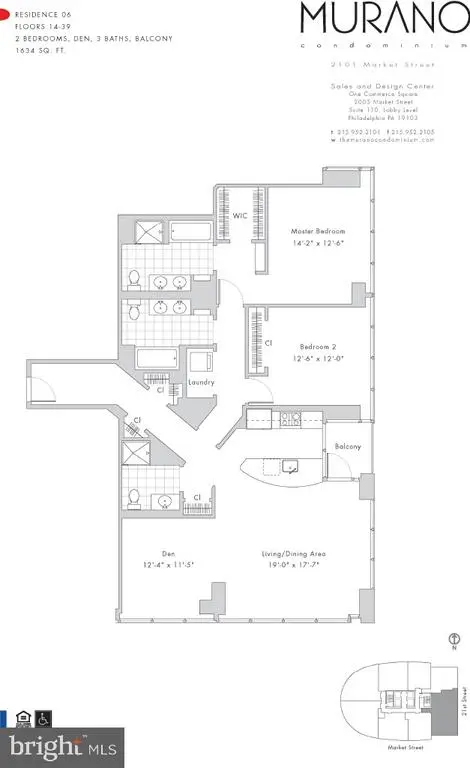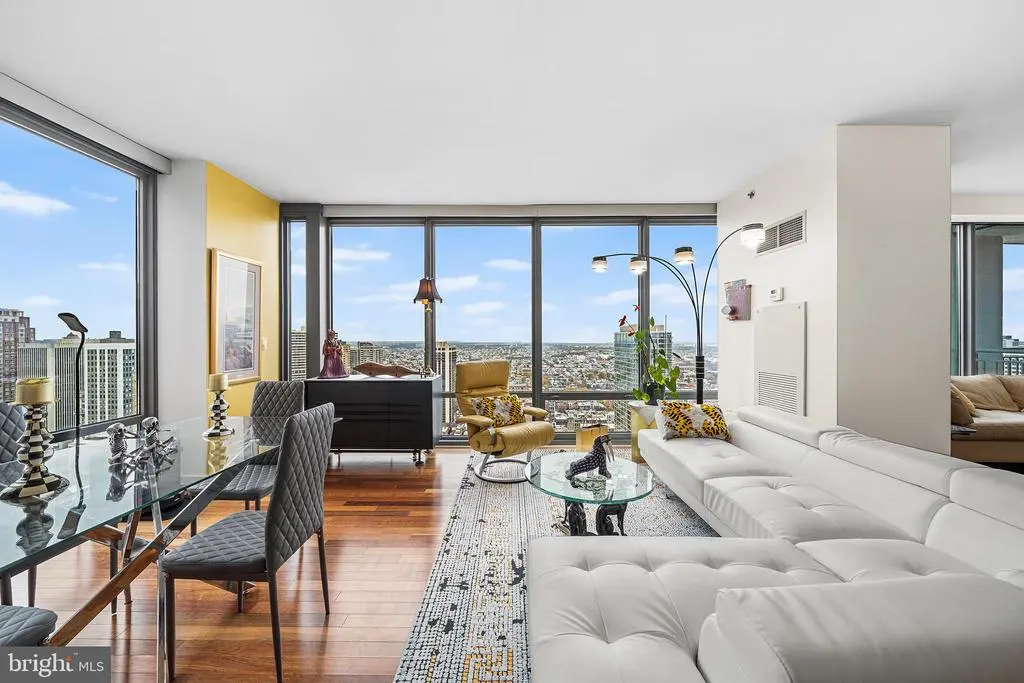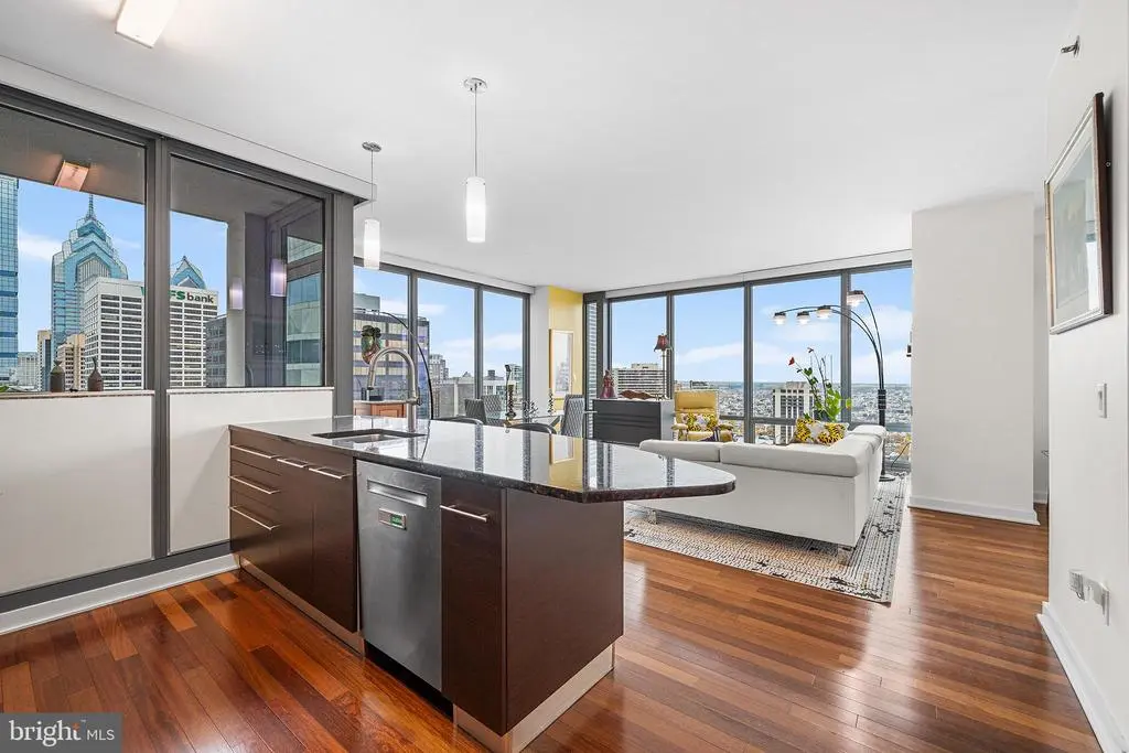 This sun-filled corner home offers two bedrooms plus a den off the living room, with glamorous sun filled southern views to the Schuylkill River and an eastern view stretching all the way to City Hall.The location of this home feels like you are literally perched over the street giving you that true Center City excitement. A gracious foyer welcomes you into rich flooring throughout, leading to an open kitchen with a window as well as a breakfast bar, granite counters, and stainless steel appliances. The spacious living and dining area is lined with dramatic floor-to-ceiling windows and the inviting balcony is conveniently situated off of the kitchen/dining area. The den, also wrapped in glass, includes a convenient full bathroom with a stall shower, while the well-sized second bedroom sits just across from the second full bathroom. The primary bedroom suite features generous closet space and a luxurious bathroom with both a soaking tub and a separate stall shower. The Murano is a full-service 24/7 doorman building, and this residence includes a coveted indoor garage parking space with direct lobby access.There is a full sized storage space on the 4th floor which is included in the sale as well. Residents enjoy an expansive community terrace, a fitness center, and a stunning indoor pool—all just steps from Trader Joe’s, excellent dining, and a short stroll to the elegance of Rittenhouse Square. (condo fee includes $45.00 per month for condo parking fee- parking space # 335 and storage #4056)