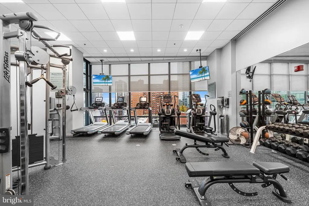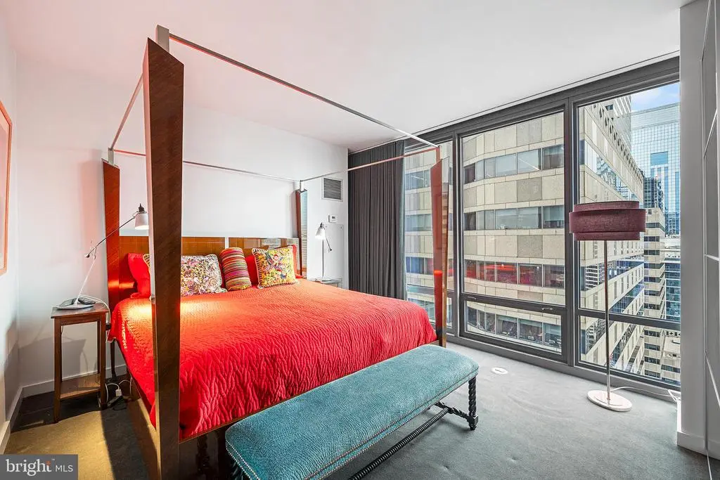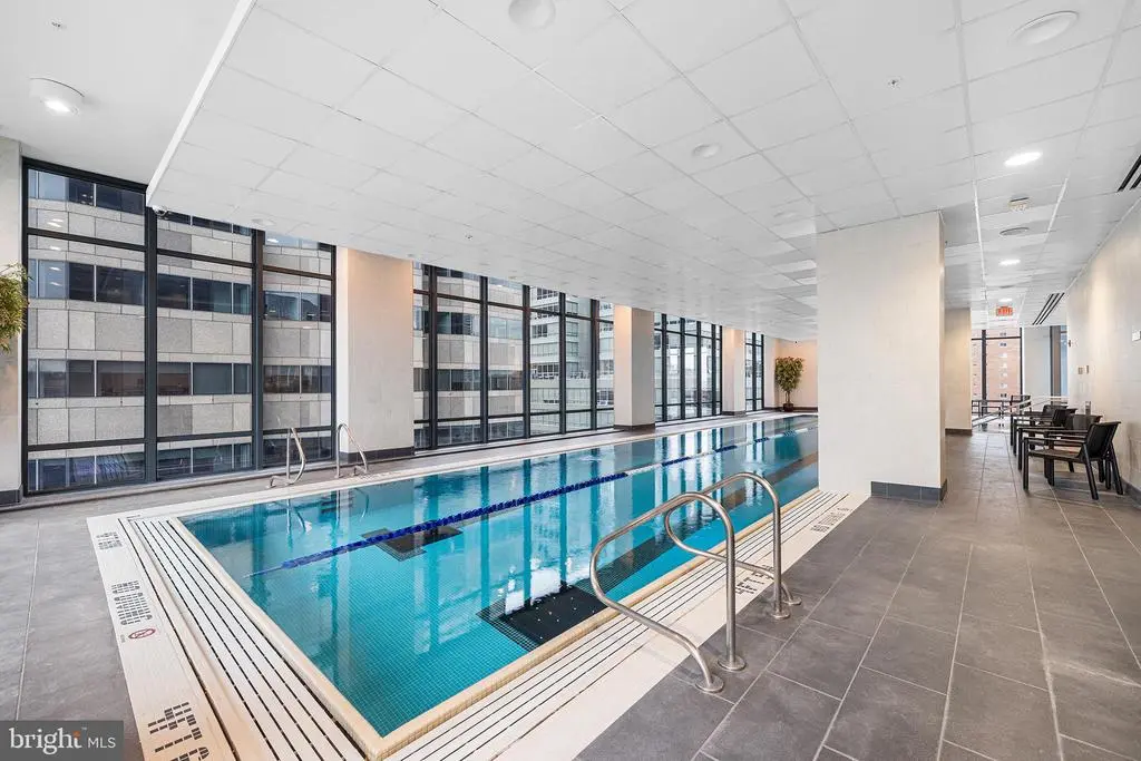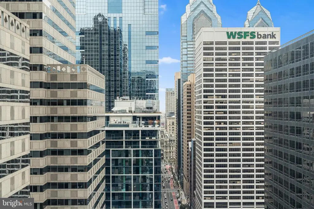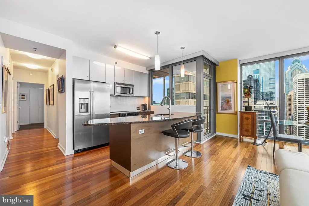 This sun-filled corner home offers two bedrooms plus a den off the living room, with glamorous sun filled southern views to the Schuylkill River and an eastern view stretching all the way to City Hall.The location of this home feels like you are literally perched over the street giving you that true Center City excitement. A gracious foyer welcomes you into rich flooring throughout, leading to an open kitchen with a window as well as a breakfast bar, granite counters, and stainless steel appliances. The spacious living and dining area is lined with dramatic floor-to-ceiling windows and the inviting balcony is conveniently situated off of the kitchen/dining area. The den, also wrapped in glass, includes a convenient full bathroom with a stall shower, while the well-sized second bedroom sits just across from the second full bathroom. The primary bedroom suite features generous closet space and a luxurious bathroom with both a soaking tub and a separate stall shower. The Murano is a full-service 24/7 doorman building, and this residence includes a coveted indoor garage parking space with direct lobby access.There is a full sized storage space on the 4th floor which is included in the sale as well. Residents enjoy an expansive community terrace, a fitness center, and a stunning indoor pool—all just steps from Trader Joe’s, excellent dining, and a short stroll to the elegance of Rittenhouse Square. (condo fee includes $45.00 per month for condo parking fee- parking space # 335 and storage #4056)