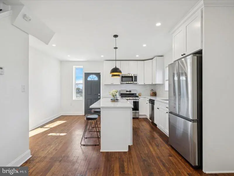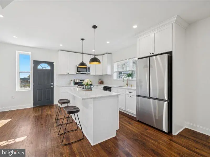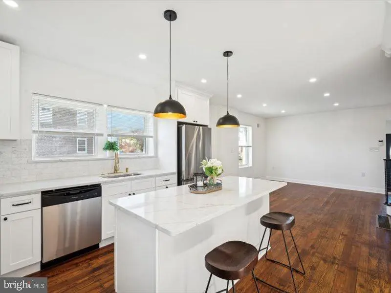 Beautifully renovated end-of-row home in Southwest Philly! This bright and spacious 3 bedroom, 1.5 bath property sits on a corner lot and offers extra windows and natural light throughout. The open main level features refinished hardwood floors, a modern kitchen with shaker cabinets, quartz counters, stainless steel appliances, and a large island perfect for gathering. A convenient powder room is located on the main level, along with a built-in mudroom drop-off zone in the enclosed front porch—ideal for everyday organization. Upstairs you’ll find three generous bedrooms and a beautifully updated full bath. The clean, painted basement offers great storage or future finishing potential. Enjoy a freshly landscaped yard and easy access to public transportation, parks, shopping, and the airport. Move-in ready and ready to call home!