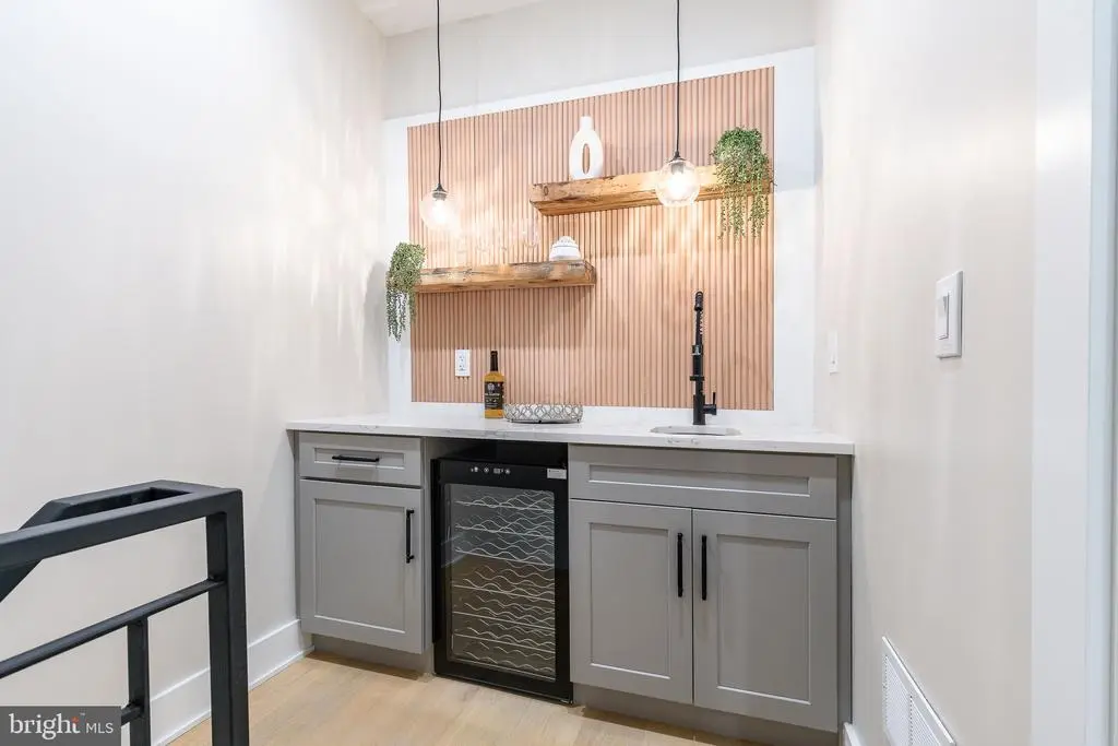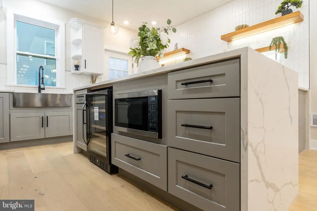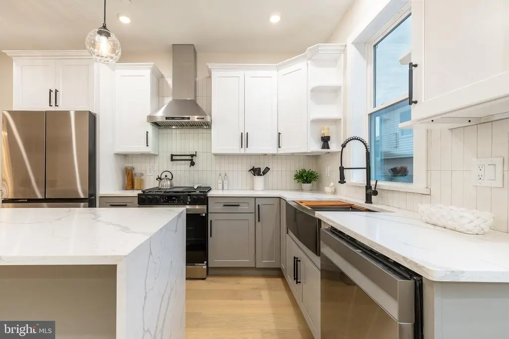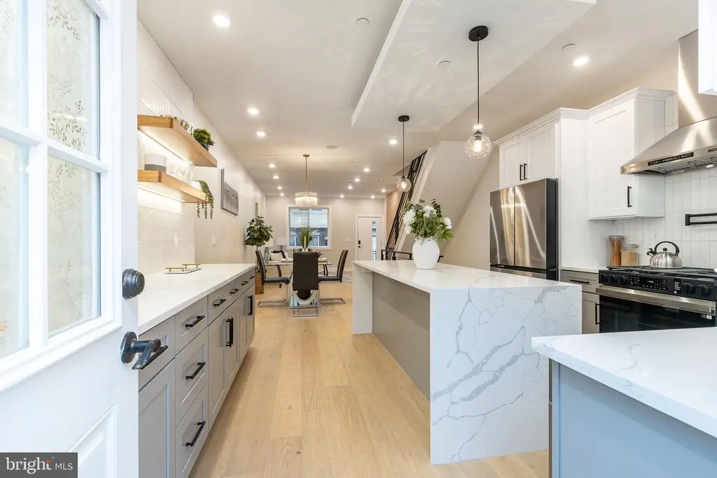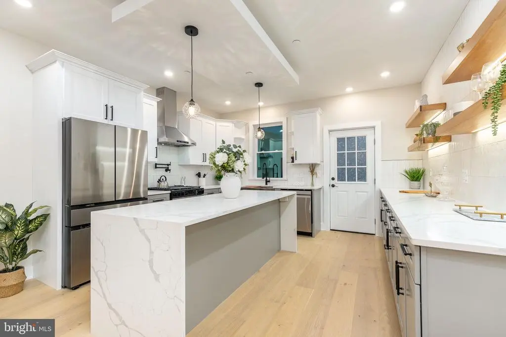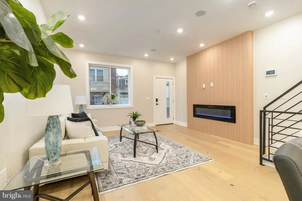 This modern new construction comes with a 10 year tax abatement and 1 year builder's warranty. Welcome to your dream home in the heart of Dickinson Narrows! This stunning new construction residence offers 4 bedrooms, 3 full bathrooms, and a perfect blend of modern luxury and thoughtful design. Step inside to find an open-concept layout featuring beautiful hardwood floors, custom railings, and built-in speakers in both the living room and primary suite. The spacious living area also showcases an electric fireplace, creating the perfect ambiance for relaxing or entertaining. The chef’s kitchen is a showstopper — complete with a large island featuring a quartz waterfall countertop, built-in microwave, and wine cooler. Above the gas range you will find a pot filler, and an impressive tiled backsplash. The Samsung stainless steel appliances, abundant storage, elegant floating shelves, and two-tone shaker cabinetry make this kitchen both stylish and functional. From the kitchen, step out to your private backyard — an ideal space for grilling or enjoying quiet evenings outdoors. The finished basement offers incredible flexibility, featuring a full bedroom, full bathroom, and a bonus room perfect for a home office, gym, or playroom. Upstairs, the second floor includes two spacious bedrooms with generous closets and a beautifully designed bathroom with a walk-in shower and built-in bench. At the top of the third floor, you’ll find a convenient wet bar with a second wine cooler — perfect for entertaining or preparing drinks before heading up to the rooftop deck. The primary suite is a private retreat, offering a spacious bedroom with built-in speakers, dual closets, and a spa-inspired bathroom complete with a soaking tub, double vanity, and expansive walk-in shower. Enjoy panoramic views of the city and neighborhood from your roof deck, the perfect spot for relaxing or hosting gatherings. Additional features include a white brick exterior, security system with exterior cameras, and high-end finishes throughout. Located in desirable Dickinson Narrows, this home combines modern comfort, convenience, and timeless style — just minutes from neighborhood favorites, parks, and everything South Philadelphia has to offer.