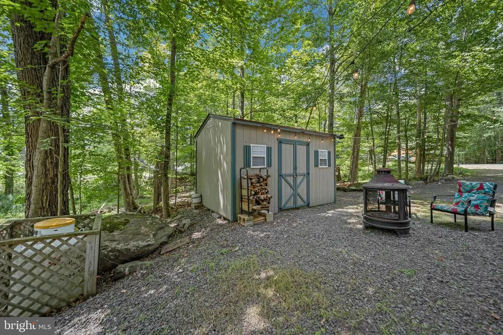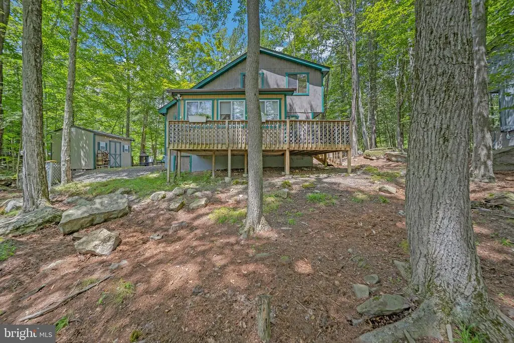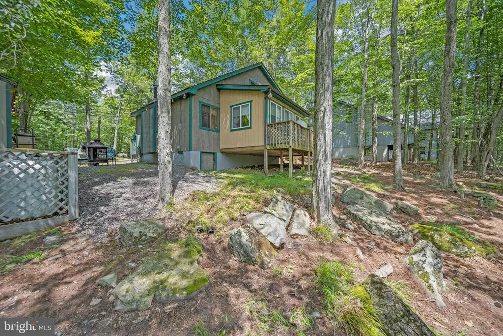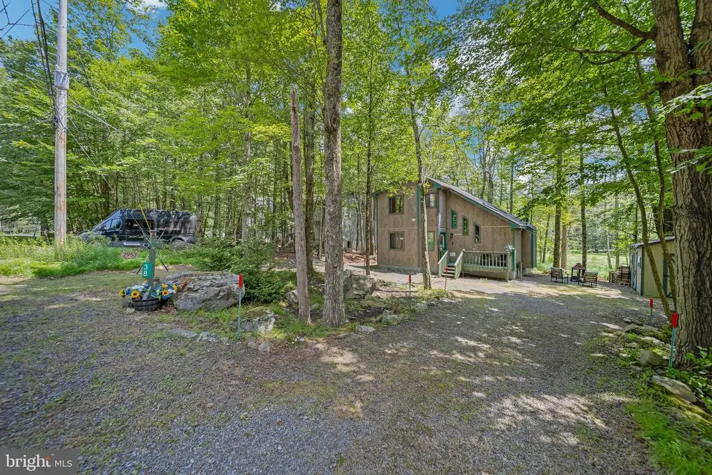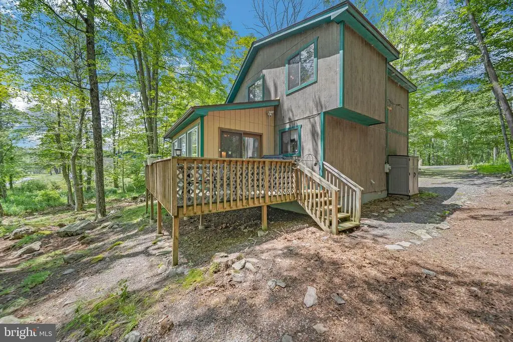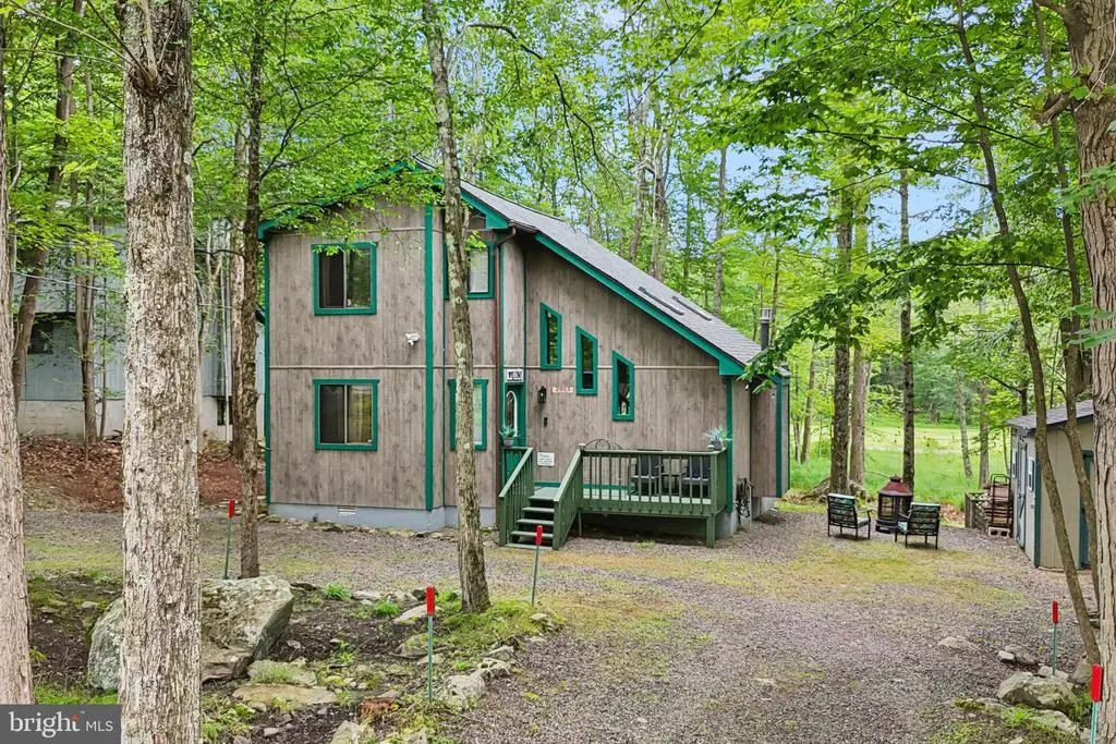 Location! Location! Location! Best words meant to describe this house situated next to a wooded area with natural stream, backing to the 1st hole of the private golf course and just steps from the clubhouse restaurant/bar and sports activities center. This thoughtfully updated Saltbox-Style home features 3-bedrooms and 2 full baths, is set on a wooded lot with a natural stream and a Brand-New roof (Nov. 2024) with architectural shingles and Two New skylights are just a few updates. Finished shed with insulation, propane heat, and vinyl flooring makes a great bonus space for a tiki bar, office or hobby room! The Horseshoe driveway provides ample off street parking. Fresh paint throughout the interior, new vinyl plank flooring (100% waterproof) in the foyer, kitchen, and baths, and a thermostat-controlled propane fireplace. The kitchen boasts Corian countertops, a brand-new over-the-range microwave, and a large pantry. The main level includes a spacious bedroom and an updated full bath. Enjoy the newer 4-season room with vaulted ceilings, abundant natural light and access to a private rear deck - perfect for relaxing in nature or entertaining with guests. Upstairs are two more bedrooms, including a large primary bedroom with a custom wood vaulted ceiling, and double closets. Also upstairs is a fully renovated bath with a spacious tiled shower and granite bench and a quaint nook in the hall currently used with a nostalgic letter writing desk. The Hideout offers 4 seasons of activities and events all while 38 N Fairway provides seclusion, charm. This home is being sold turn-key and furnished for immediate enjoyment with unbeatable access to recreation, shopping and Pocono attractions. Vacation getaway or Home in the mountains come see for yourself and decide!