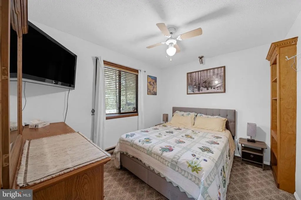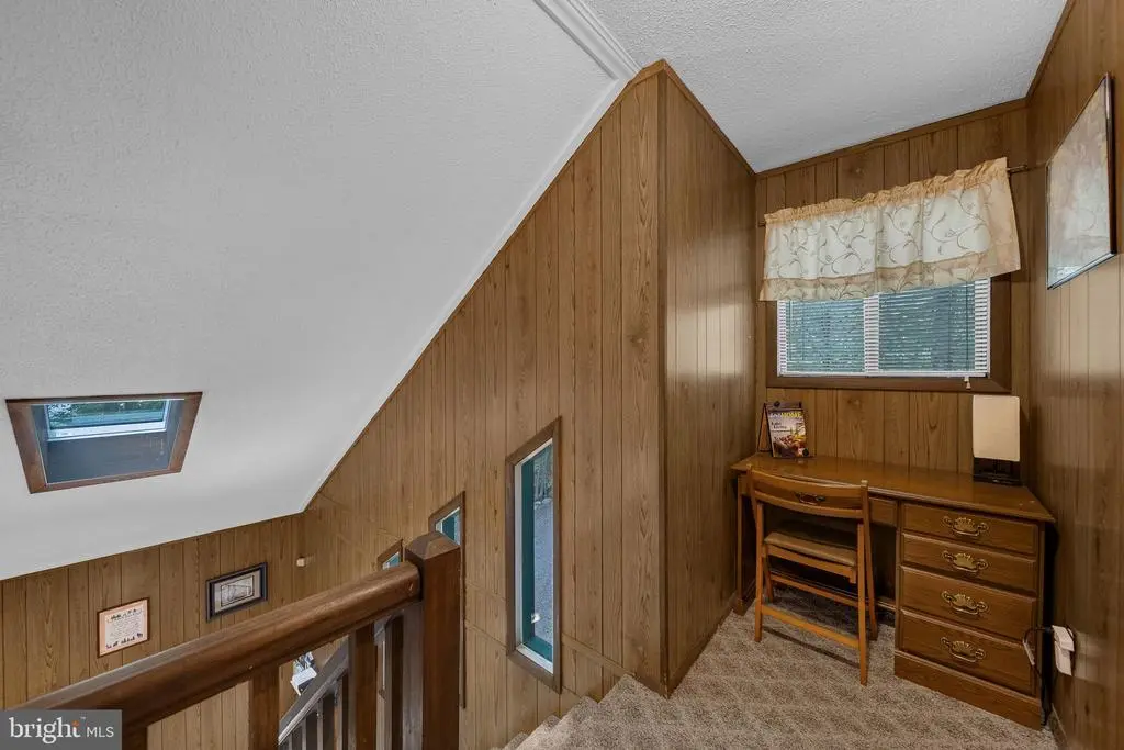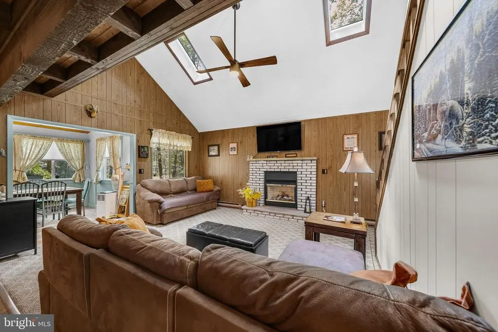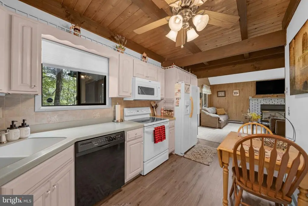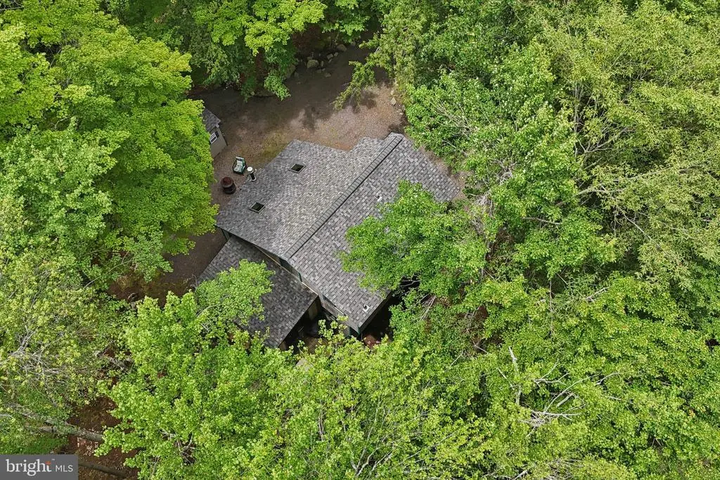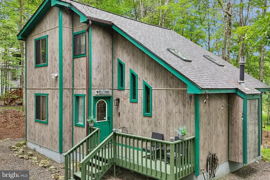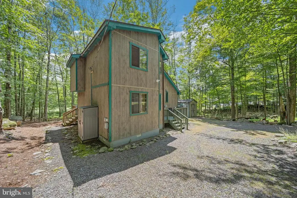 Location! Location! Location! Best words meant to describe this house situated next to a wooded area with natural stream, backing to the 1st hole of the private golf course and just steps from the clubhouse restaurant/bar and sports activities center. This thoughtfully updated Saltbox-Style home features 3-bedrooms and 2 full baths, is set on a wooded lot with a natural stream and a Brand-New roof (Nov. 2024) with architectural shingles and Two New skylights are just a few updates. Finished shed with insulation, propane heat, and vinyl flooring makes a great bonus space for a tiki bar, office or hobby room! The Horseshoe driveway provides ample off street parking. Fresh paint throughout the interior, new vinyl plank flooring (100% waterproof) in the foyer, kitchen, and baths, and a thermostat-controlled propane fireplace. The kitchen boasts Corian countertops, a brand-new over-the-range microwave, and a large pantry. The main level includes a spacious bedroom and an updated full bath. Enjoy the newer 4-season room with vaulted ceilings, abundant natural light and access to a private rear deck - perfect for relaxing in nature or entertaining with guests. Upstairs are two more bedrooms, including a large primary bedroom with a custom wood vaulted ceiling, and double closets. Also upstairs is a fully renovated bath with a spacious tiled shower and granite bench and a quaint nook in the hall currently used with a nostalgic letter writing desk. The Hideout offers 4 seasons of activities and events all while 38 N Fairway provides seclusion, charm. This home is being sold turn-key and furnished for immediate enjoyment with unbeatable access to recreation, shopping and Pocono attractions. Vacation getaway or Home in the mountains come see for yourself and decide!