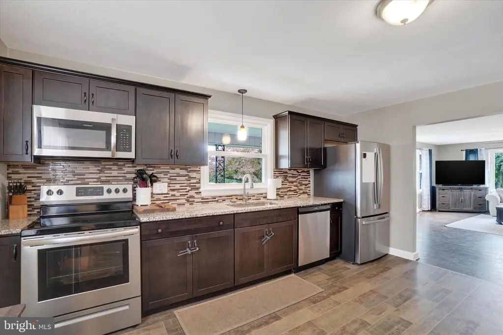 This lovely brick rancher was remodeled thruout in 2019, including new widows, furnace & central AC! Beautiful new kitchen with granite counters & mosaic tile backsplash! New bathroom with ceramic tile tub surround & solid surface vanity! Nice wood floors in the living room & bedrooms. Recently finished attic added a third bedroom! Basement is unfinished but with floor & walls painted, is great for a playroom or TV room. With a new water heater in 2023 & a new roof in late 2024, there's nothing else to do but move into your new home! There's a great yard, front porch or the covered breezeway to relax outside. The garage with driveway for additional off-street parking. tops it off!