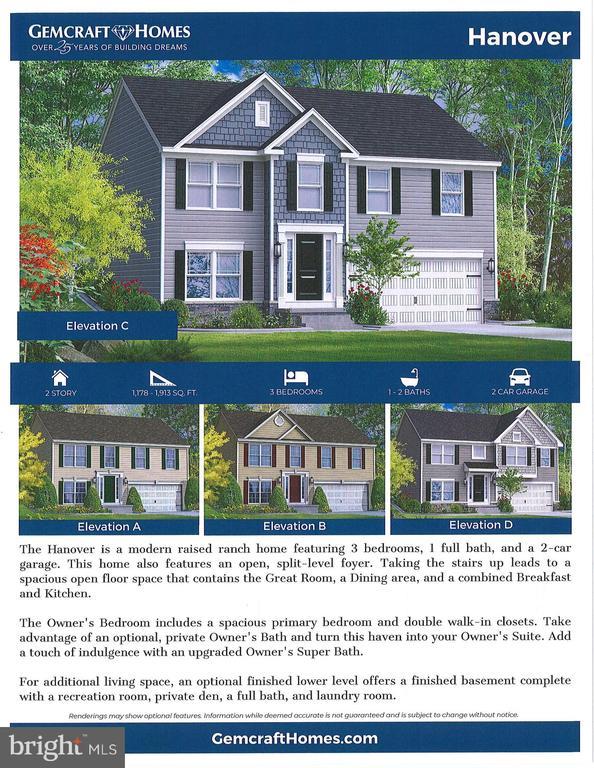 The Hanover is a modern raised ranch home featuring 3 bedrooms, 1 plus baths, and a 2-car garage. Offered by Gemcraft Homes New Construction. This home also features an open, split level foyer. Spacious open floor space that contains the Great Room, a Dining area, and a combined Breakfast and Kitchen with an optional island. The owner's suite includes 2 walk-in closets, and an optional luxury bath. This home also offers a a two-car garage and a 4' conditioned crawl space that can be used for extra storage. Home is TO BE BUILT. Call today for a private showing