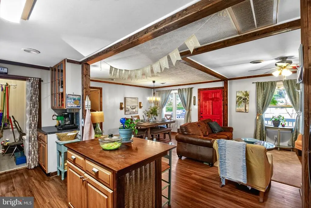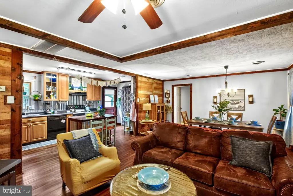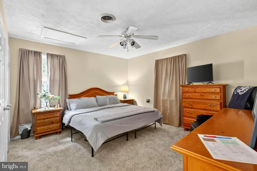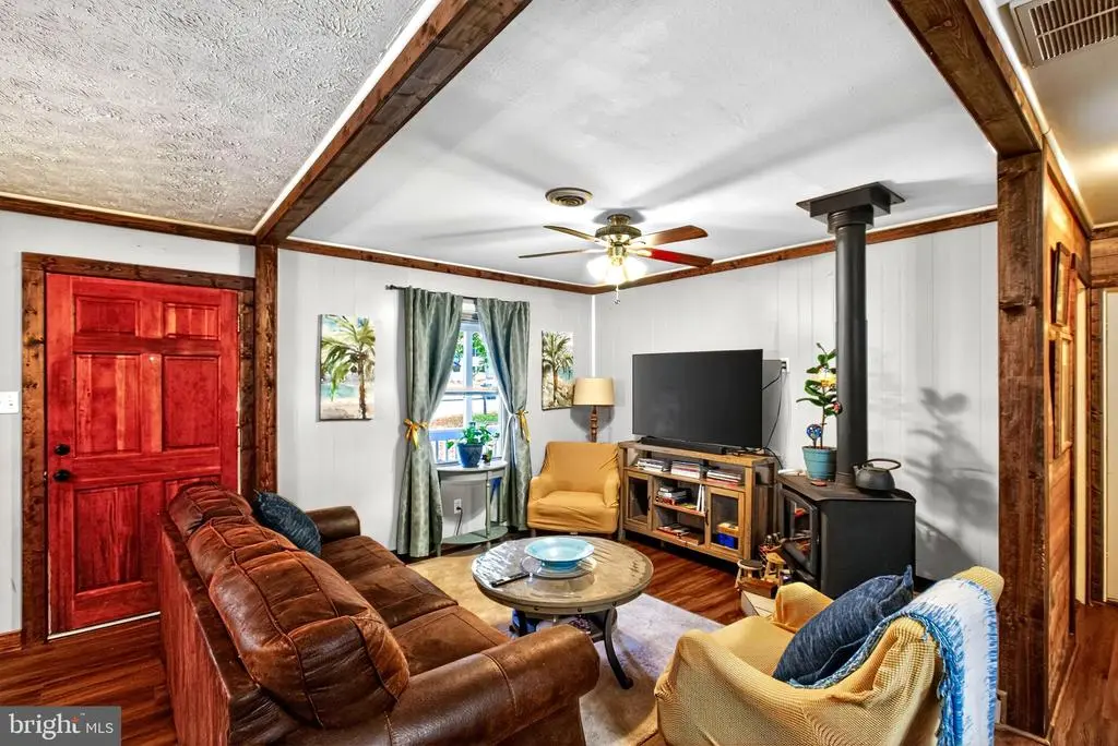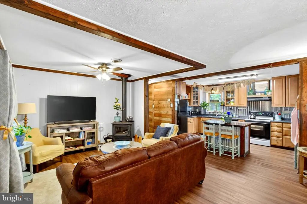 Carpet, Ceiling Fan(s), Entry Level Bedroom, Exposed Beams, Primary Bath(s), Stove - Wood