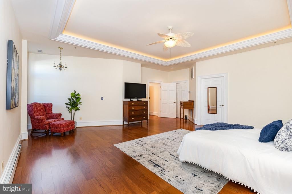 Welcome to 913B Caroline Street, a rare and luxurious condominium in the heart of historic downtown Fredericksburg with 4200+ square feet. Caroline Street has long been one of Fredericksburg’s principal downtown corridors—once the town’s main retail and commercial streets, and today part of the city’s treasured National Historic District. In the late 20th and early 21st centuries, downtown saw a thoughtful mix of preservation and selective new construction, designed to revitalize the area while maintaining its historic character. The development at 913 Caroline Street, completed in 2007, is a prime example of this approach: a contemporary, large-footprint condominium built into the historic fabric of the street. While not an 18th- or 19th-century structure itself, it reflects Fredericksburg’s commitment to combining preservation with carefully scaled new design to enhance downtown living. Within this boutique building of only three private residences, 913B is one of the city’s largest condominium homes. Perfectly positioned on the second floor, it offers stunning winter views of the Rappahannock River and a front-row seat to the energy of downtown. Enter through the private door either on Caroline Street, or from Sophia St near the private parking garage. Once inside the secure main entrance, enjoy a quick elevator ride to your floor. A wide hallway leads to the front door where a gracious entry sets the tone with 10’ ceilings. Inside, the center hallway is lined with cherry built-in bookshelves, perfect for displaying artwork, guiding you into the heart of this exceptional home. The layout includes two primary suites, each with big walk-in closets. The two large bedrooms share a hallway creating their own wing - the hallway between the rooms leads to a large spa-like bath with shower and soaking tubs. Dual sinks are back to back, so there's plenty of storage space, too. Both rooms have tray ceilings and custom lighting. Across the main hall on the opposite side, is a third bedroom with an en-suite bathroom for guests or family, creating privacy and plenty of space for everyone. Beyond the bedrooms, the residence opens into a magnificent entertainment and living space. A music alcove provides the perfect spot for a piano or reading nook. Expansive windows and glass doors frame treetop views of the riverbank, opening onto a full-length balcony ideal for morning coffee or evening sunsets. A dedicated home office with more cherry built-ins offers flexibility for work, a den, or even a potential fourth bedroom. The airy kitchen features granite counters, a butcher's block, a central island, and abundant cabinetry, with a cozy sitting area that doubles as a breakfast nook. A large pantry just off the kitchen provides shelving, a sink, laundry, prep space, and additional storage. At the rear of the building, residents enjoy secure, gated garage access with two assigned parking spaces, visitor spots, elevator service, and convenient street entry. With just three residences in the building, opportunities to own here are exceedingly rare. More than a home, 913B Caroline Street offers a carefree lifestyle in a historic riverfront town, within easy walking distance of the Virginia Railway Express, restaurants, boutiques, coffee shops, art galleries, and the riverfront park.