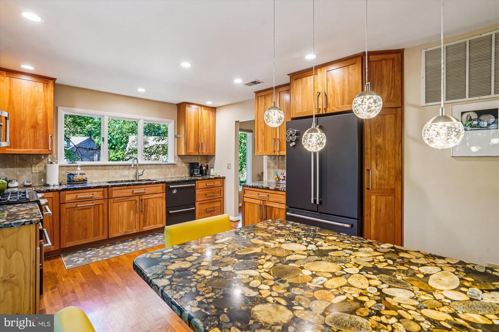 Significant price adjustment. Welcome home to where modern taste and style reign. This magnificent and updated home will draw you in and entice you to live expansively with it's move-in ready open floor-plan and meticulously curated space. Entertain in style with a generously sized dining room that adjoins a large, beautifully updated kitchen that begs for your inner chef to come out. With all wood cabinets, double ovens, stylish appliances, and the most gorgeous countertops, even the most discerning chefs would be in their element. Two sets of sliders from the family room and kitchen lead you out to a full-length deck that creates a perfect outdoor space to enjoy the yard, which is lined with mature trees. The front-facing living room showcases cathedral ceilings, skylights, and a gas fireplace. There is also a stunning half-bath on the main level. The all wood floors throughout the main floor continue upstairs along with the custom window treatments, where you will find the large primary with a wall of windows and 3 custom-finished closets. The beautiful primary bath features striking tile in the expanded shower and offers even more storage. Another full bath and two more generously-sized bedrooms – both with tons of closet space – complete the upper level. The lower level has an enormous finished flex space that would make the perfect rec room, gym, 4th bedroom, or office. There's even a rough-in for another bath! The ample laundry/utility room and oversized 2-car garage also offer room to grow. Local shops, restaurants, parks, and schools are a short walk from this home, so you can easily enjoy all that historic Fairfax City has to offer.