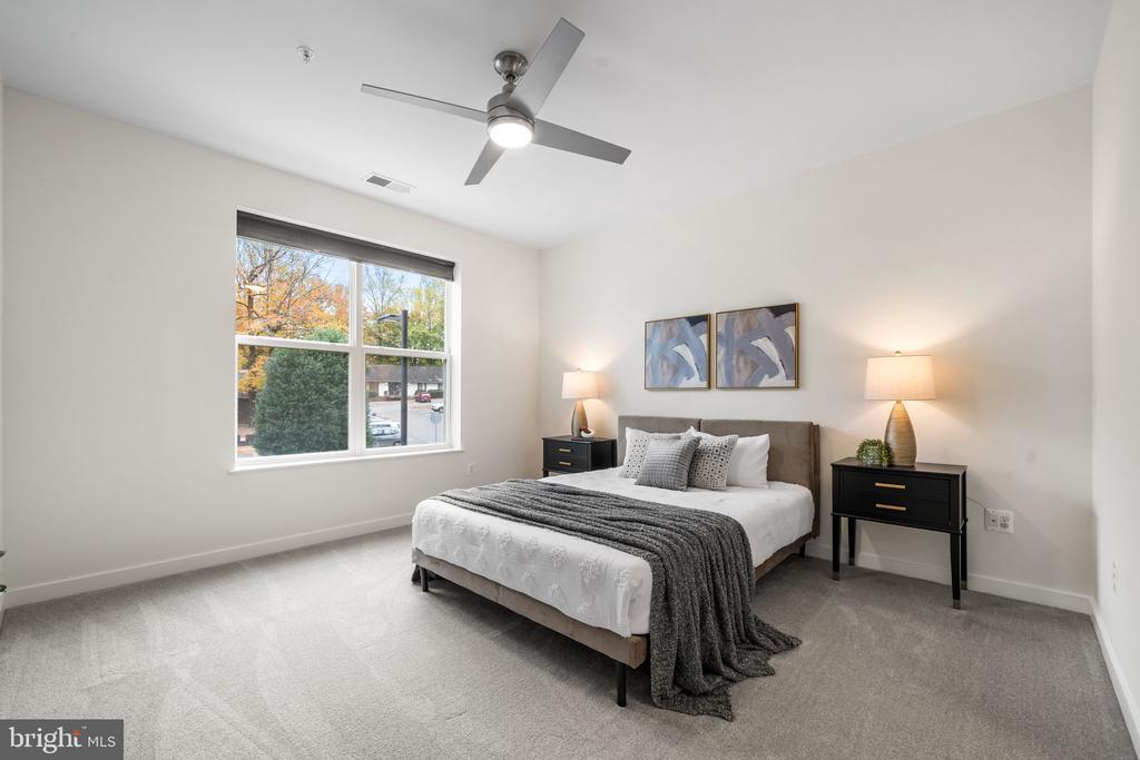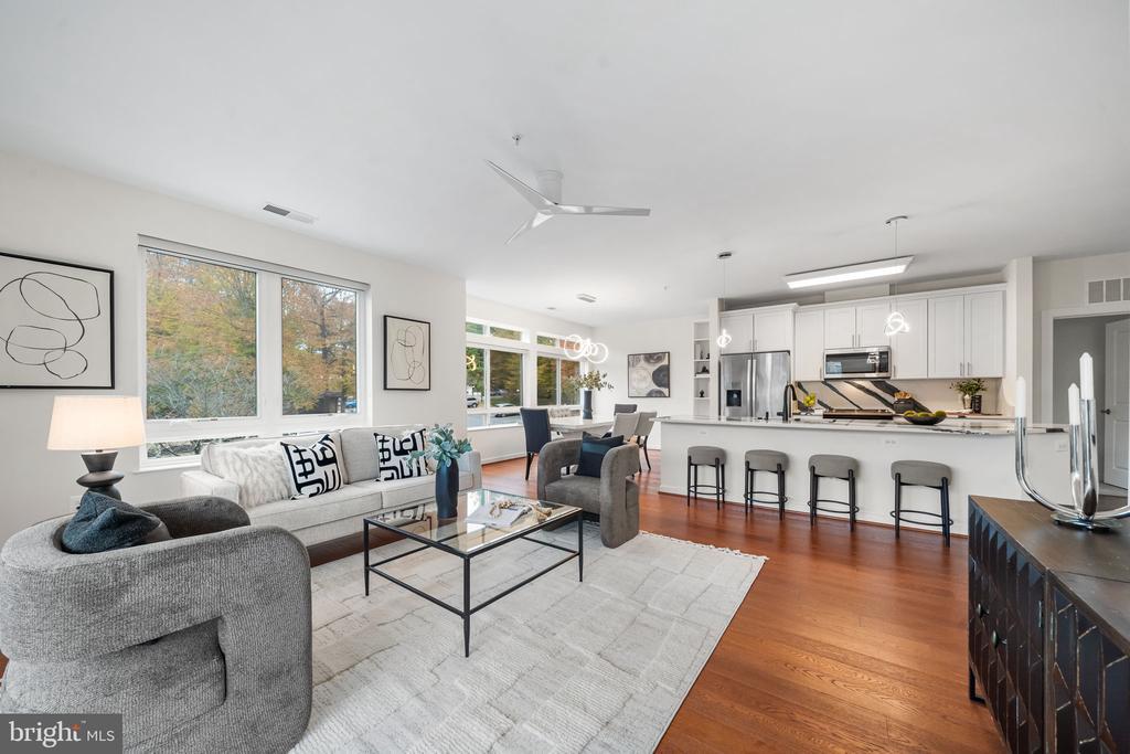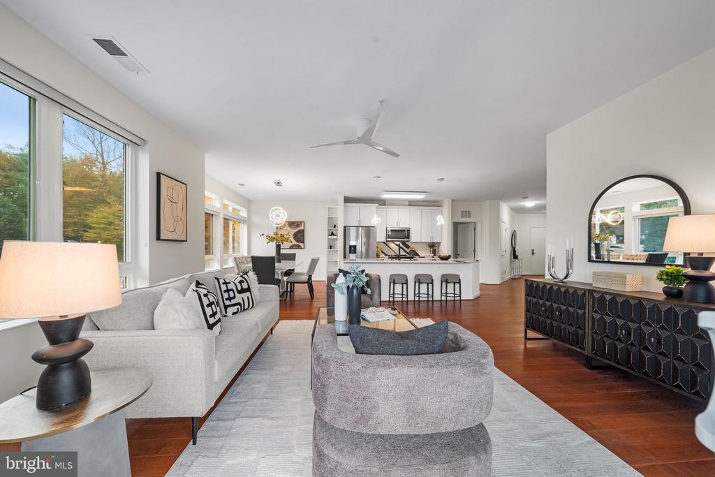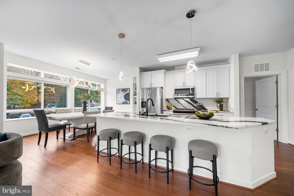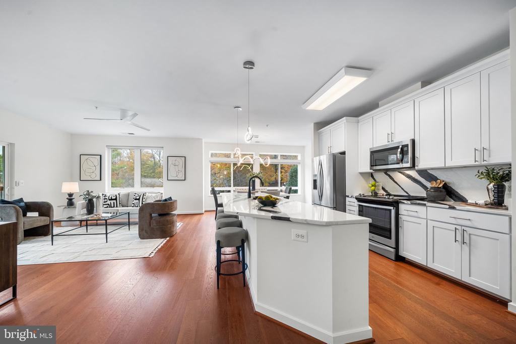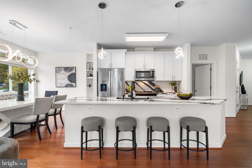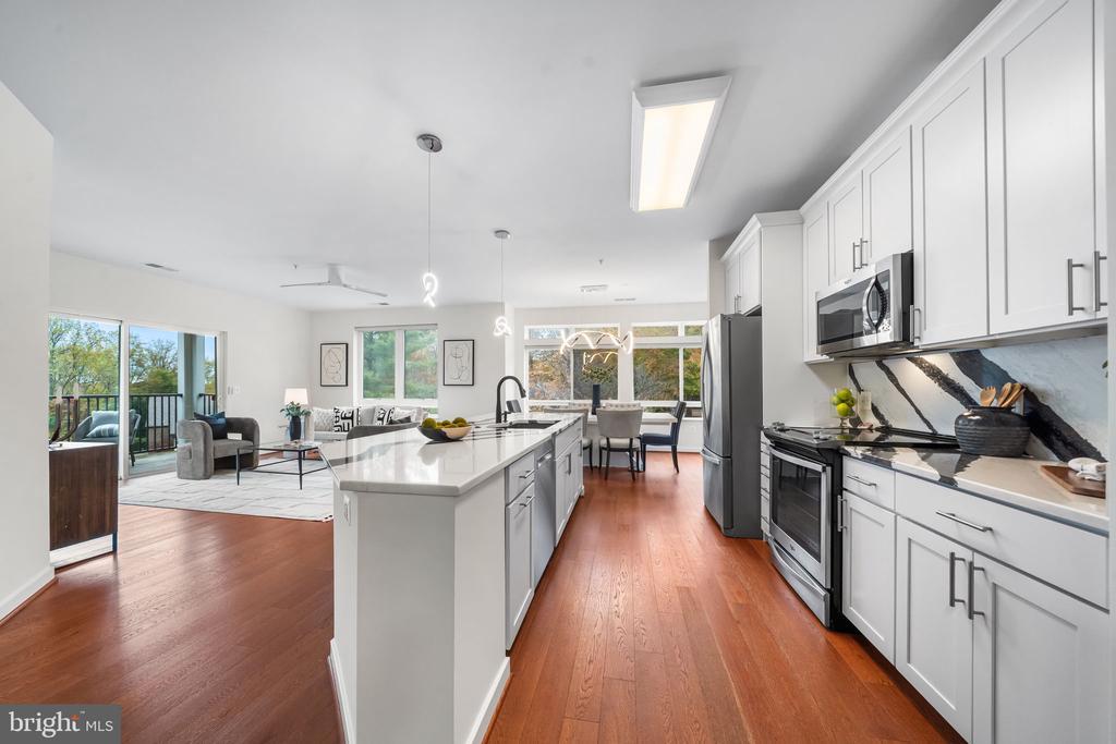 Welcome home to 9450 SILVER KING COURT, #202--contemporary luxury living in the heart of Fairfax City! This stunning 3-bedroom, 2-bath corner unit condo is a hidden sanctuary offering a perfect blend of modern elegance and everyday convenience. The open floor plan is filled with natural light and finished with sleek hardwood floors throughout the main living spaces. The gourmet kitchen impresses with refined quartz countertops, large island with seating, 42-inch upgraded white shaker cabinets, and stainless steel appliances—ideal for both cooking and entertaining. The spacious living and dining area features large windows overlooking peaceful greenery, creating a private and tranquil retreat. Enjoy outdoor views as you relax on your spacious balcony. The primary suite boasts an expansive walk-in closet plus two additional closets for ample storage. Its spa-inspired en-suite bath features a dual-sink vanity, walk-in shower, and custom built-ins for a truly relaxing experience. Two additional bedrooms feature brand-new carpet and share a beautifully finished full bath. The home also includes a full-size washer and dryer for added convenience. Additional highlights include a private locked storage unit directly across from the condo, an assigned parking space in the secure underground garage, and a dedicated bike storage area. THE ENCLAVE community residents enjoy access to premium amenities, including a tastefully designed lobby, a fully equipped fitness center, and a beautifully appointed club room with a gourmet kitchen—perfect for hosting larger gatherings. All this in an unbeatable location—steps from Fairfax City grocery stores, shops, gyms, and restaurants, with easy access to Routes 50, 66, 29, and I-495, minutes from the Vienna Metro plus George Mason University and City parks. Experience the best of modern living and urban convenience at 9450 Silver King Ct #202—a truly exceptional place to call HOME!