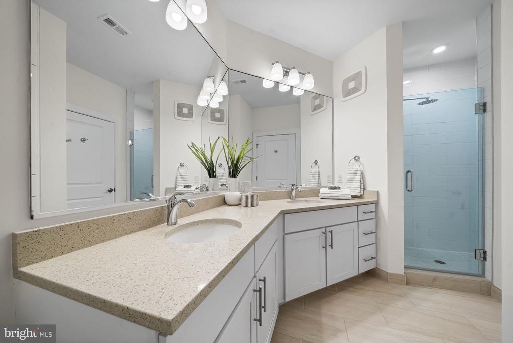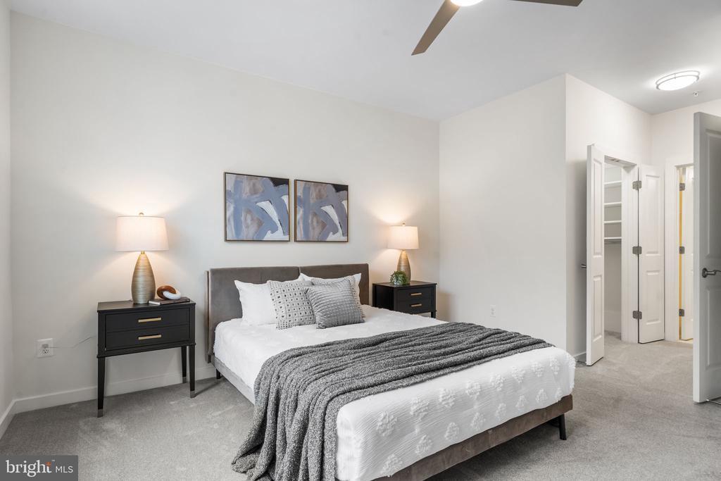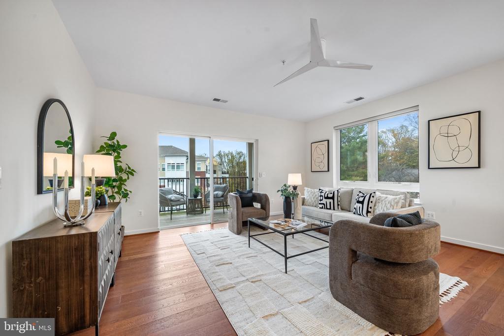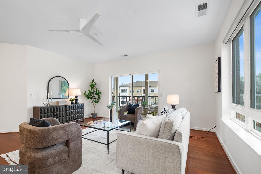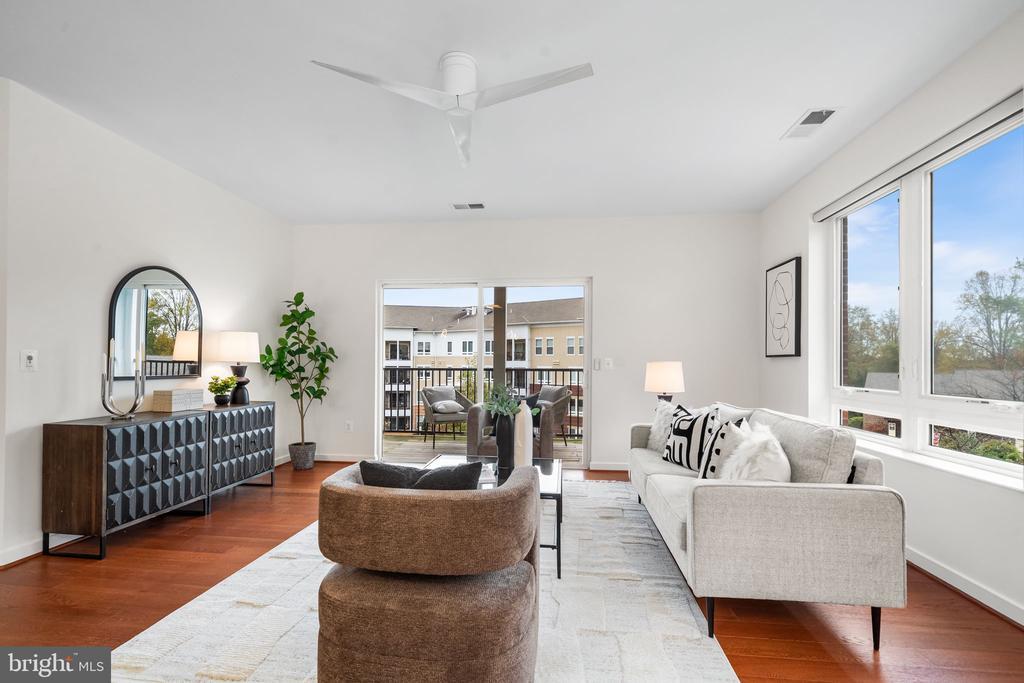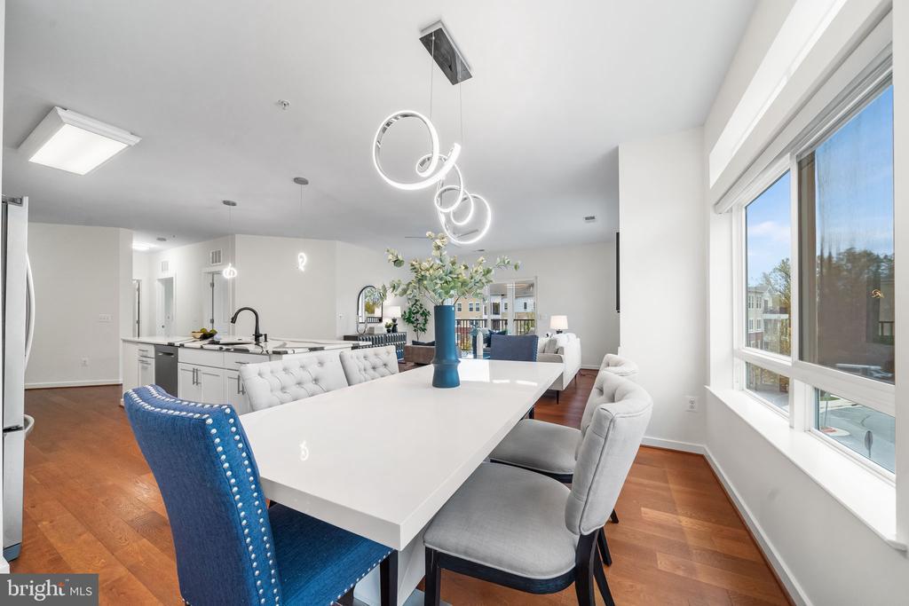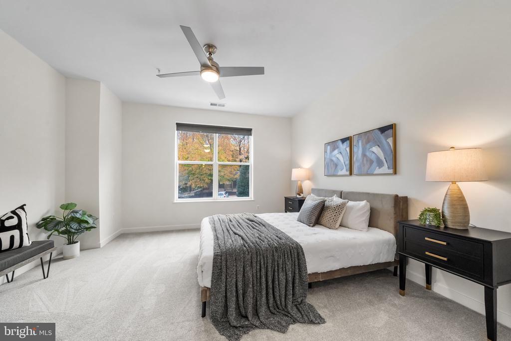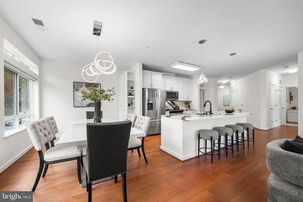 Welcome home to 9450 SILVER KING COURT, #202--contemporary luxury living in the heart of Fairfax City! This stunning 3-bedroom, 2-bath corner unit condo is a hidden sanctuary offering a perfect blend of modern elegance and everyday convenience. The open floor plan is filled with natural light and finished with sleek hardwood floors throughout the main living spaces. The gourmet kitchen impresses with refined quartz countertops, large island with seating, 42-inch upgraded white shaker cabinets, and stainless steel appliances—ideal for both cooking and entertaining. The spacious living and dining area features large windows overlooking peaceful greenery, creating a private and tranquil retreat. Enjoy outdoor views as you relax on your spacious balcony. The primary suite boasts an expansive walk-in closet plus two additional closets for ample storage. Its spa-inspired en-suite bath features a dual-sink vanity, walk-in shower, and custom built-ins for a truly relaxing experience. Two additional bedrooms feature brand-new carpet and share a beautifully finished full bath. The home also includes a full-size washer and dryer for added convenience. Additional highlights include a private locked storage unit directly across from the condo, an assigned parking space in the secure underground garage, and a dedicated bike storage area. THE ENCLAVE community residents enjoy access to premium amenities, including a tastefully designed lobby, a fully equipped fitness center, and a beautifully appointed club room with a gourmet kitchen—perfect for hosting larger gatherings. All this in an unbeatable location—steps from Fairfax City grocery stores, shops, gyms, and restaurants, with easy access to Routes 50, 66, 29, and I-495, minutes from the Vienna Metro plus George Mason University and City parks. Experience the best of modern living and urban convenience at 9450 Silver King Ct #202—a truly exceptional place to call HOME!
