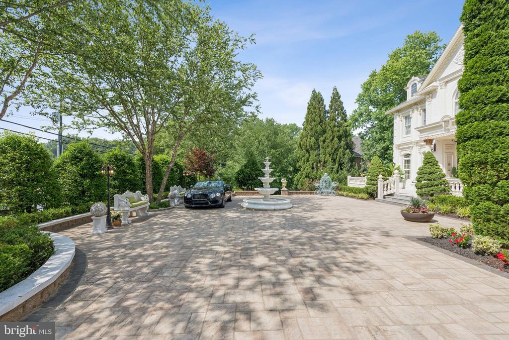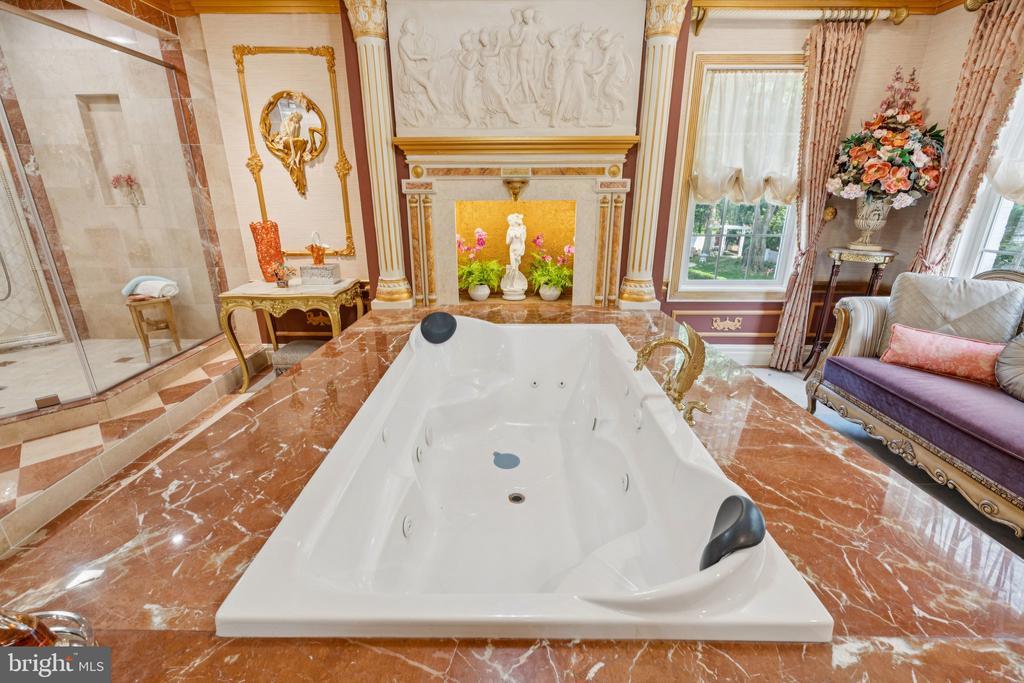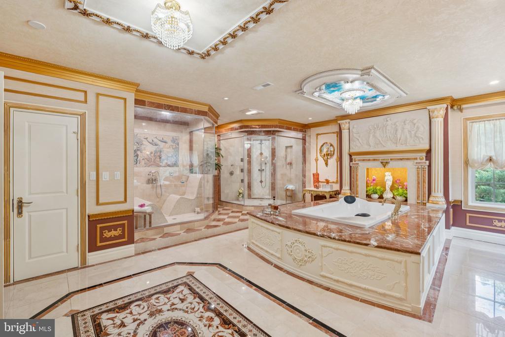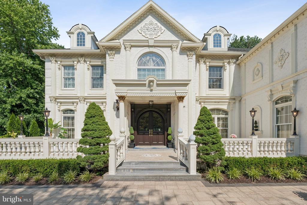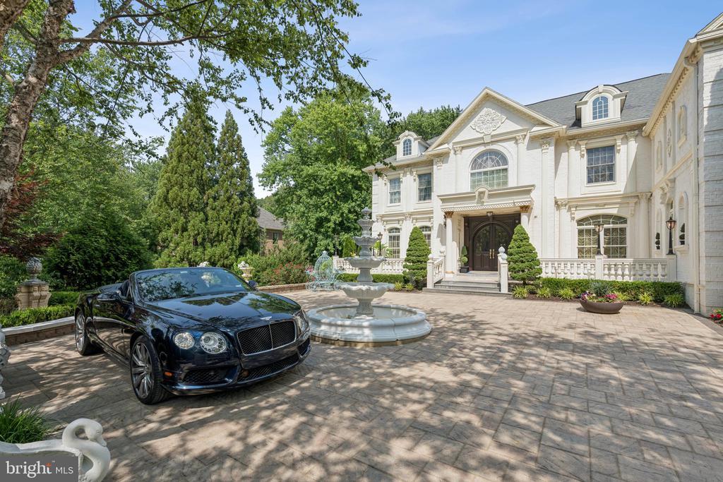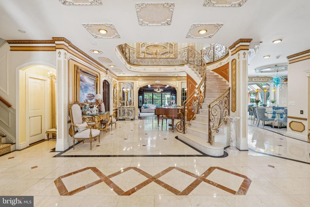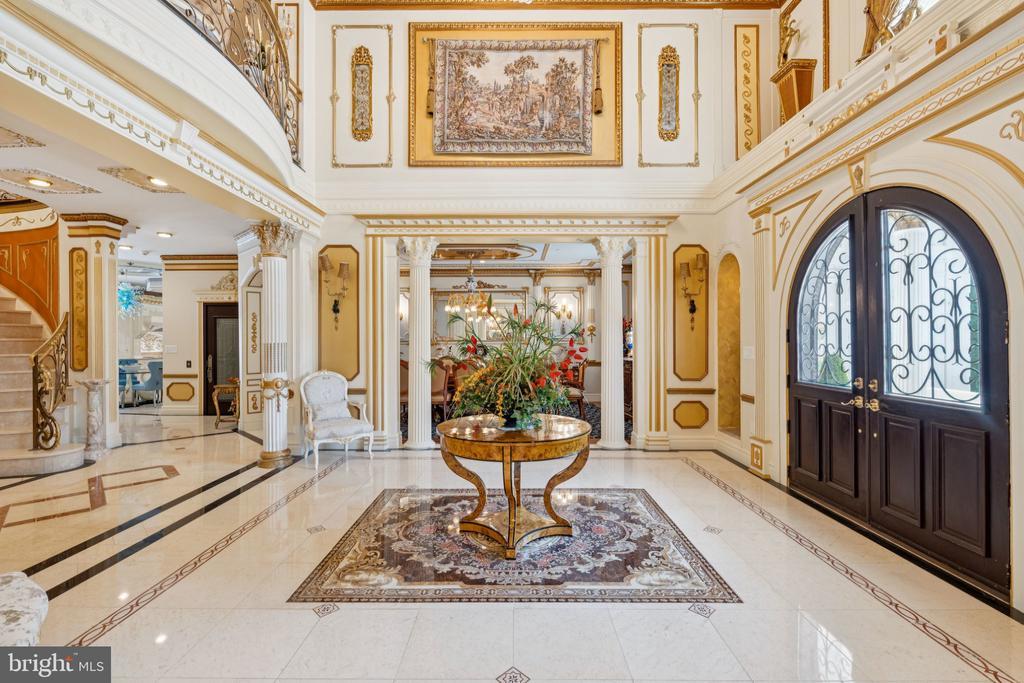 Exquisite artistry, quality craftsmanship, and a touch of glamour combine in this spectacularly appointed 11,000+ sq. ft. manor, set on .89 lush acres. Sited near the Potomac River and moments from the quaint shops and fine dining of Great Falls village, this impressive estate showcases luxurious living at every turn. A grand marble foyer sets the tone, with lighted recesses, gold-gilded trim, and sweeping views of the home’s richly designed interiors. The formal living and dining rooms feature antique mirrors, crystal chandeliers, intricate ceiling medallions, and decorative hardwood floors with inlaid wool carpeting. At the heart of the main level, a breathtaking reception area rises two stories, offering an ambiance of elegance and exceptional detail. The richly paneled library is clad in hardwood and features a fossil-stone granite wall with built-ins and fireplace. A coffered-ceiling drawing room includes 11 glass showcases—perfect for art or collectibles. Nearby, a bright music room with bamboo flooring and iron chandelier offers quiet refuge. The chef-caliber gourmet kitchen impresses with an 8x5 ft. “Louise Blue” granite island and premium appliances. A granite breakfast bar and informal dining area complete the kitchen. Adjacent, a vaulted solarium with bamboo ceiling and French doors opens to expansive decks and lawns, ideal for indoor-outdoor entertaining. Additional amenities on this level include a paneled elevator, pantry, butler’s pantry with copper sink, mud room, and direct access to the 4-car garage. Upstairs, the opulent owner’s suite is a private sanctuary that features a tray ceiling, Brazilian cherry flooring with a 100% wool inlay rug, and a cozy sitting area with silk carpet before a marble fireplace and media screen. A morning kitchen offers private refreshment. The walk-in gallery closet is a boutique experience, with Thomasville cabinetry, center Travertine island, cedar-lined wardrobes, and chandelier-lit tray ceiling. The spa-like primary bath stuns with a central soaking tub before an electric fireplace, dual vanities with 24k gold-gilded sinks, media-screen mirror, and a separate commode room with decorative vanity. Glass-enclosed steam and marble showers, stone seating, and mosaic tilework complete the indulgent space. Three additional bedroom suites each feature designer bathrooms and walk-in closets. A full laundry room with LG washer/dryer and whirlpool sink completes the upper level. The lower level embraces a sleek, club-like vibe. Descend via curved staircase with leopard-print carpet to a modern lounge featuring a golf simulator, lighted mosaic bar, billiards area, and expansive rec room—ideal for lively entertaining. A dramatic home theater, entered through a historic Hotel Washington door flanked by theater masks, includes a custom wool carpet medallion, three-tier leather seating, granite bar, and immersive surround sound. Also on this level: a 5th bedroom with spa bath, sauna and steam shower; a Tuscan-style wine cellar and tasting room with stone and granite walls; and a utility closet with stacked washer/dryer for guests or staff. Outdoor living is equally impressive. Walk out to a tiered granite terrace with a summer kitchen, built-in BBQ, and stone fireplace. A generous deck overlooks landscaped lawns and a newly built pool, plus a hot tub with recessed TV and radio—perfect for private relaxation or elegant entertaining.