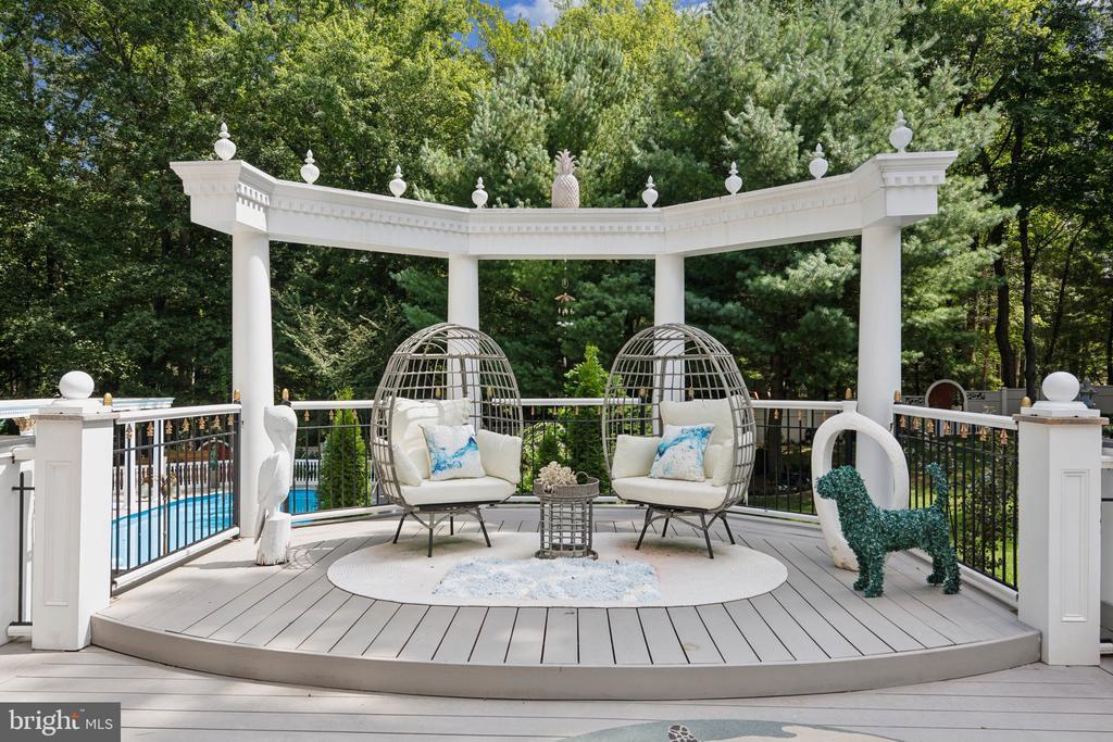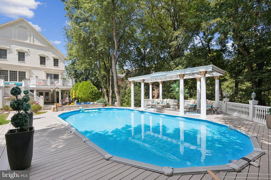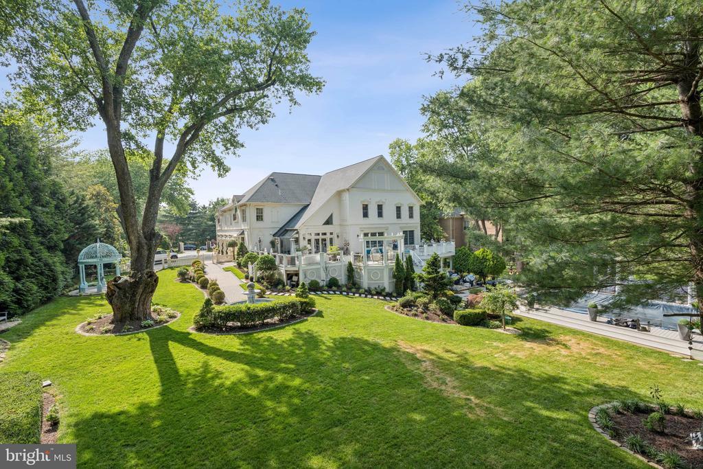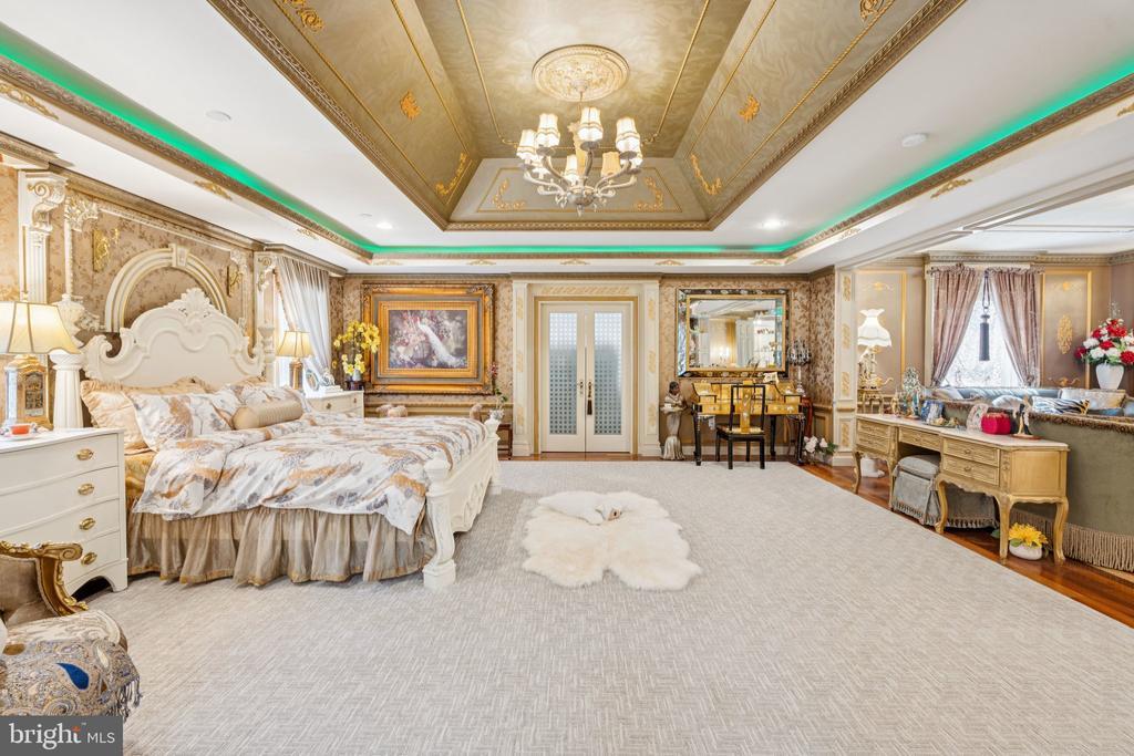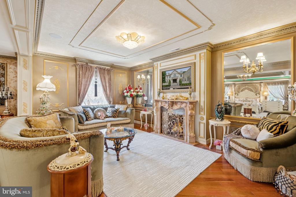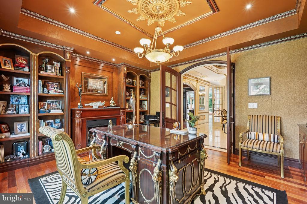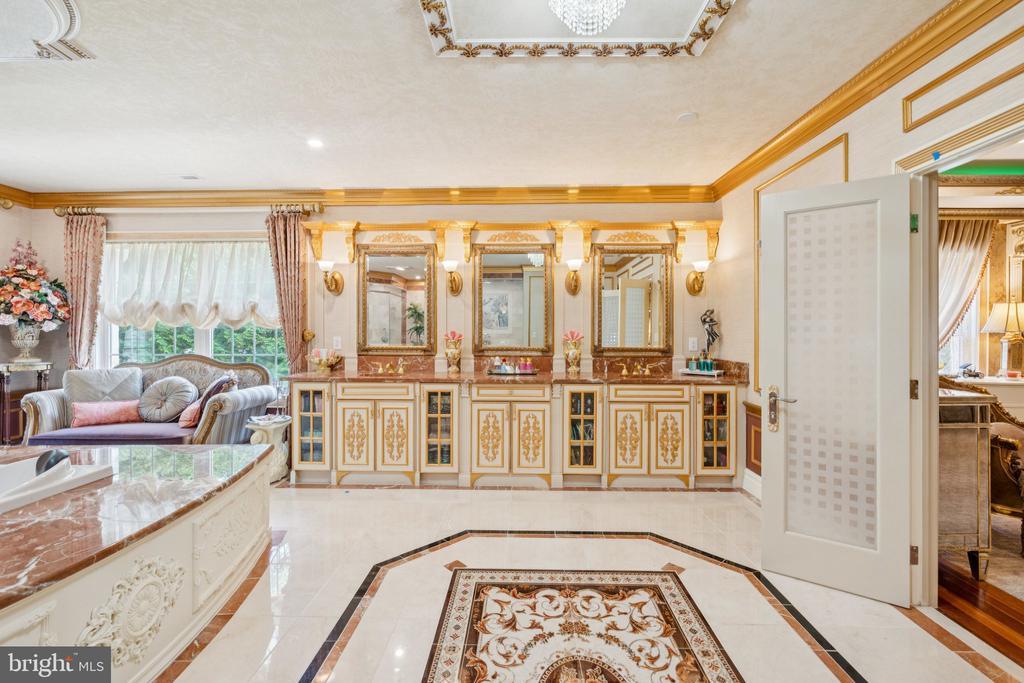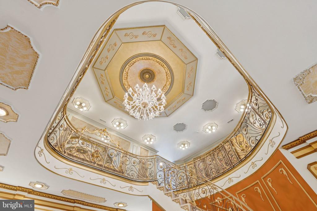 Exquisite artistry, quality craftsmanship, and a touch of glamour combine in this spectacularly appointed 11,000+ sq. ft. manor, set on .89 lush acres. Sited near the Potomac River and moments from the quaint shops and fine dining of Great Falls village, this impressive estate showcases luxurious living at every turn. A grand marble foyer sets the tone, with lighted recesses, gold-gilded trim, and sweeping views of the home’s richly designed interiors. The formal living and dining rooms feature antique mirrors, crystal chandeliers, intricate ceiling medallions, and decorative hardwood floors with inlaid wool carpeting. At the heart of the main level, a breathtaking reception area rises two stories, offering an ambiance of elegance and exceptional detail. The richly paneled library is clad in hardwood and features a fossil-stone granite wall with built-ins and fireplace. A coffered-ceiling drawing room includes 11 glass showcases—perfect for art or collectibles. Nearby, a bright music room with bamboo flooring and iron chandelier offers quiet refuge. The chef-caliber gourmet kitchen impresses with an 8x5 ft. “Louise Blue” granite island and premium appliances. A granite breakfast bar and informal dining area complete the kitchen. Adjacent, a vaulted solarium with bamboo ceiling and French doors opens to expansive decks and lawns, ideal for indoor-outdoor entertaining. Additional amenities on this level include a paneled elevator, pantry, butler’s pantry with copper sink, mud room, and direct access to the 4-car garage. Upstairs, the opulent owner’s suite is a private sanctuary that features a tray ceiling, Brazilian cherry flooring with a 100% wool inlay rug, and a cozy sitting area with silk carpet before a marble fireplace and media screen. A morning kitchen offers private refreshment. The walk-in gallery closet is a boutique experience, with Thomasville cabinetry, center Travertine island, cedar-lined wardrobes, and chandelier-lit tray ceiling. The spa-like primary bath stuns with a central soaking tub before an electric fireplace, dual vanities with 24k gold-gilded sinks, media-screen mirror, and a separate commode room with decorative vanity. Glass-enclosed steam and marble showers, stone seating, and mosaic tilework complete the indulgent space. Three additional bedroom suites each feature designer bathrooms and walk-in closets. A full laundry room with LG washer/dryer and whirlpool sink completes the upper level. The lower level embraces a sleek, club-like vibe. Descend via curved staircase with leopard-print carpet to a modern lounge featuring a golf simulator, lighted mosaic bar, billiards area, and expansive rec room—ideal for lively entertaining. A dramatic home theater, entered through a historic Hotel Washington door flanked by theater masks, includes a custom wool carpet medallion, three-tier leather seating, granite bar, and immersive surround sound. Also on this level: a 5th bedroom with spa bath, sauna and steam shower; a Tuscan-style wine cellar and tasting room with stone and granite walls; and a utility closet with stacked washer/dryer for guests or staff. Outdoor living is equally impressive. Walk out to a tiered granite terrace with a summer kitchen, built-in BBQ, and stone fireplace. A generous deck overlooks landscaped lawns and a newly built pool, plus a hot tub with recessed TV and radio—perfect for private relaxation or elegant entertaining.