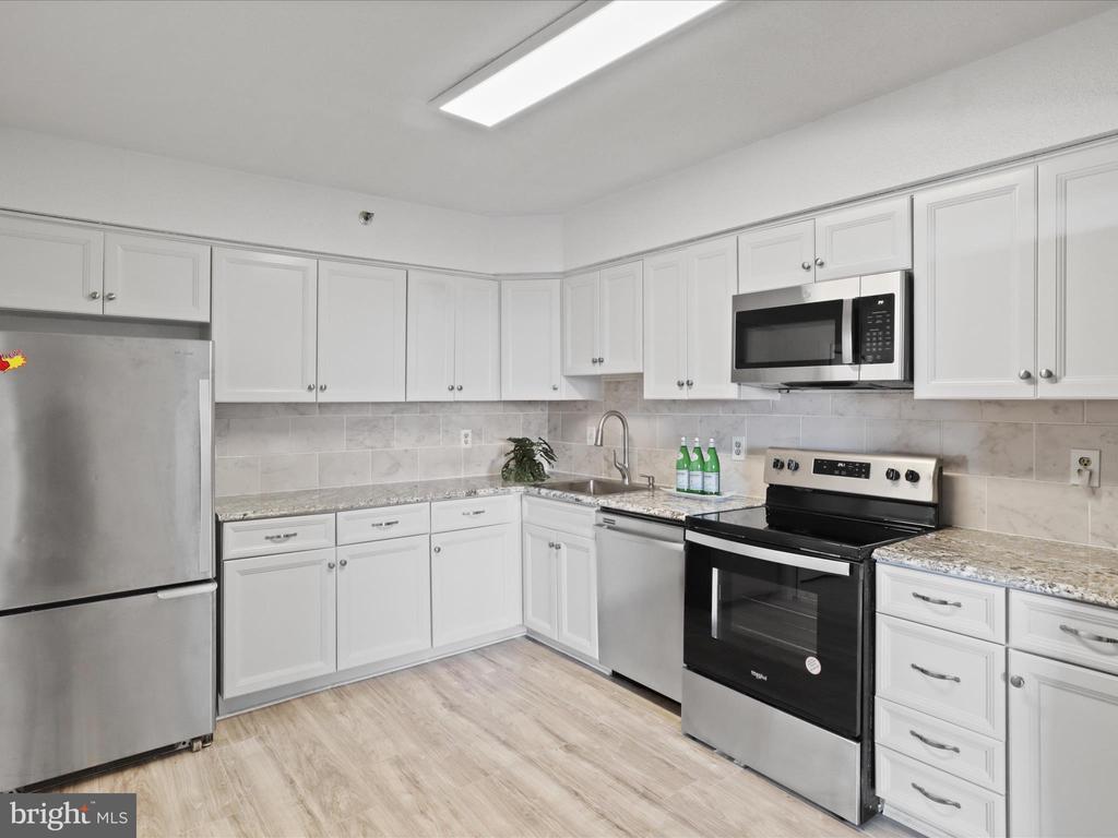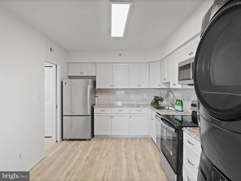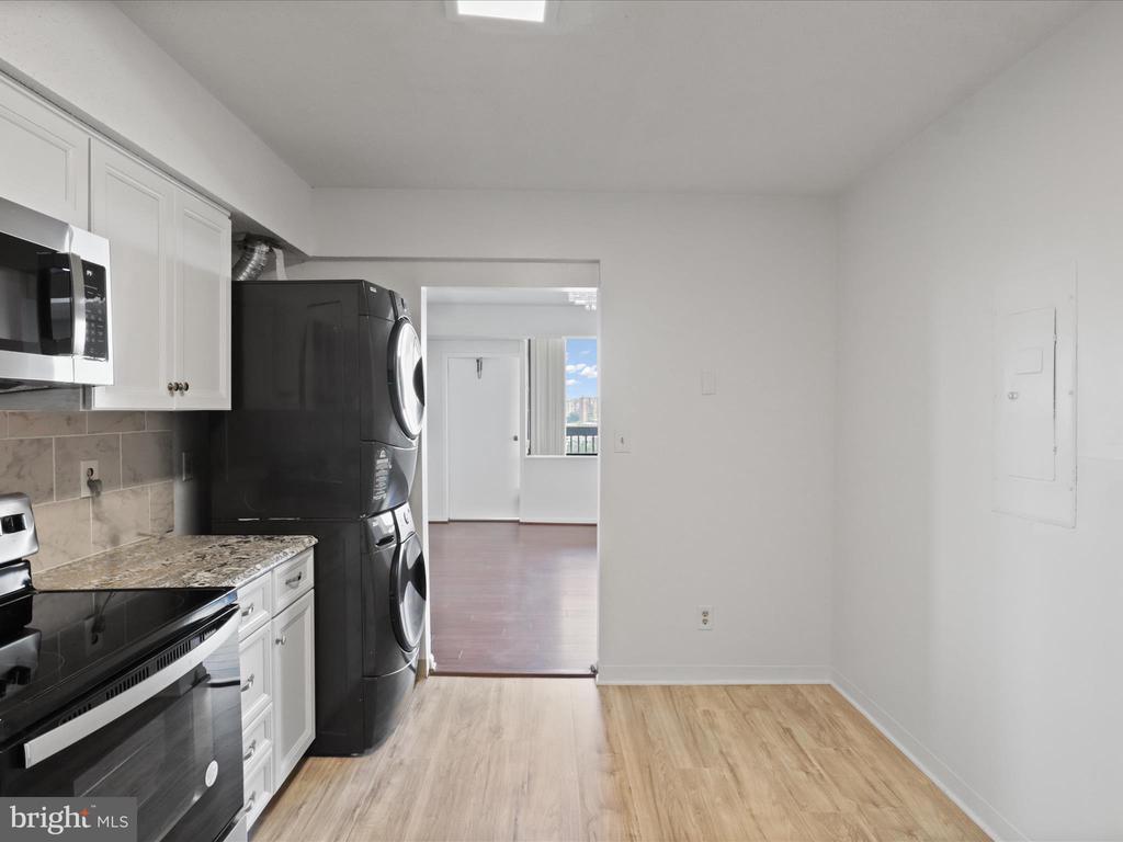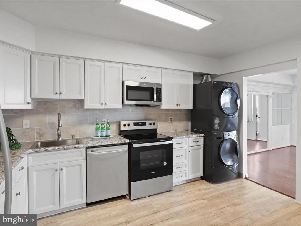 Dishwasher, Disposal, Dryer-front loading, Exhaust Fan, Microwave, Oven/Range-Electric, Refrigerator, Stove, Washer/Dryer Stacked