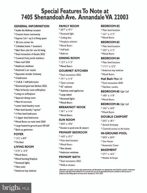 Welcome to this beautifully updated 6-bedroom, 3.5-bath, 2.5-level rambler nestled on a secluded 0.85-acre lot in sought-after Brook Hills Estates, an enclave of custom homes on large lots. This custom home offers the rare option of "one-level living." The huge main level (with no steps) features four spacious bedrooms and 2.5 bathrooms, a large family room with a cozy fireplace, a formal living room with its own fireplace, and a separate dining room. The expansive kitchen—completely renovated in 2022—includes a sunny eat-in area and offers both style and functionality. The upper level offers two additional bedrooms, a renovated full bath, as well as a generous closet and storage space. The lower level includes laundry, utility, and storage areas. Outside, enjoy a quiet street, a large circular driveway, a side-load double carport, and the Sun Room leads to a massive 50' x 20' heated in-ground pool—perfect for entertaining. The charming facade and covered front porch were added in 2022 & feature a metal roof, an arbor, and sitting areas, adding to the home's curb appeal. Recent updates include: *Kitchen renovation (2022) *All bathrooms renovated (2020) *New roof (2024). Conveniently located just inside the Beltway off Braddock Road, with easy access to I-495, I-395, and I-95. Only minutes from Tysons Corner, Fairfax Hospital, and the two new INOVA facilities. Please see photos, floor plans & survey/plat in photos and document sections! Open House Sunday Nov 9th from 1-4 pm!