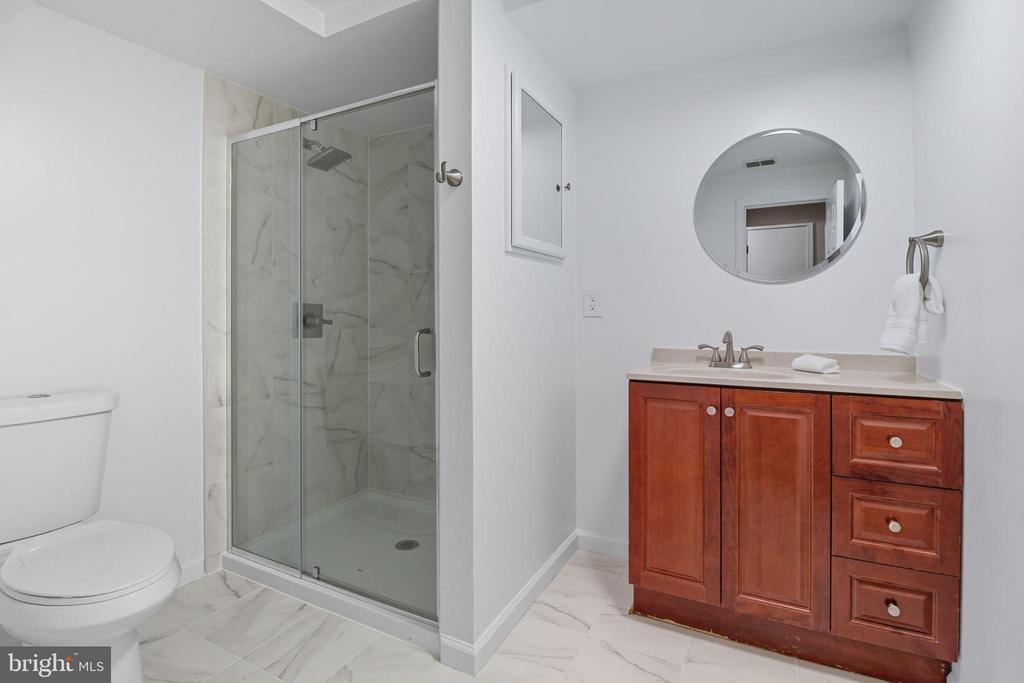 Stall Shower, Carpet, Entry Lvl BR, Master Bath(s), Upgraded Countertops, Wood Floors