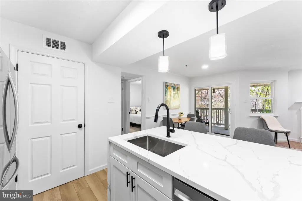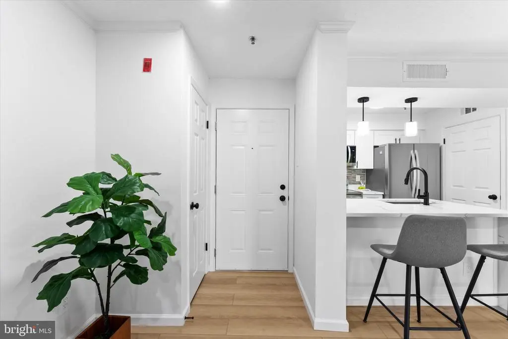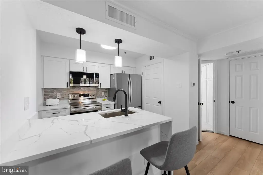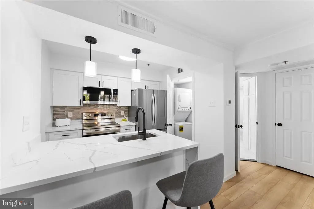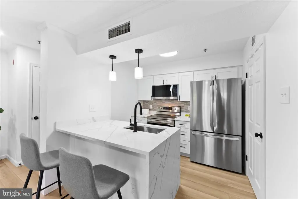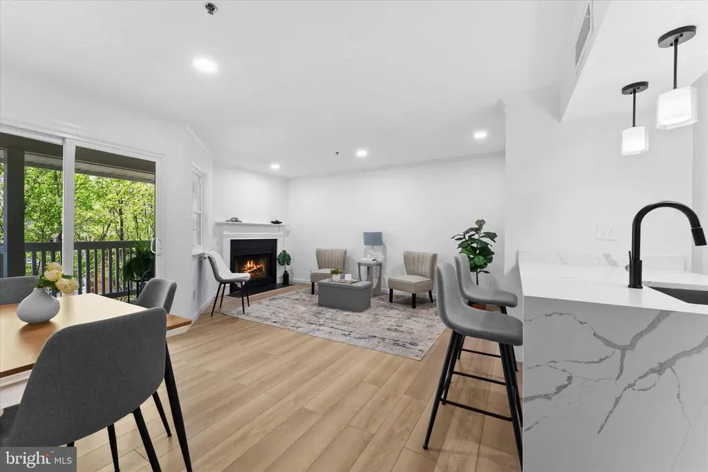 Experience elevated living in this completely remodeled penthouse-level residence at The Fountains at McLean. The heart of the home is a stunning, open-concept kitchen featuring waterfall-edge quartz countertops, ambient LED lighting, and top-of-the-line energy-efficient stainless-steel appliances. The expansive bedroom is a serene retreat, bathed in natural light and featuring a generous walk-in closet. The spa-inspired bathroom is fully upgraded with a contemporary vanity and a luxe glass walk-in shower. Elegant new hardwood flooring flows seamlessly throughout the freshly painted interior, while a cozy wood-burning fireplace adds warmth and charm. Additional features include a dedicated laundry room, ample storage, and an impressive oversized balcony offering tranquil courtyard views—perfect for relaxing or entertaining. Enjoy the ease of single-level living in a secure building with exceptional amenities, including a resort-style pool, hot tub, sauna, fitness center, and a stylish clubhouse. This residence includes an assigned garage parking space (#163) along with a guest parking pass. Unrivaled location—just steps from world-class shopping, dining, and entertainment of Tysons Corner. Less than a mile to the Silver Line’s Spring Hill Metro Station, ensuring effortless access to the entire D.C. metro area.
