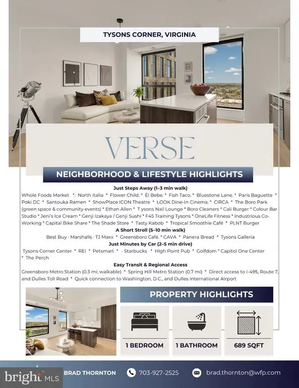 Experience modern luxury at VERSE, the premier condominium in The Boro Tysons. Built in 2019 by award-winning Shalom Baranes, Residence #1205 offers floor-to-ceiling windows with the buildings preferred view, an open-concept living/dining area, and a gourmet kitchen featuring sleek panel-front appliances, quartz countertops, a built-in microwave, cooktop, and refrigerator with ice-maker. Beautiful flooring throughout, a full-size washer/dryer with storage, a spacious bedroom, and an elegantly finished bath combine style and function. VERSE’s amenities rival the finest resorts: a 24-hour concierge, secure underground garage parking, Amazon Hub mailroom, and Bike storage room. Relax at the rooftop swimming pool, work out in the expansive fitness center with spa and virtual classes, or pamper your pup in the convenient pet spa/dog wash. Host gatherings in the chef’s catering kitchen or celebration space, unwind in private lounges, or enjoy the landscaped terrace with fire pits and grilling areas. For visiting guests, a beautifully appointed suite provides comfort and privacy. Step outside and discover The Boro’s walkable lifestyle—restaurants, bars, coffee shops, retail shops, and a movie theater surround the building. The largest Whole Foods in the region is in the 1st floor of the VERSE, making errands effortless. With a nearby Metro rail station is a 6 minute walk and quick access to Route 7, commuting into D.C. or across Northern Virginia is seamless. VERSE #1205 offers not just a home, but a complete lifestyle in the heart of Tysons.