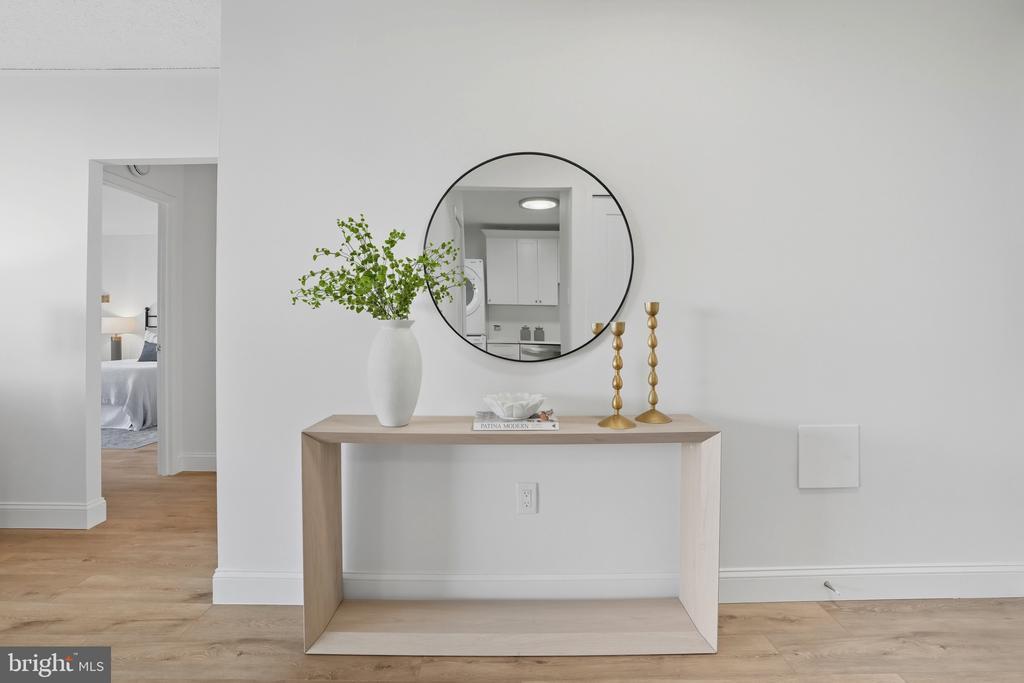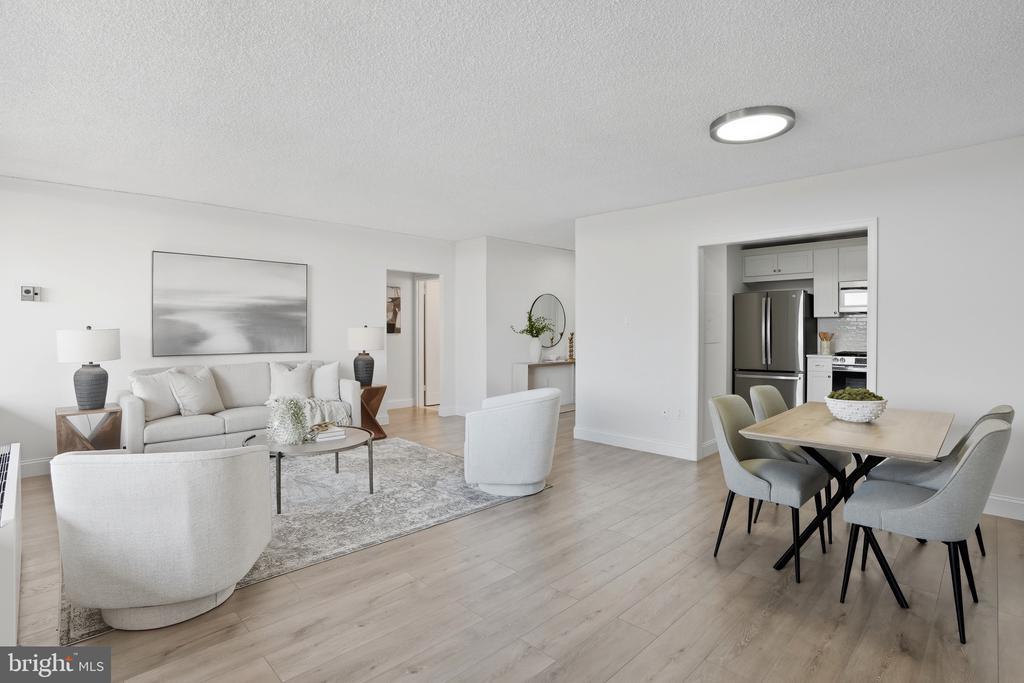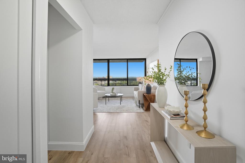 Welcome to Skyline Plaza! This is a rare opportunity to own a large, fully updated 1-bedroom, 1-bath with garage parking (#034N on B1) and storage bin (#254N on B1-Room1) condo on the 15th floor of one of Falls Church’s most sought-after communities. Perched high above the city, this residence offers spectacular, unobstructed views from your private balcony—perfect for enjoying sunsets and even 4th of July fireworks. From the moment you enter, you’ll be greeted by expansive windows that flood the space with natural light and frame breathtaking vistas year-round. The unit boasts high ceilings, fresh paint, and gleaming light oak LVP flooring, creating an inviting, modern aesthetic. The open-concept floor plan seamlessly connects the living and dining areas with the gourmet kitchen, beautifully updated with granite countertops, subway tile backsplash, white shaker cabinets with brass nickel hardware, stainless steel appliances, gas cooking, and the convenience of an in-unit washer/dryer. The spacious bedroom features two closets, including a walk-in, while the lavish bath offers a granite-top vanity and a soaking tub. With ample storage throughout, this home combines style with practicality. Condo fees cover all utilities—gas, water, electricity—as well as garage parking and an additional storage unit. Skyline Plaza provides resort-style amenities, including an outdoor pool, fitness centers, saunas, rooftop terraces, party rooms, picnic areas, 24-hour concierge, and on-site shops and services (convenience store, hair salon, and dry cleaner). A shuttle bus to the Pentagon/Metro adds everyday convenience. Perfectly located within minutes of Shirlington, BRAC, Pentagon City, Amazon HQ2, West Alex, Ballston Quarter, Old Town Alexandria, and downtown DC, with easy access to I-395, I-495, and Reagan National Airport, this condo blends luxury living, a vibrant community, and unmatched convenience. Come experience Skyline Plaza—a community envisioned by Charles E. Smith to offer everything you need right at your doorstep.